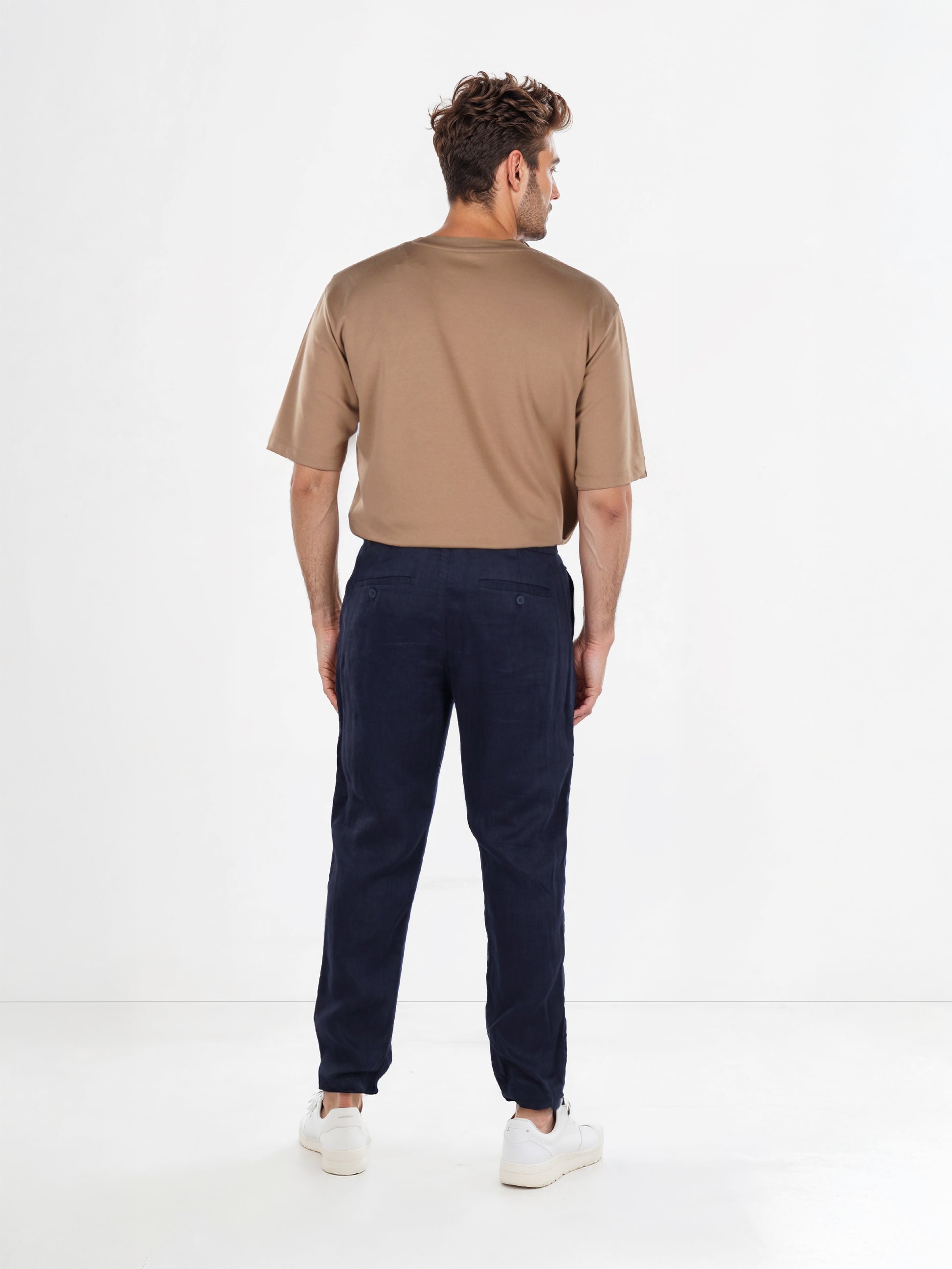 On hot days, meet your match. These navy blue linen trousers are what we like to call coolness without trying too hard. Lightweight, breathable, and smooth like your favorite playlist, these trousers are summer essentials with main character energy. The rich navy tone brings just the right amount of polish, while the relaxed regular fit comforts things. Whether you're headed to brunch, a beachside dinner, or just pretending to be productive, these trousers show up and show off. Pair them with a crisp linen shirt for an all-linen moment (very chic), or dress them down with a basic tee and slides. Basically, they’re your excuse to ditch jeans all season long. Stylish, breezy, and totally vibe-approved.