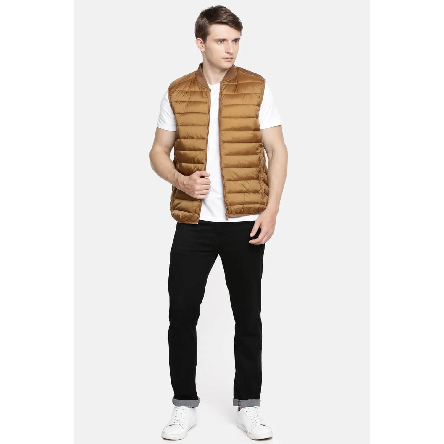 Wear a puffer jacket over a sweater for the ultimate functionality and practicality. The goal of this ensemble is to keep you warm and stylish. A pair of denim and white athletic shoes will complement the whole getup. This look can work well for both casual and semi-formal affairs.