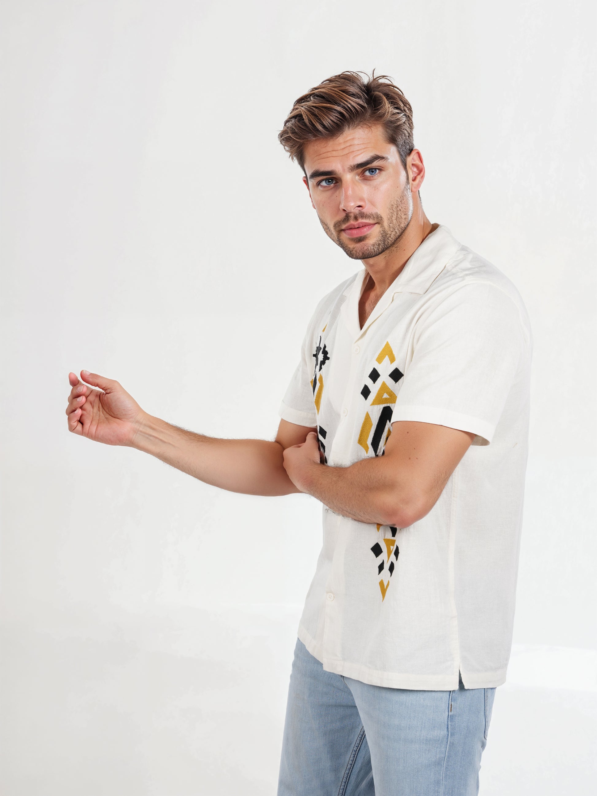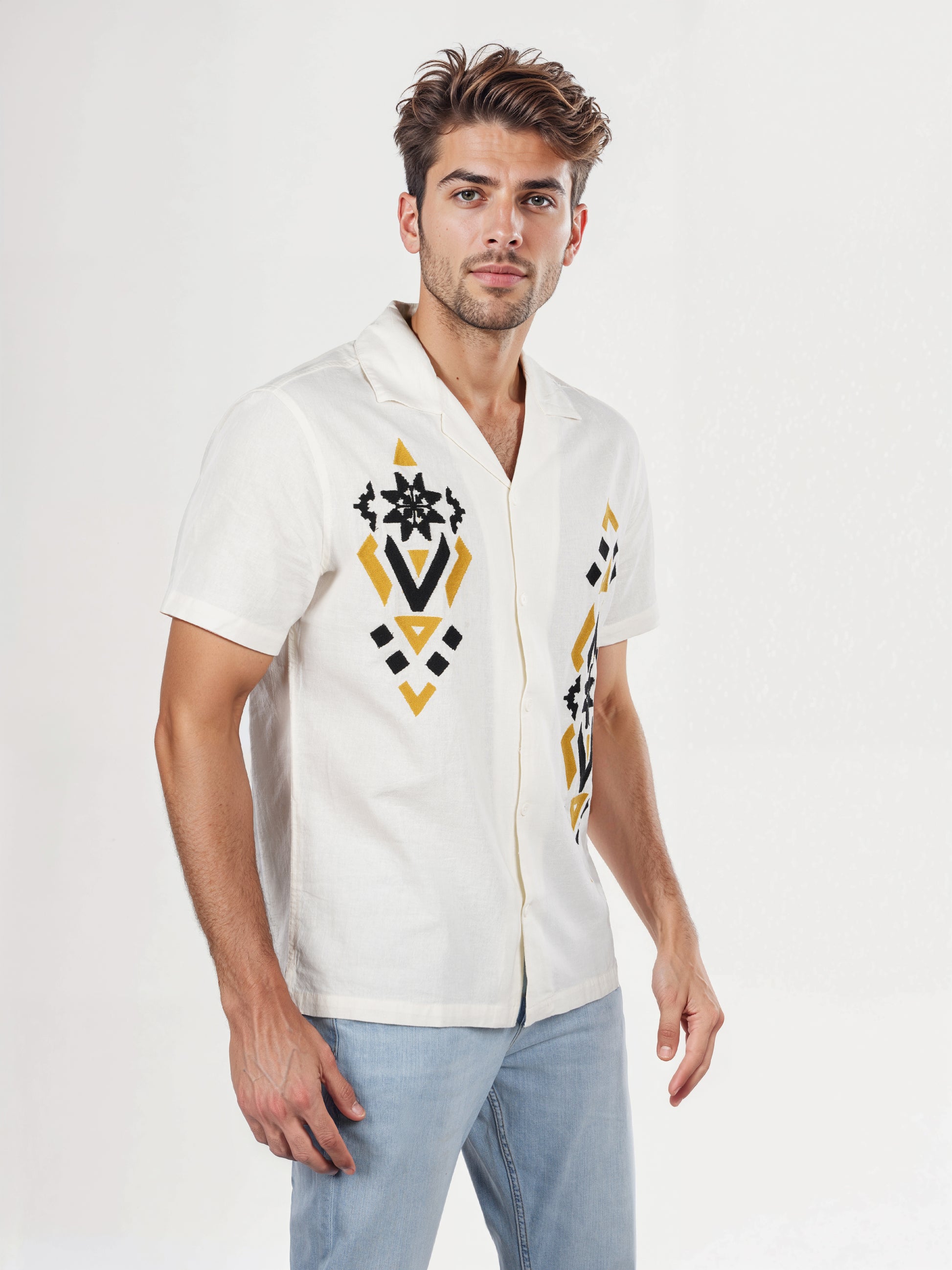 Date night calls for a look that’s equal parts suave and spontaneous, and this short-sleeved white linen shirt is totally bringing the charm. It’s breezy, effortlessly cool, and a little cheeky like you woke up fabulous without breaking a sweat. So, sip rooftop cocktails or stroll into a sunset in style. Maybe even unbutton that top button (just a little). Pair it with slim-fit chinos (roll those hems!), leather sandals or crisp white sneakers, and top it off confidently to be the best-dressed in any room you walk into. This isn't just a shirt; it's a mood. One that says you're easygoing, stylish, and ready to turn a casual dinner into a main character moment.