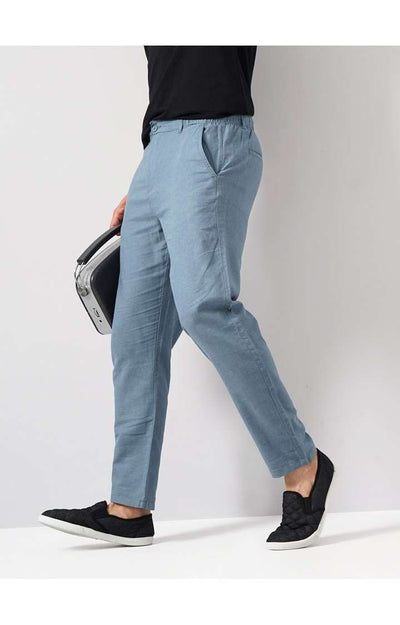 Celio Men Blue Solid Slim Fit Cotton-Linen-Blend Trousers