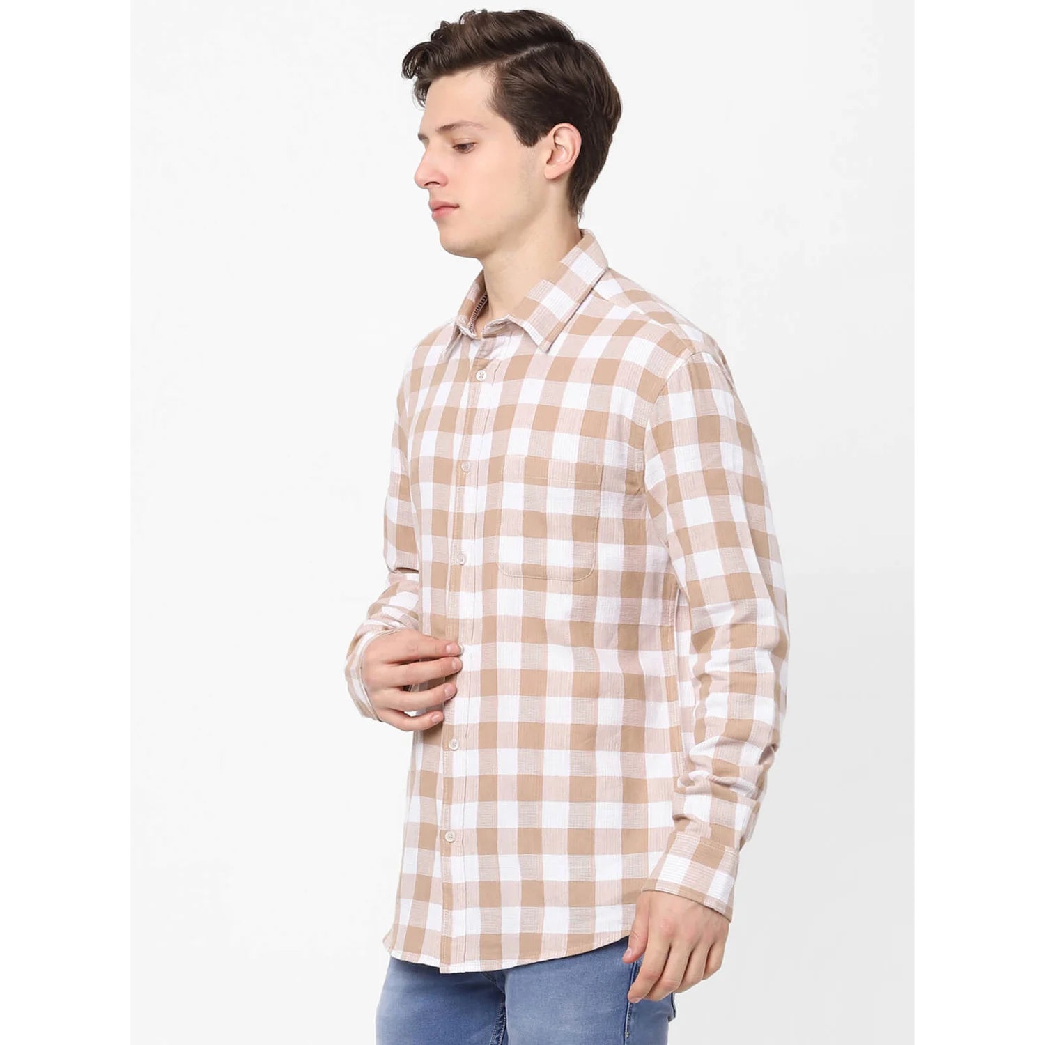 Celio* Men Beige Checked Regular Fit Cotton Shirts