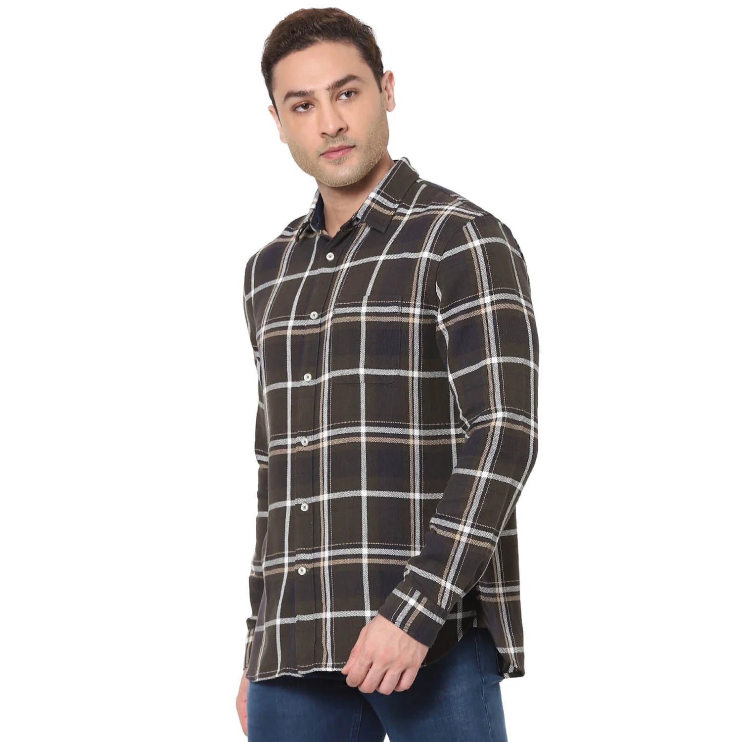 Celio* Checked Regular Fit Poly-Cotton Olive Shirt