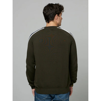 Celio* Men Olive Striped Regular Fit Cotton Sweaters