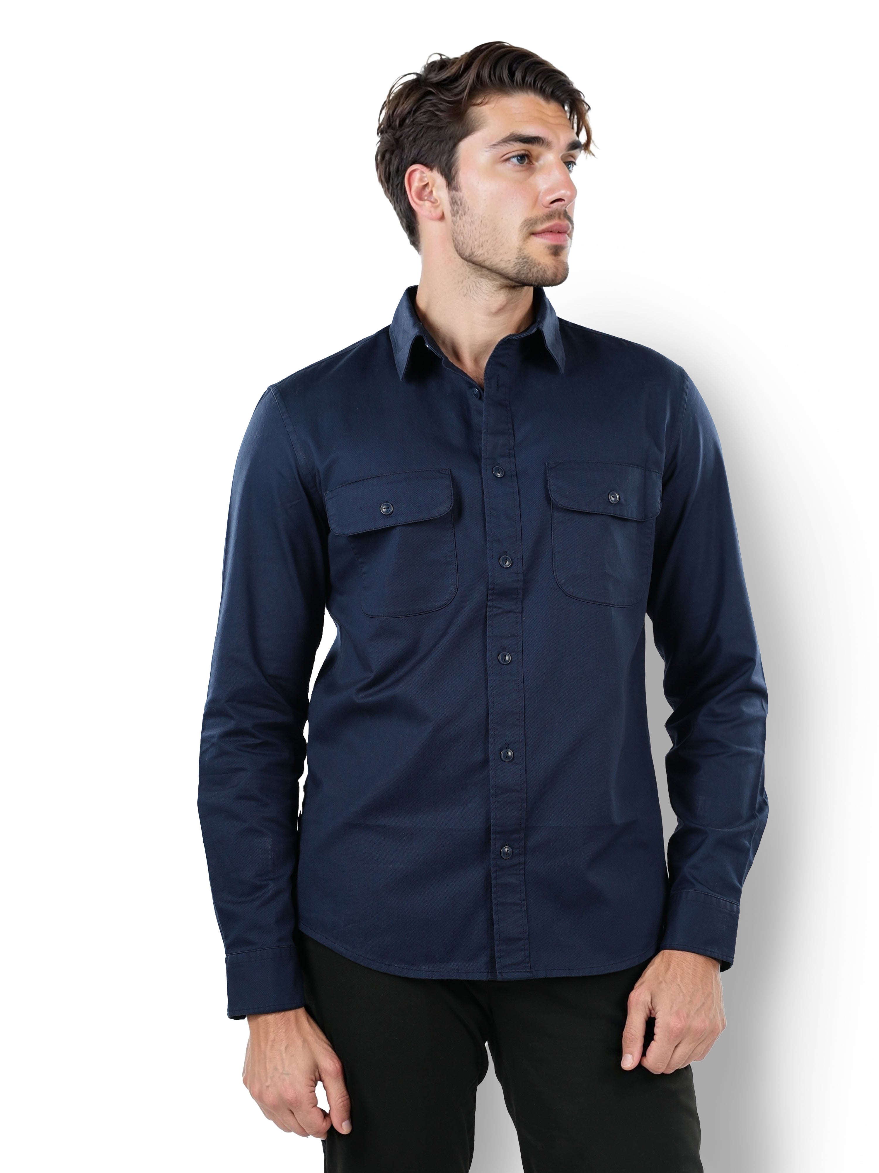 Celio* Men Navy Blue Solid Overshirt Cotton-Tencel-Blend Shirts