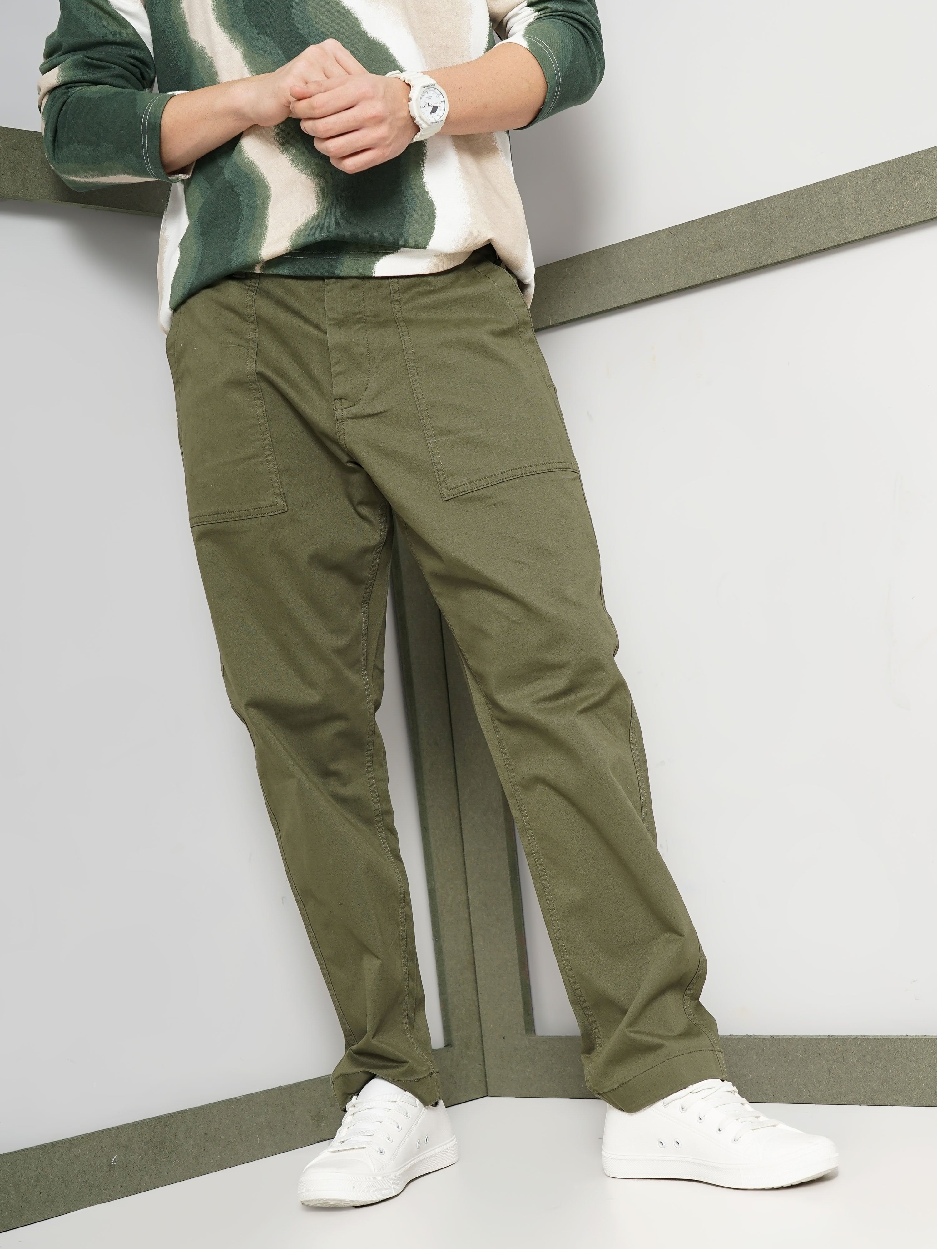 Celio Men Olive Solid Straight Fit Cotton Trousers