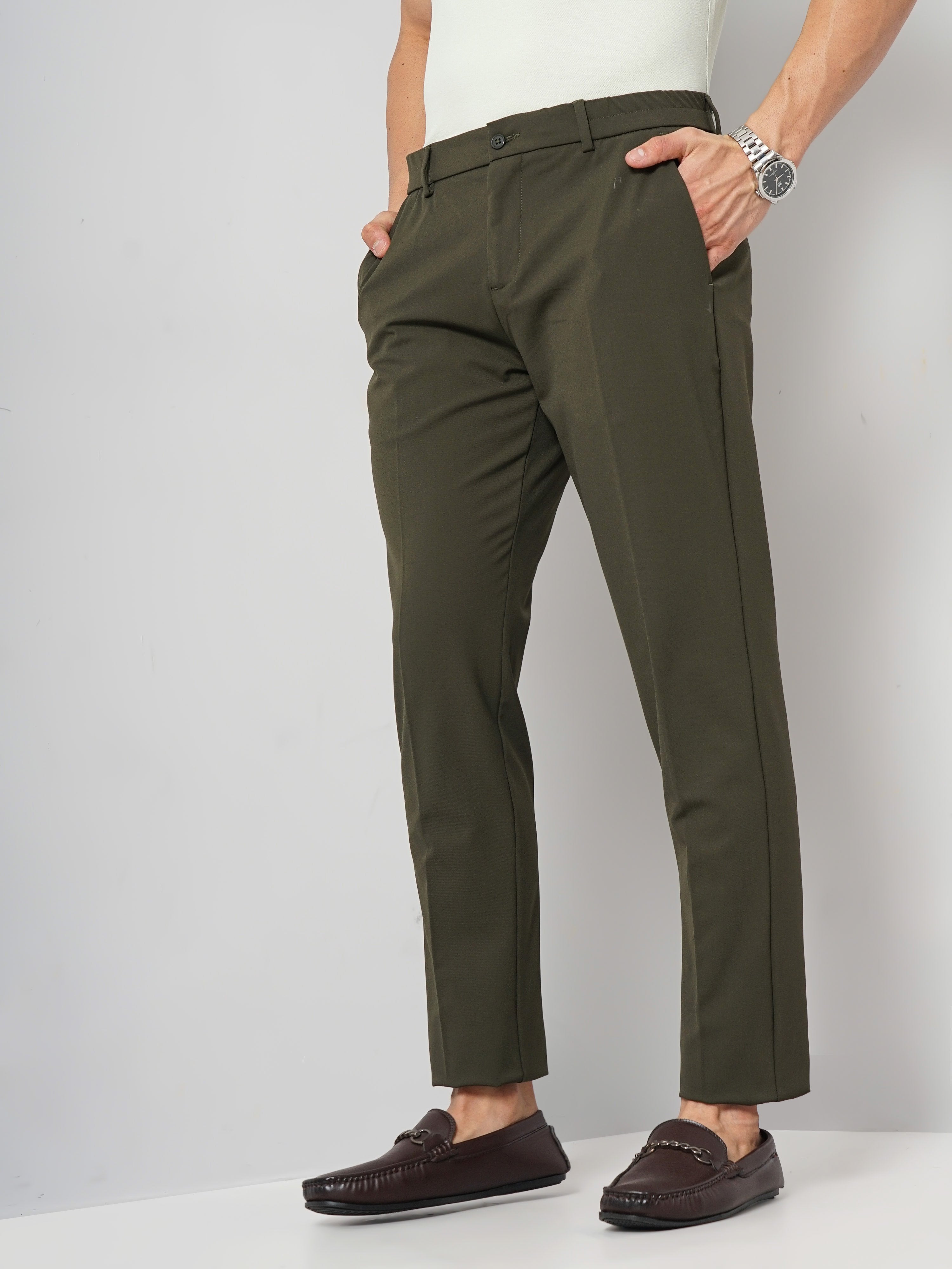 Celio Men Olive Solid Regular Fit Polyester-Blend Trousers