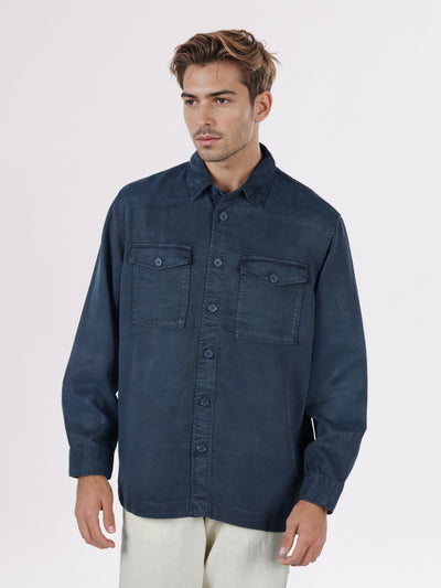 Celio* Men Navy Blue Solid Overshirt Cotton-Tencel-Blend Shirts