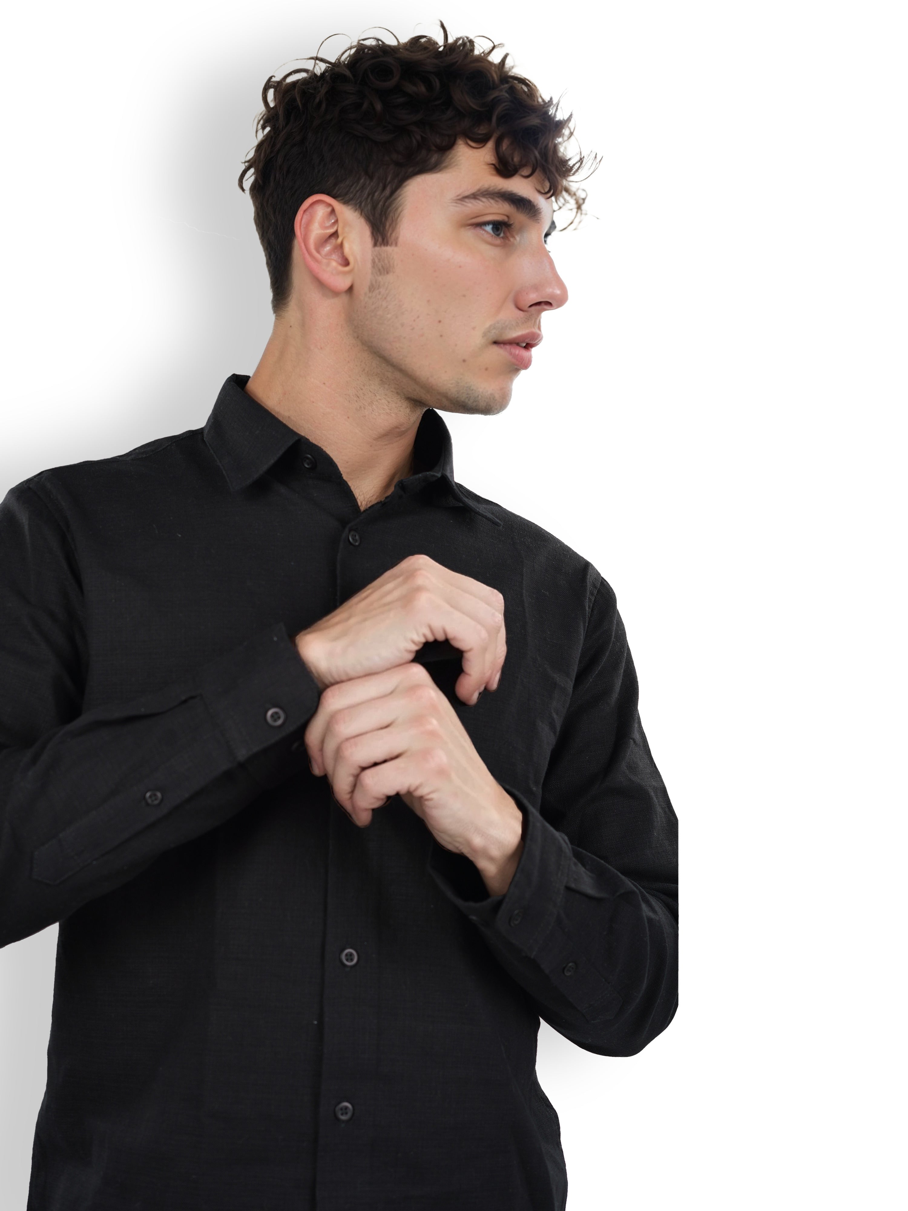 Celio* Embroidered Regular Fit Linen-Blend Black Shirts