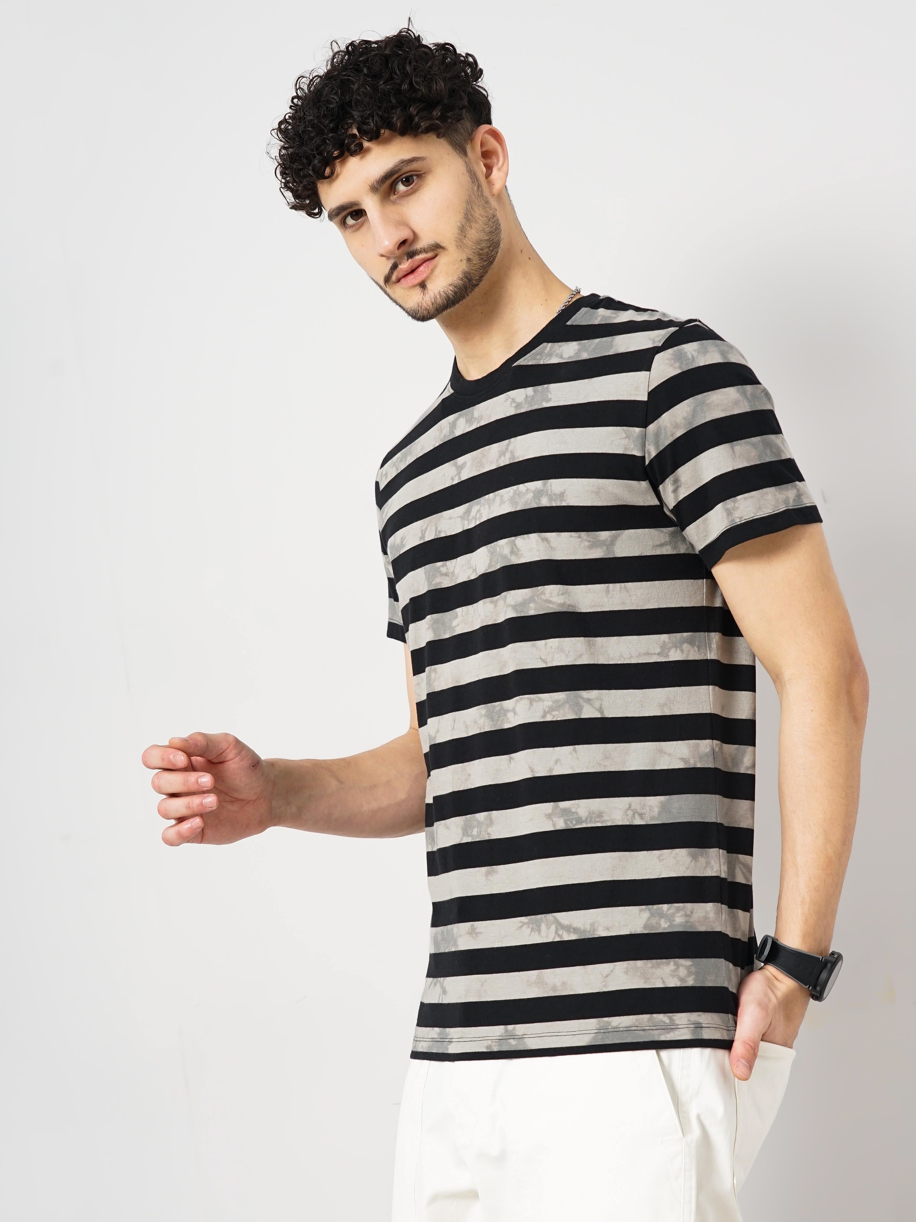 Celio* Striped Straight Fit Cotton Black T-Shirt