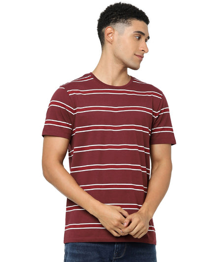Celio Men Burgundy Striped Regular Fit Cotton T-Shirts