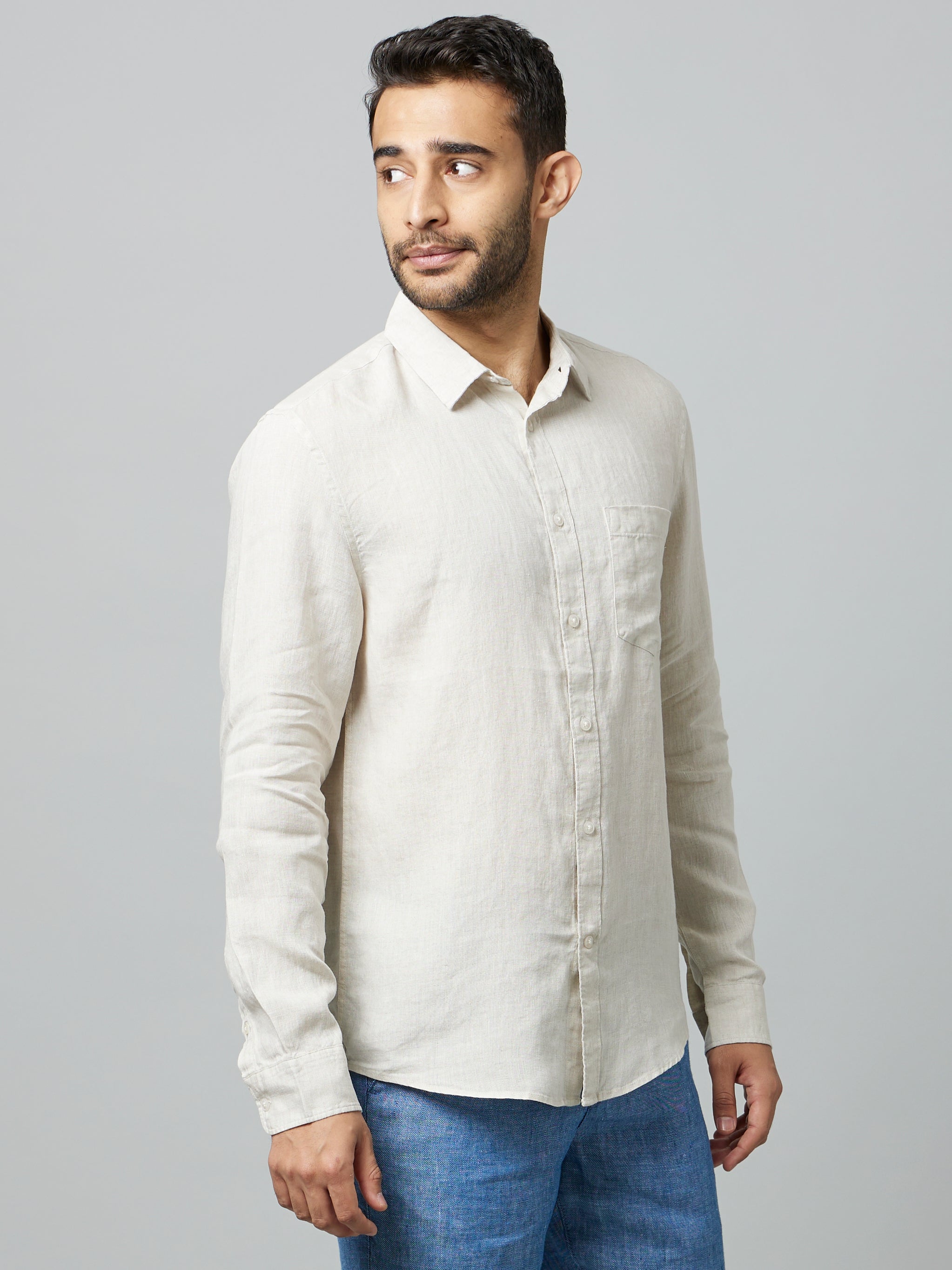 Celio* Solid Regular Fit Linen Beige Shirt