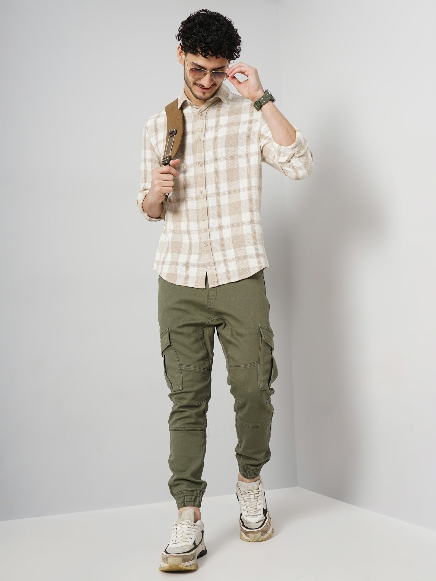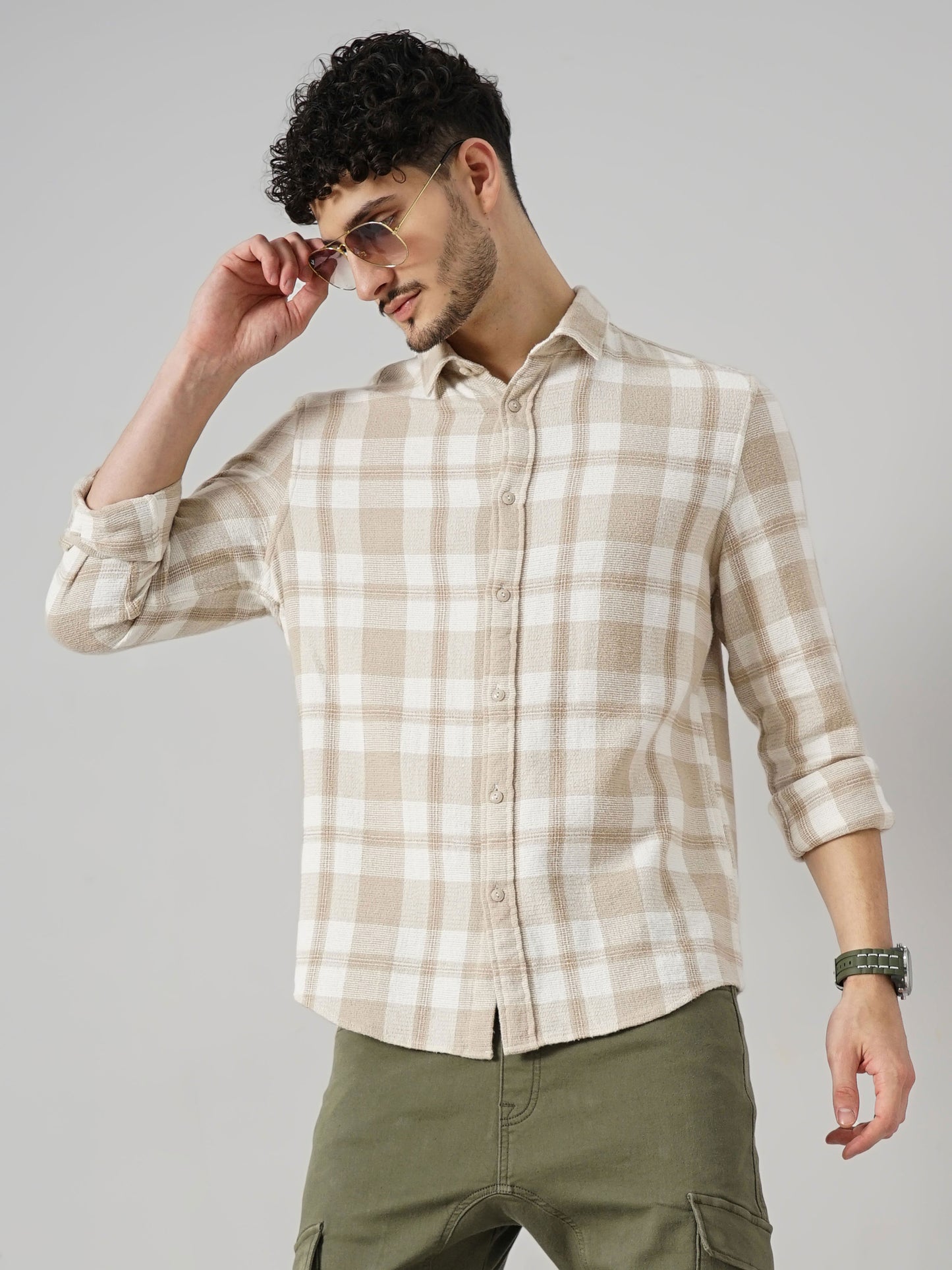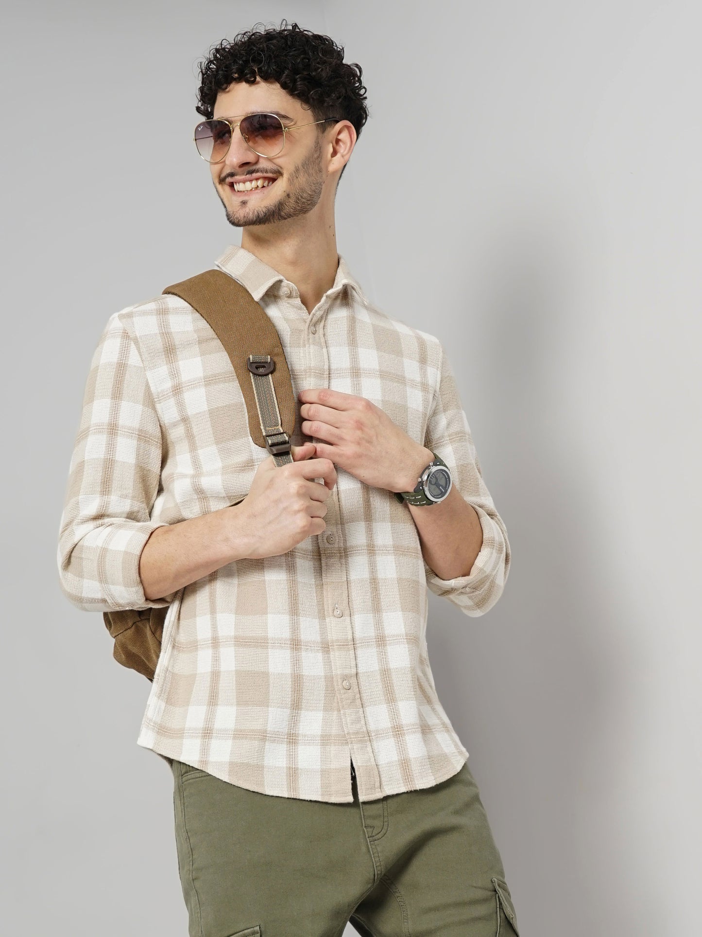 Discover the Celio Men Checked Regular Fit Cotton Casual Shirt in Beige. Designed for casual occasions, it features long sleeves and a comfortable cotton fabric for a stylish look. Disclaimer: All other items in the image are only for display purposes and will not be a part of the delivery content. Product colour may slightly vary due to photographic lighting sources. Country of Origin - India.