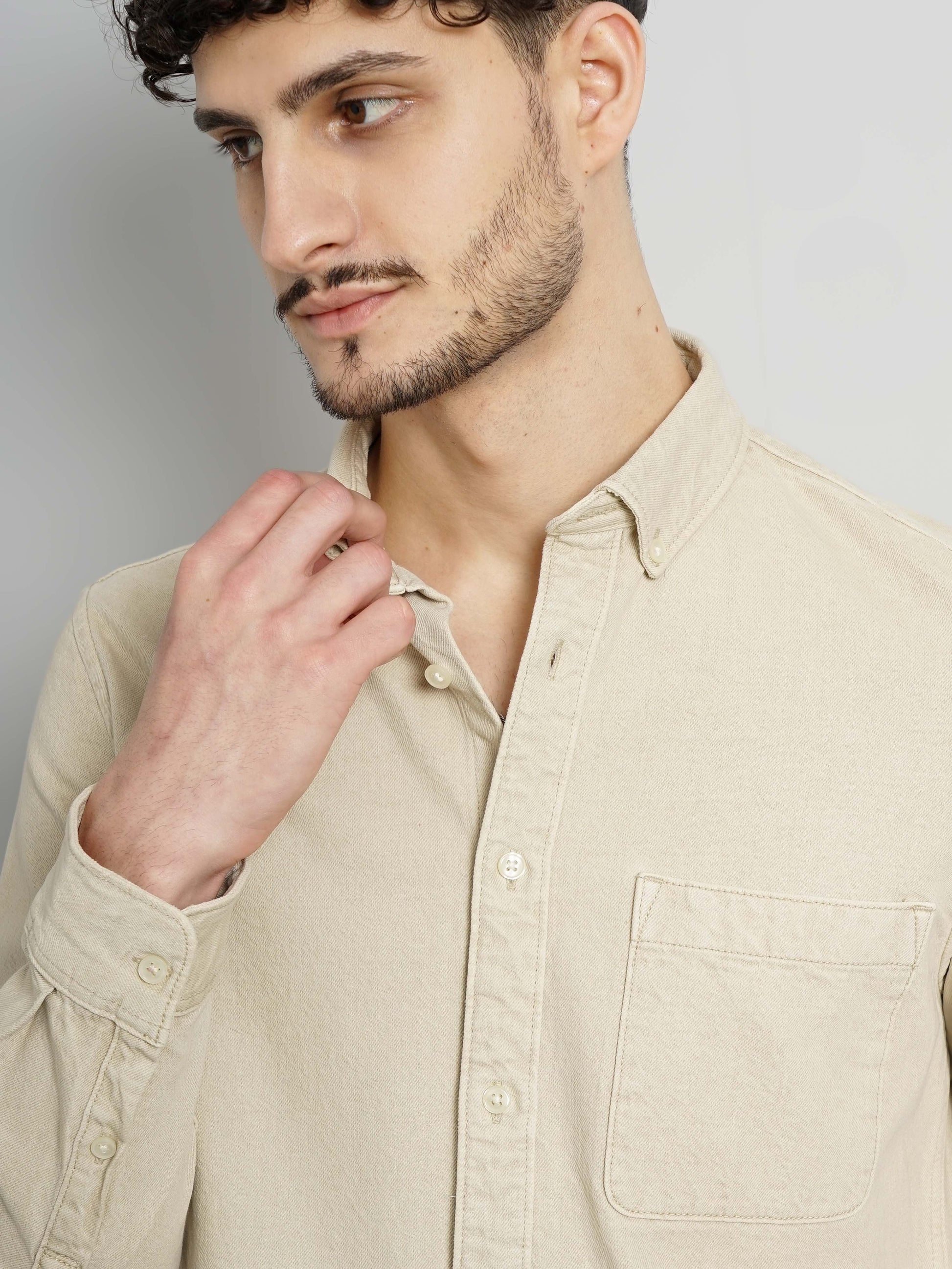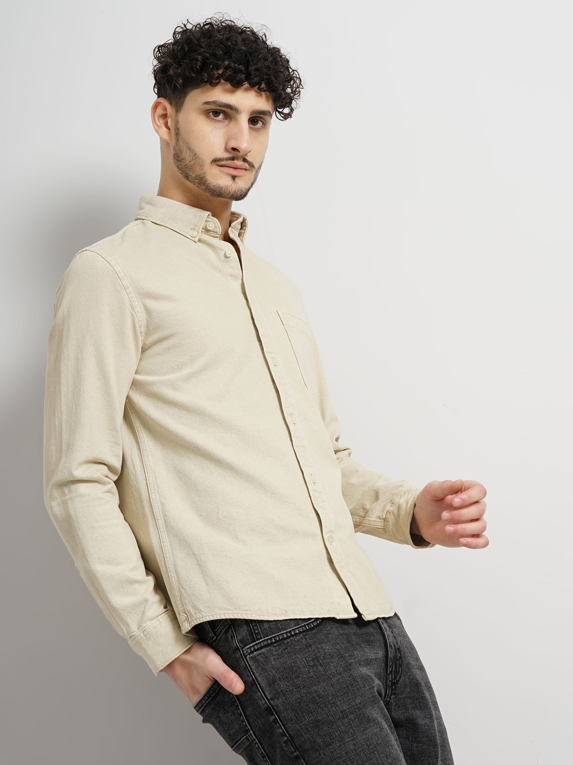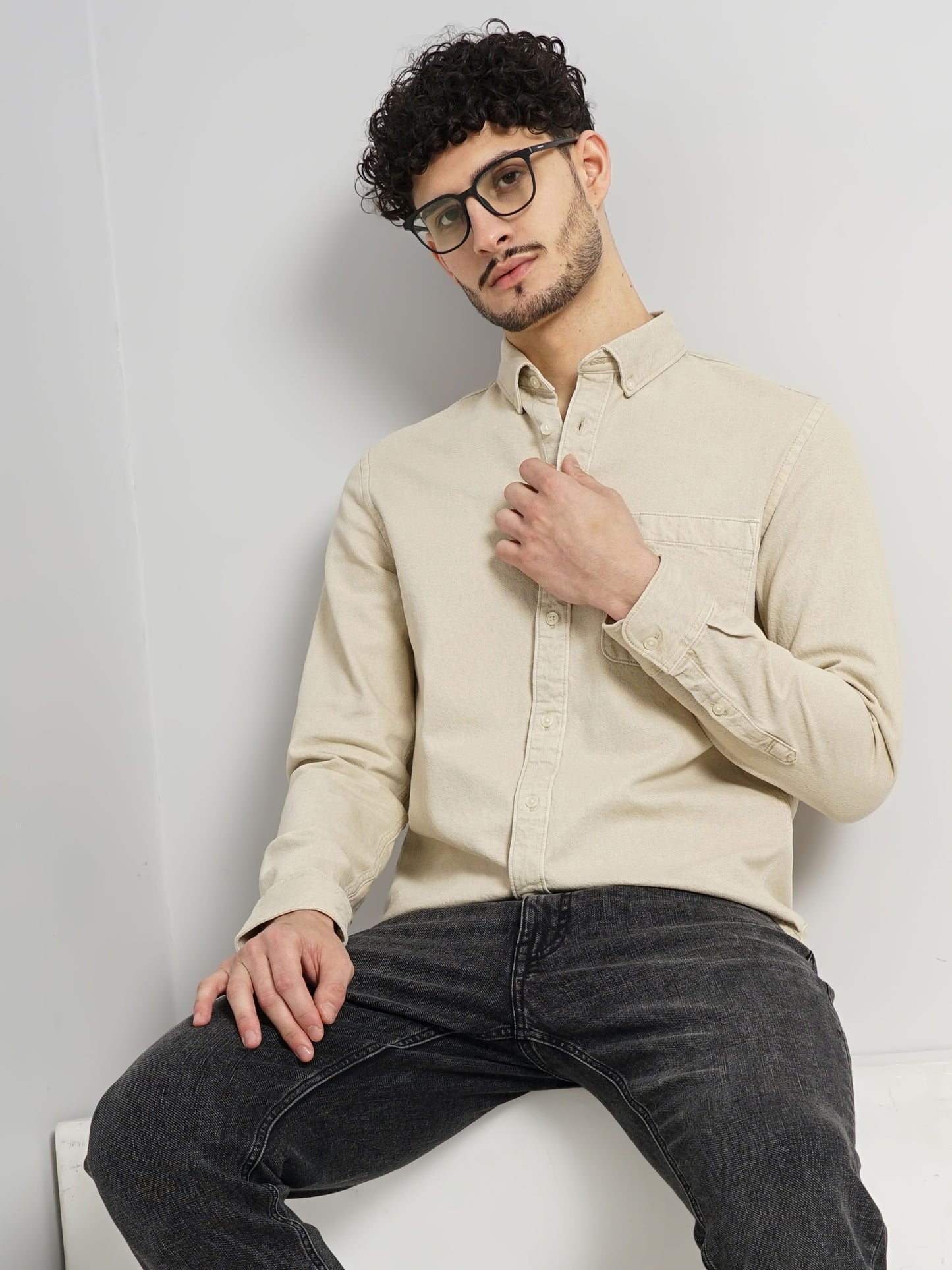 Elevate your casual look with the Celio Men Solid Oversized Cotton Over-Dyed Shirt in Beige. Made from soft cotton, it features long sleeves for a relaxed fit. Disclaimer: All other items in the image are only for display purposes and will not be a part of the delivery content. Product colour may slightly vary due to photographic lighting sources. Country of Origin - India.