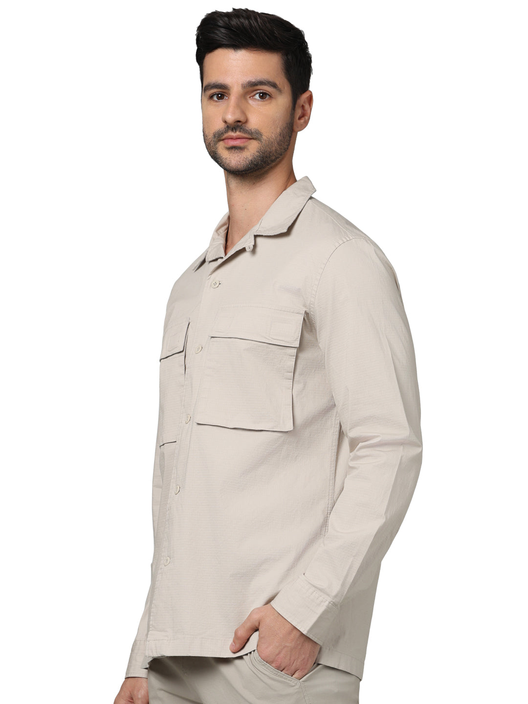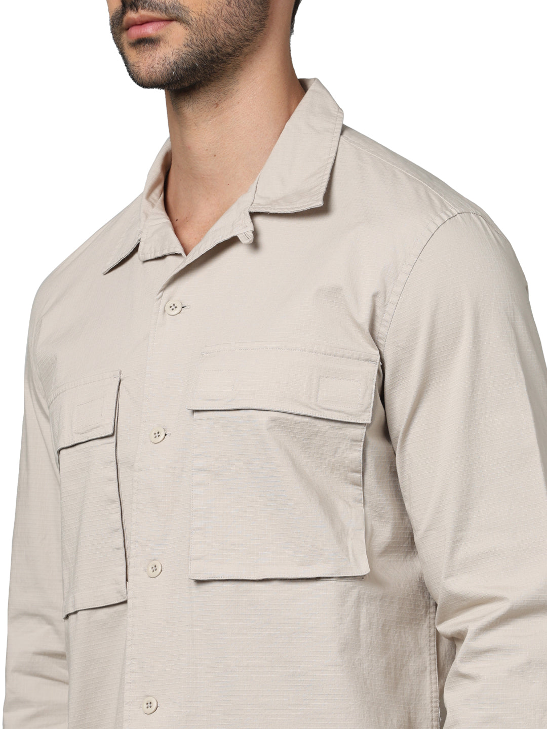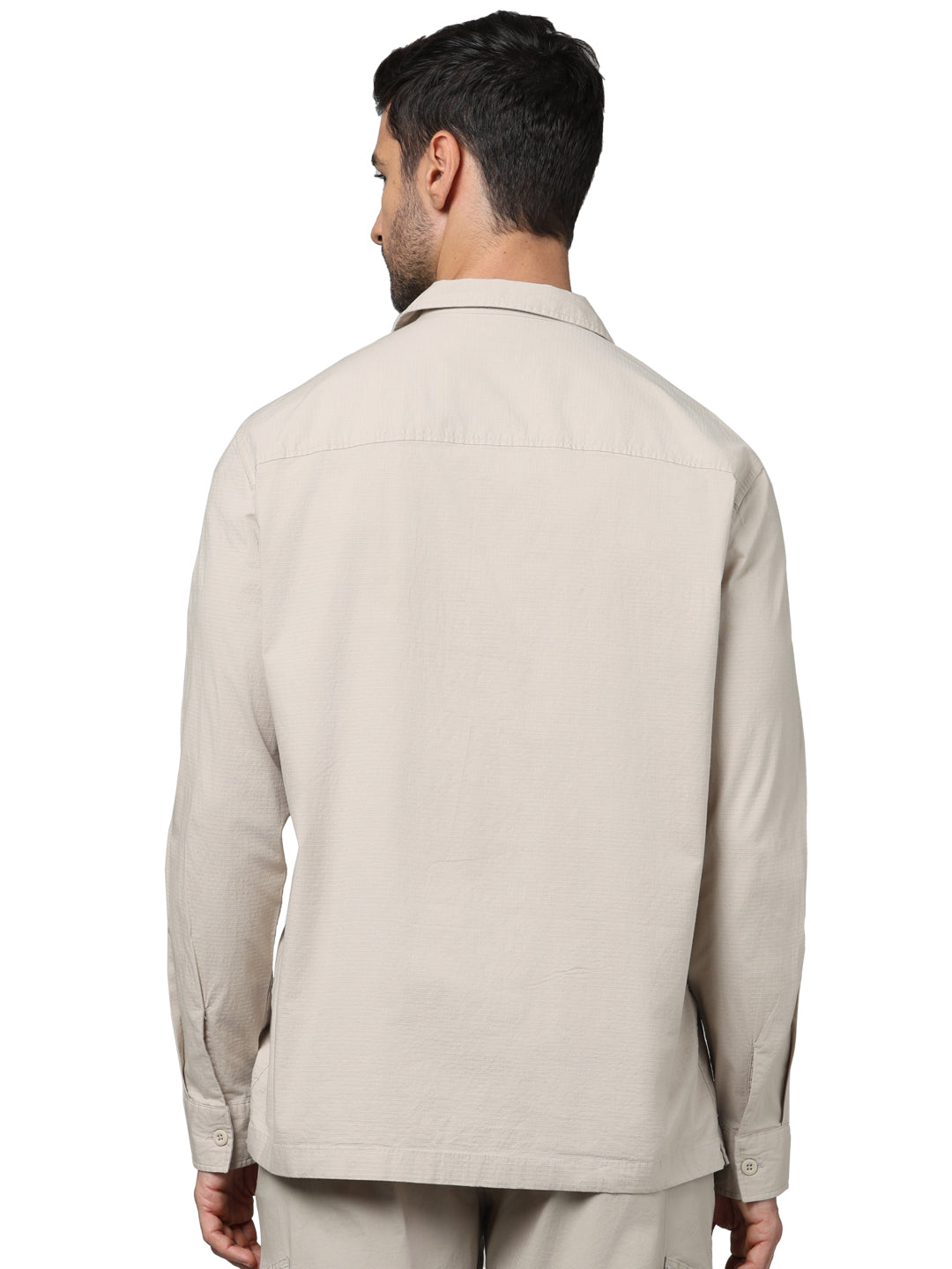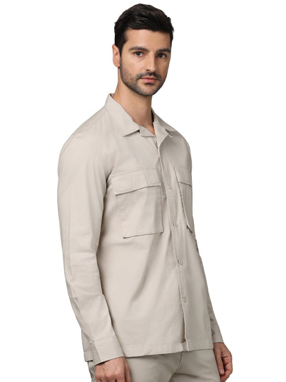 Stylish oversized beige shirt for men by Celio, crafted from soft cotton. Ideal for casual occasions, it features a spread collar and long sleeves for a comfortable fit. Disclaimer: All other items in the image are only for display purposes and will not be a part of the delivery content. Product colour may slightly vary due to photographic lighting sources. Country of Origin - India.