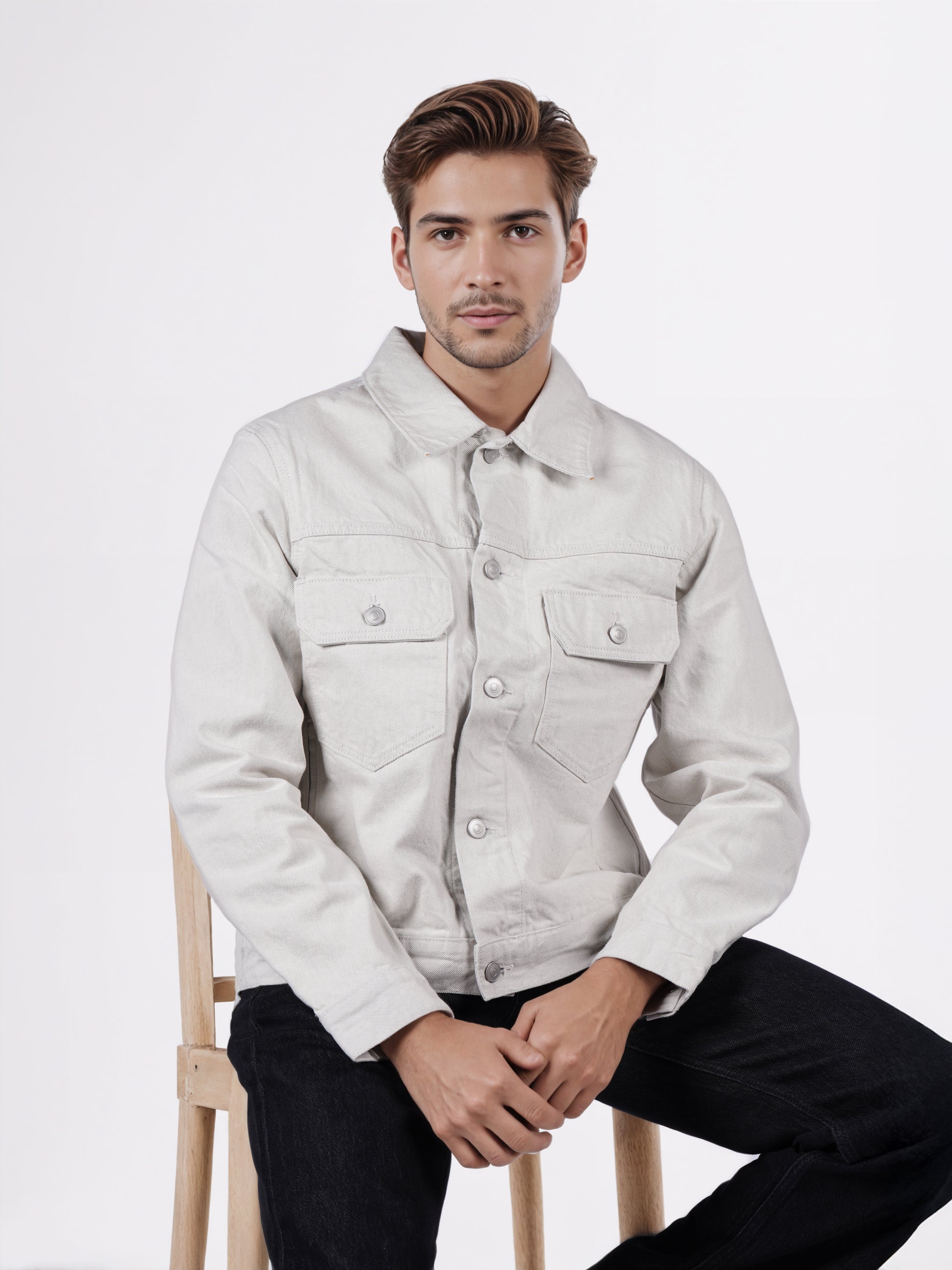 Stylish beige denim jacket for men by Celio, crafted from soft cotton. Designed for casual occasions, featuring long sleeves and a regular fit for comfort and versatility. Disclaimer: All other items in the image are only for display purposes and will not be a part of the delivery content. Product colour may slightly vary due to photographic lighting sources. Country of Origin - India.