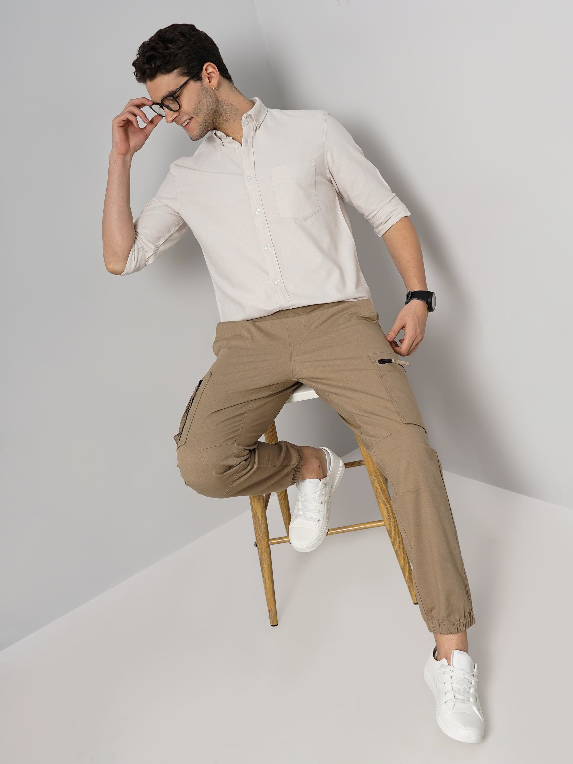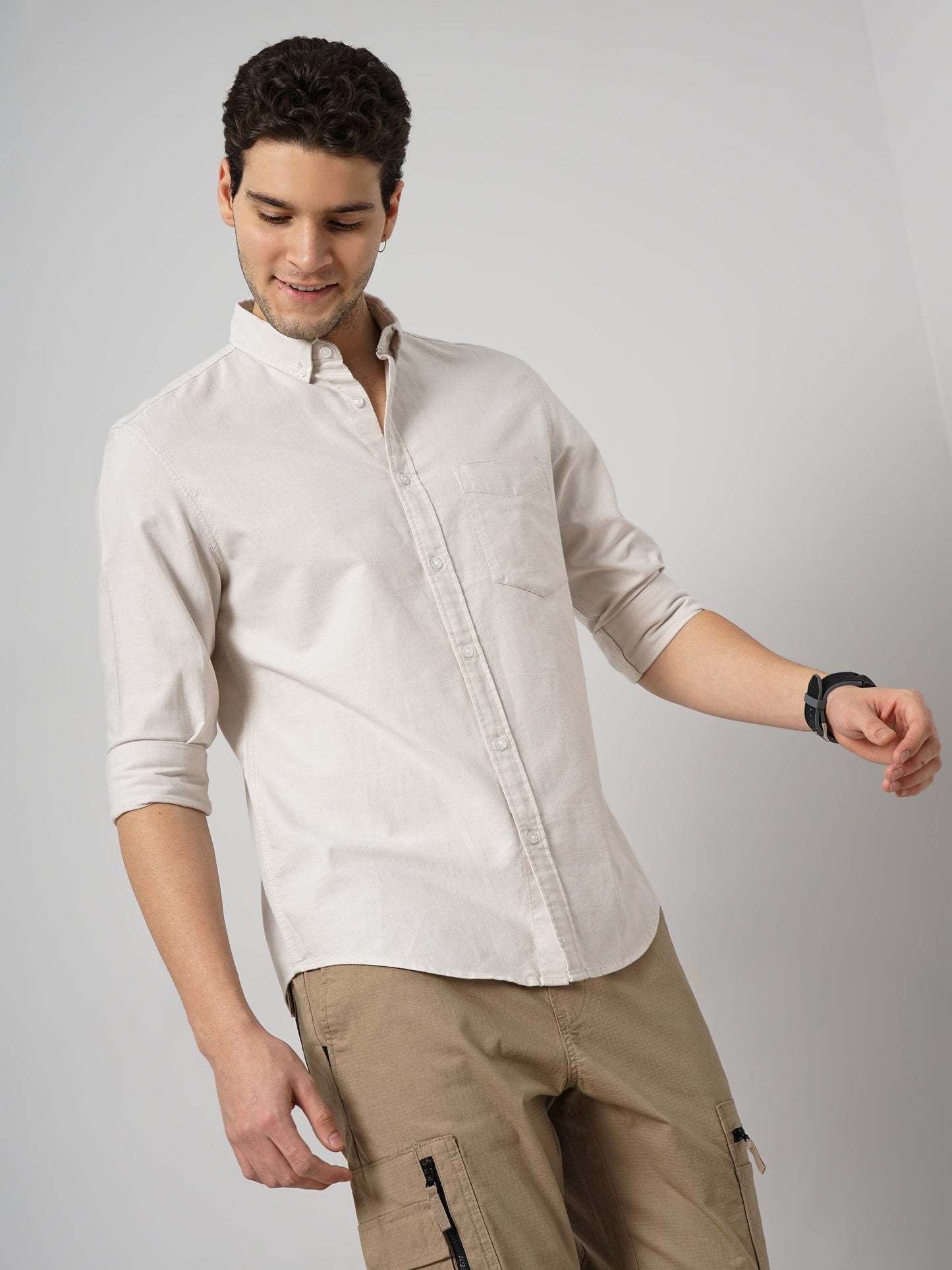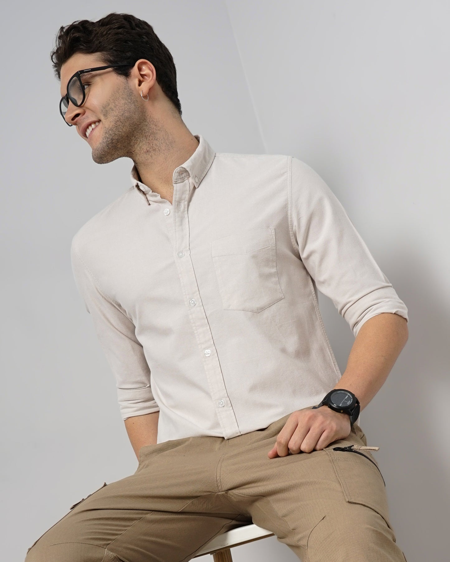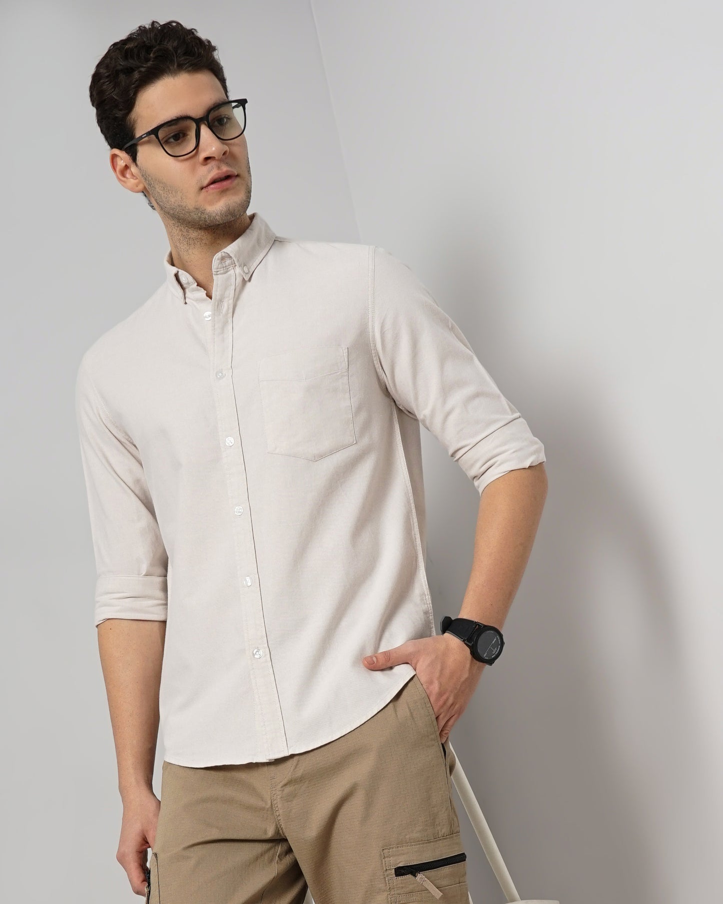 Elevate your casual wardrobe with the Celio Men's Solid Regular Fit Oxford Shirt in Beige. Crafted from cotton, it features long sleeves, perfect for any casual occasion. Disclaimer: All other items in the image are only for display purposes and will not be a part of the delivery content. Product colour may slightly vary due to photographic lighting sources. Country of Origin - India.