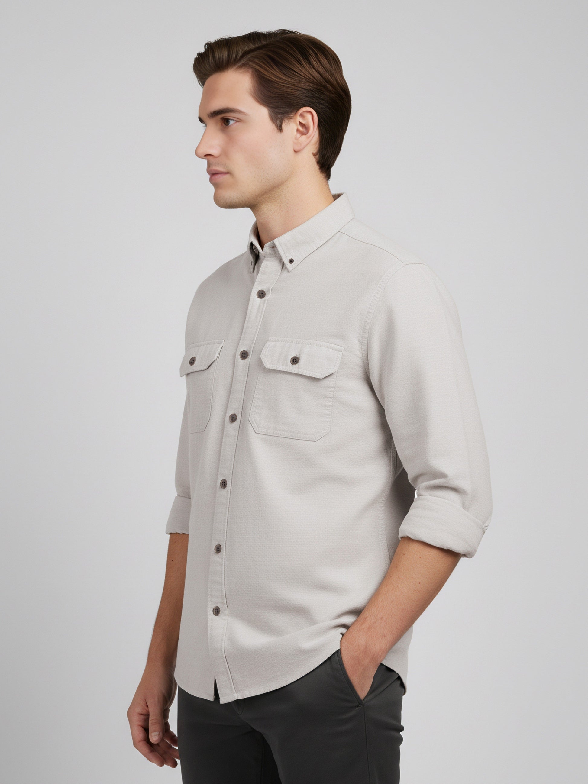 Discover the Celio Men Beige Solid Casual Shirt, crafted from soft cotton. This regular fit shirt features roll-up sleeves, perfect for everyday wear. Disclaimer: All other items in the image are only for display purposes and will not be a part of the delivery content. Product colour may slightly vary due to photographic lighting sources. Country of Origin - India.