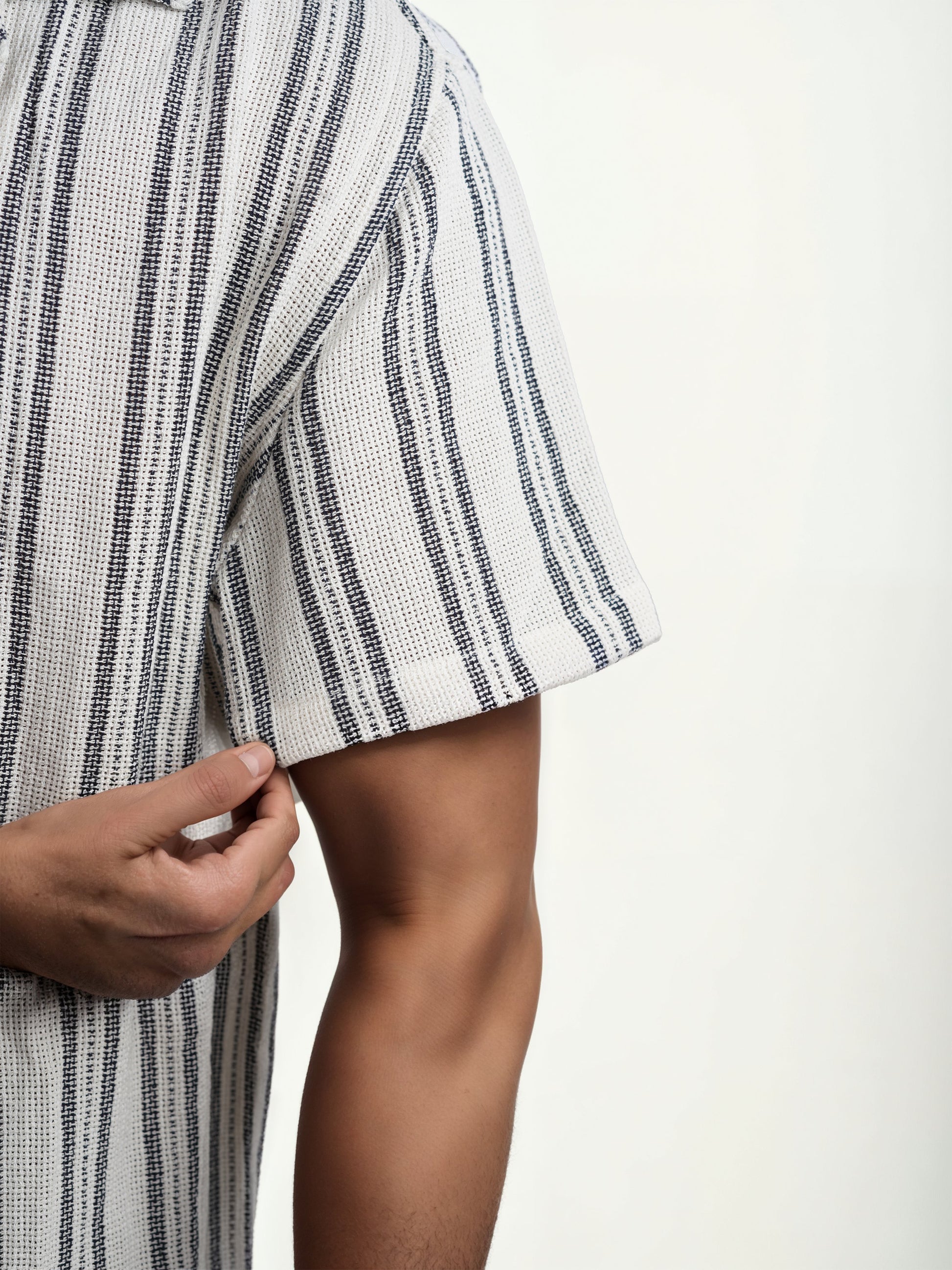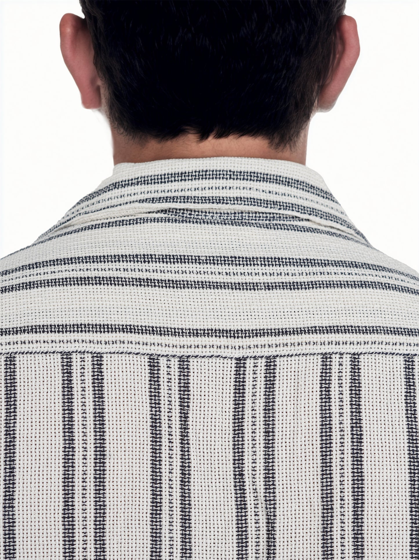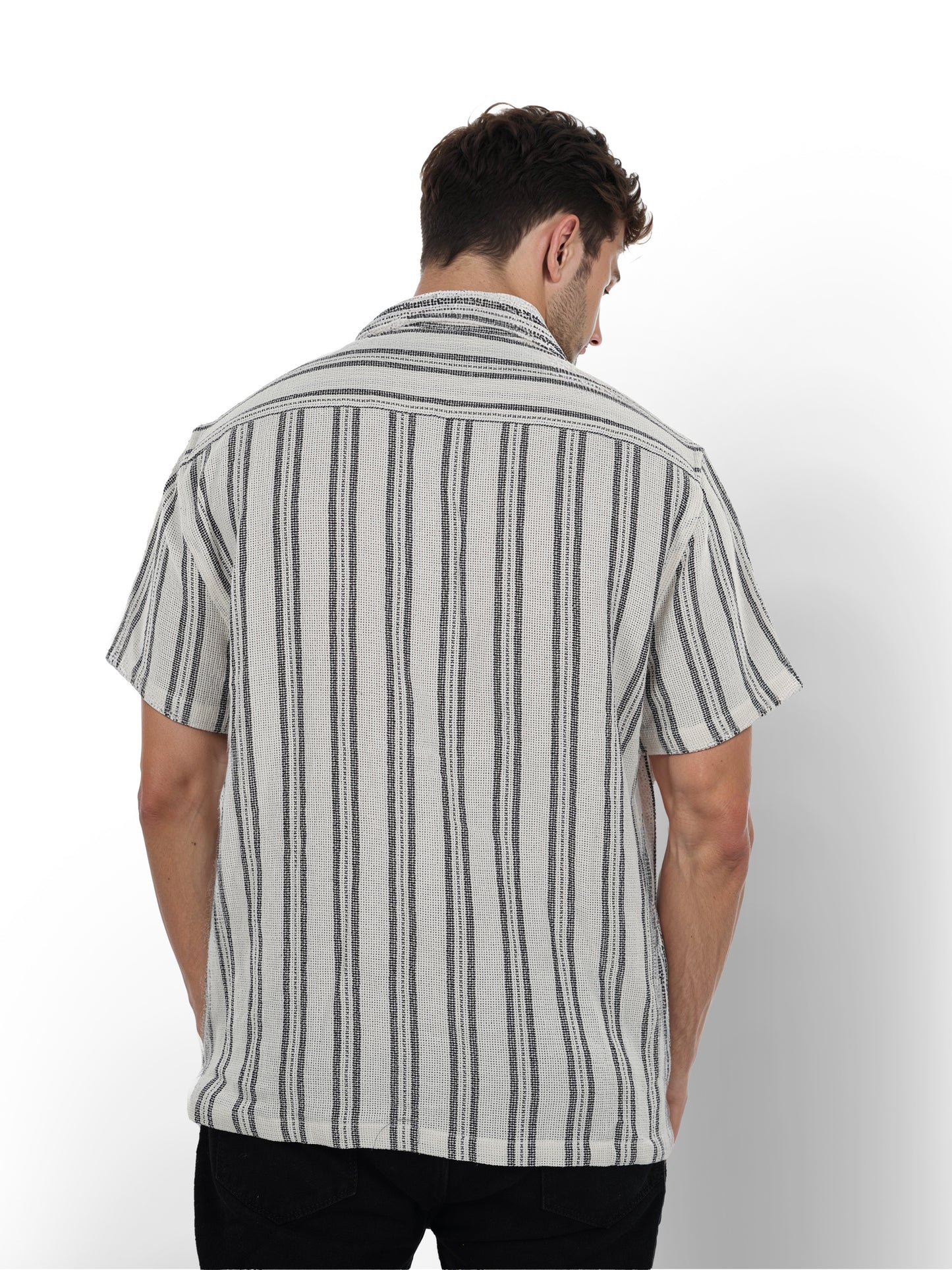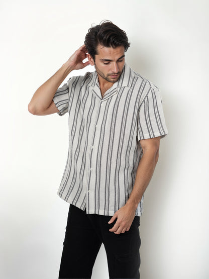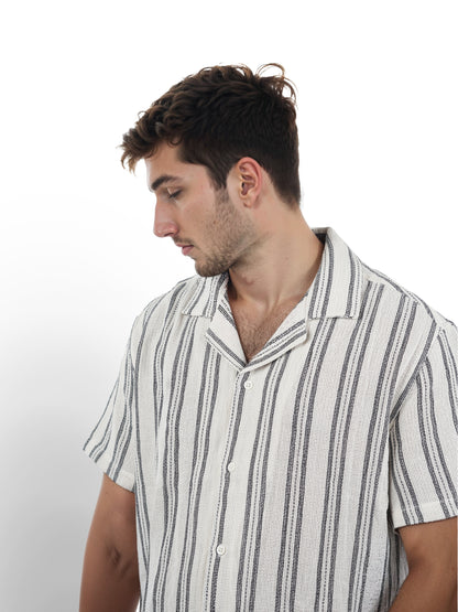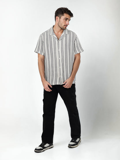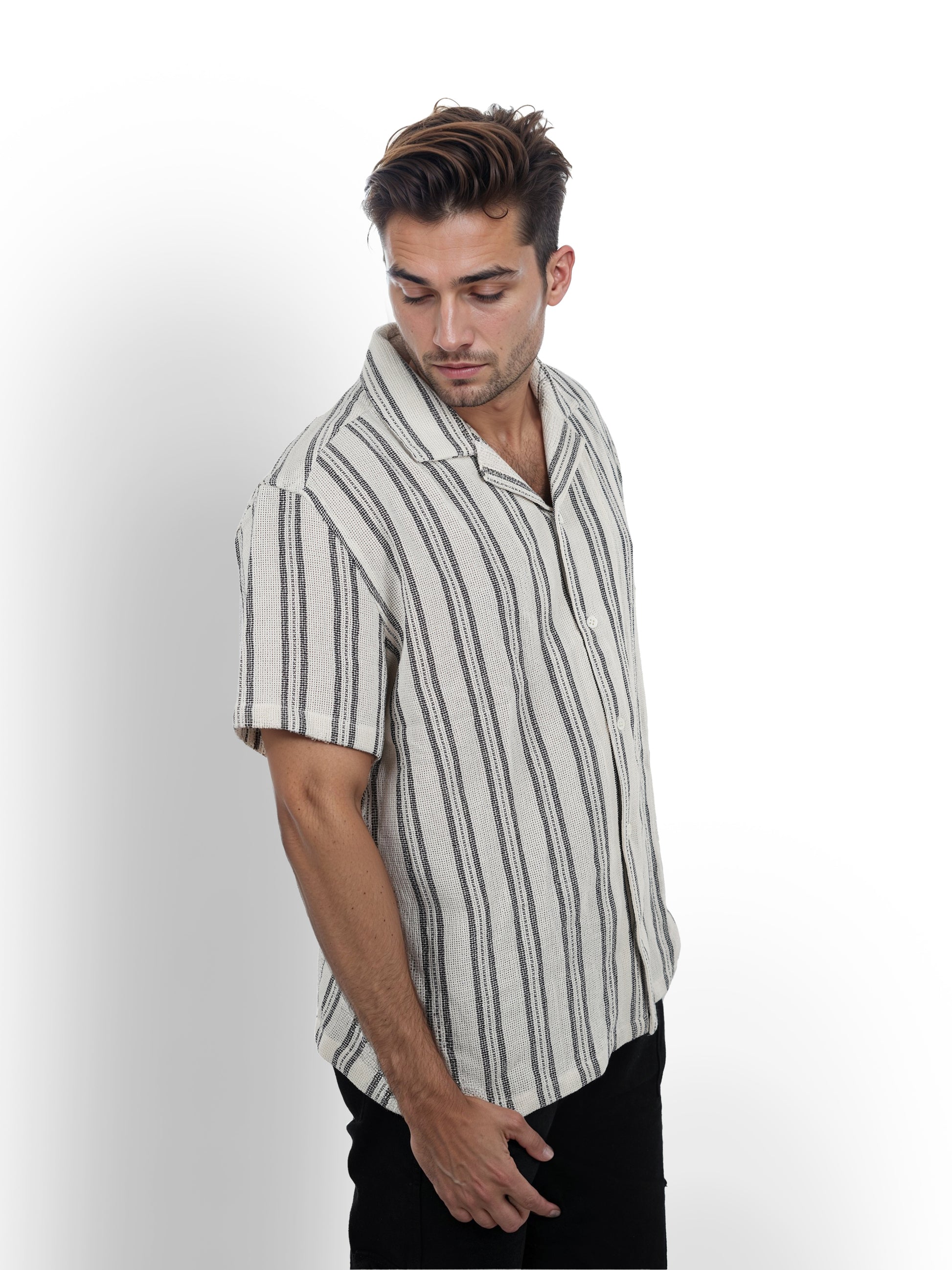 Shop the Celio men's beige Cuban collar shirt. Made of soft cotton, this regular fit, short-sleeved shirt is perfect for casual occasions with its stylish striped design. Disclaimer: All other items in the image are only for display purposes and will not be a part of the delivery content. Product colour may slightly vary due to photographic lighting sources. Country of Origin - India.