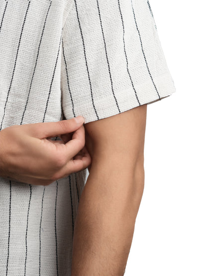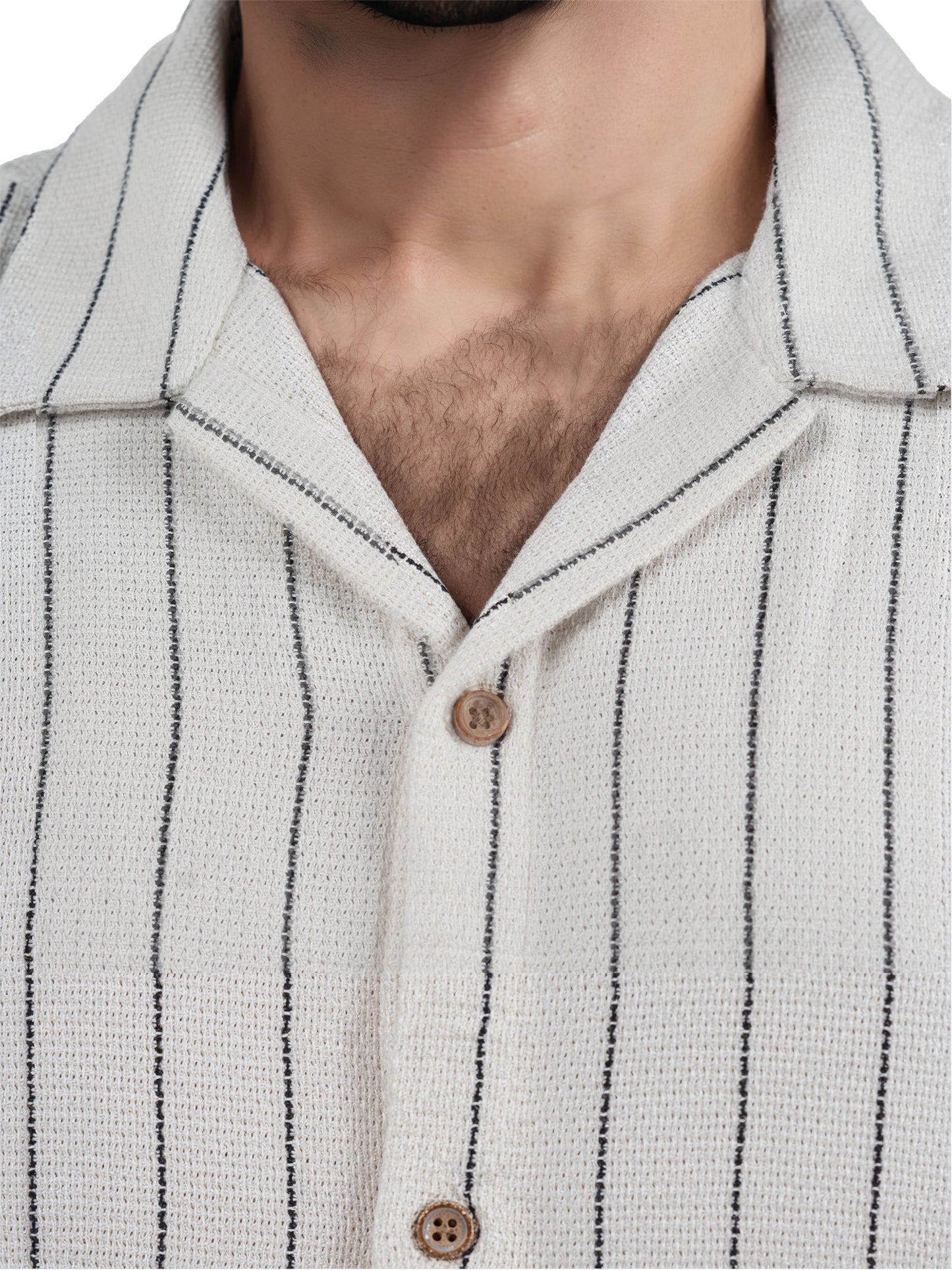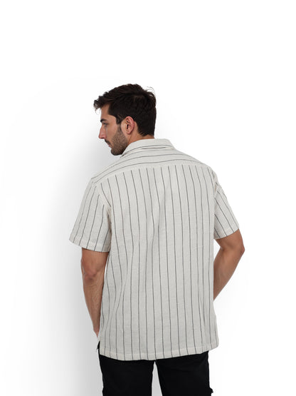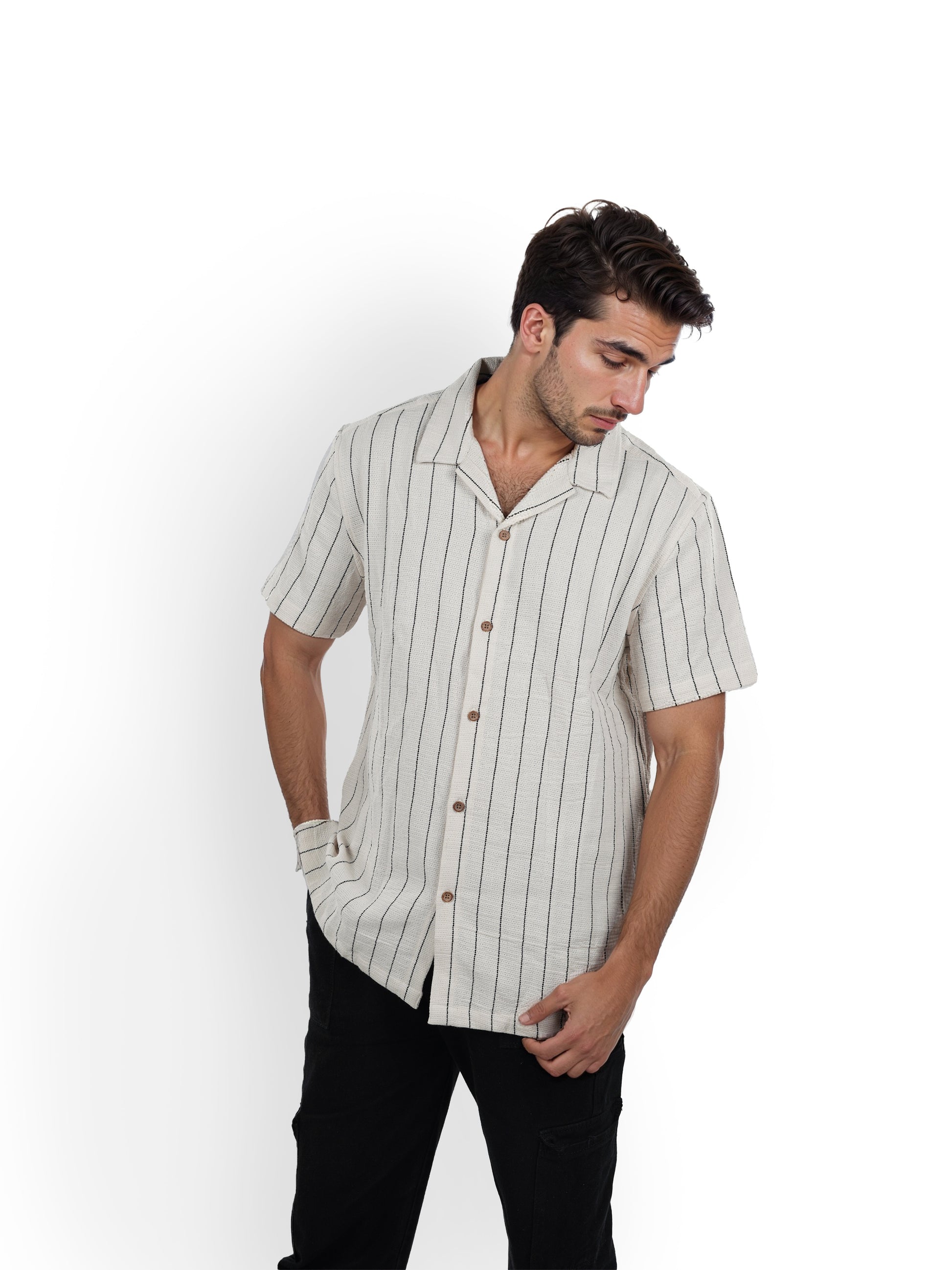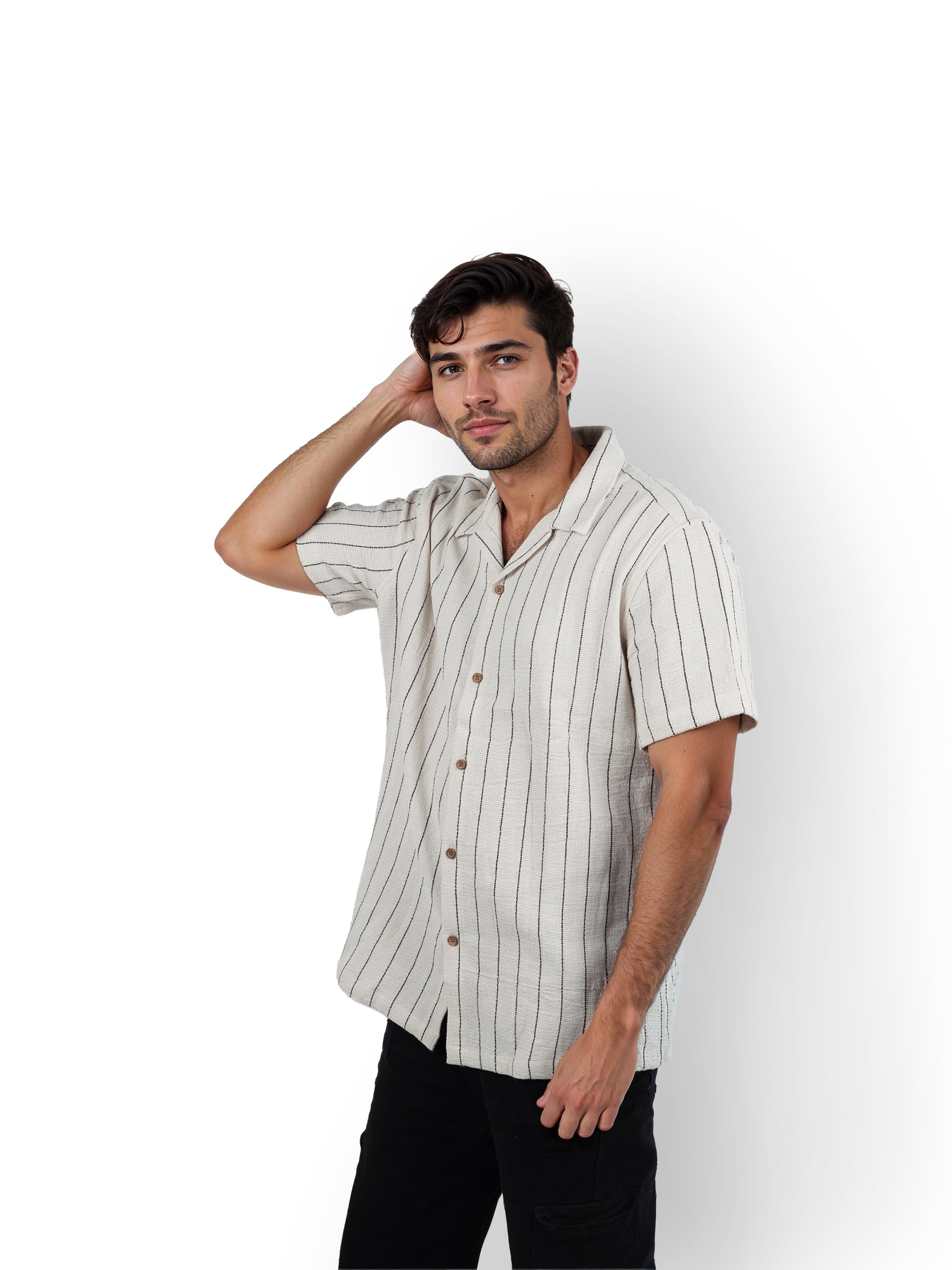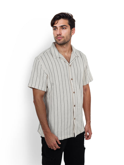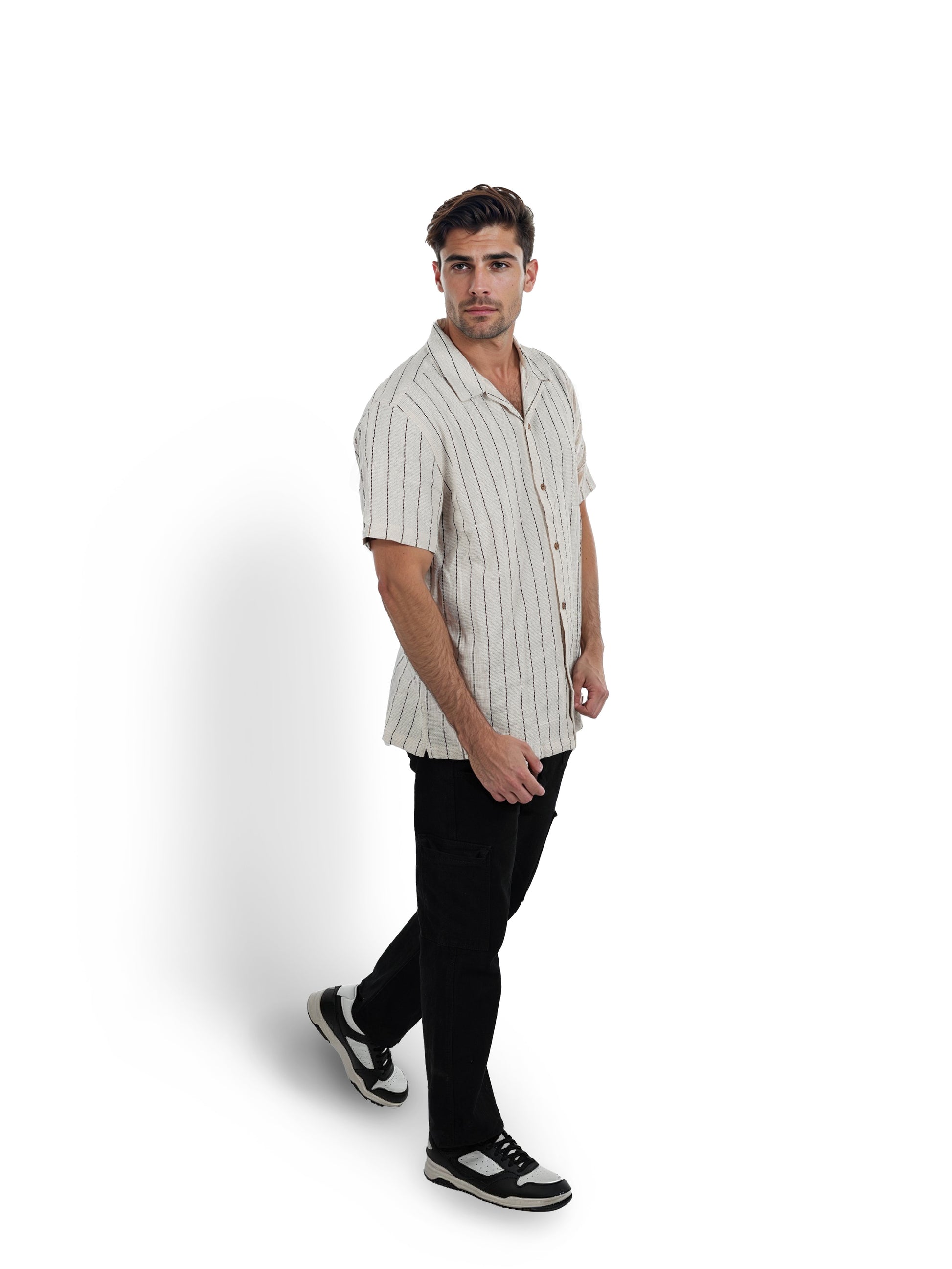 This Men Beige Cuban Collar Striped Regular Fit Cotton Casual Shirt by Celio is perfect for a laid-back look. Crafted from lightweight cotton, it features short sleeves for ultimate comfort. Disclaimer: All other items in the image are only for display purposes and will not be a part of the delivery content. Product colour may slightly vary due to photographic lighting sources. Country of Origin - India.