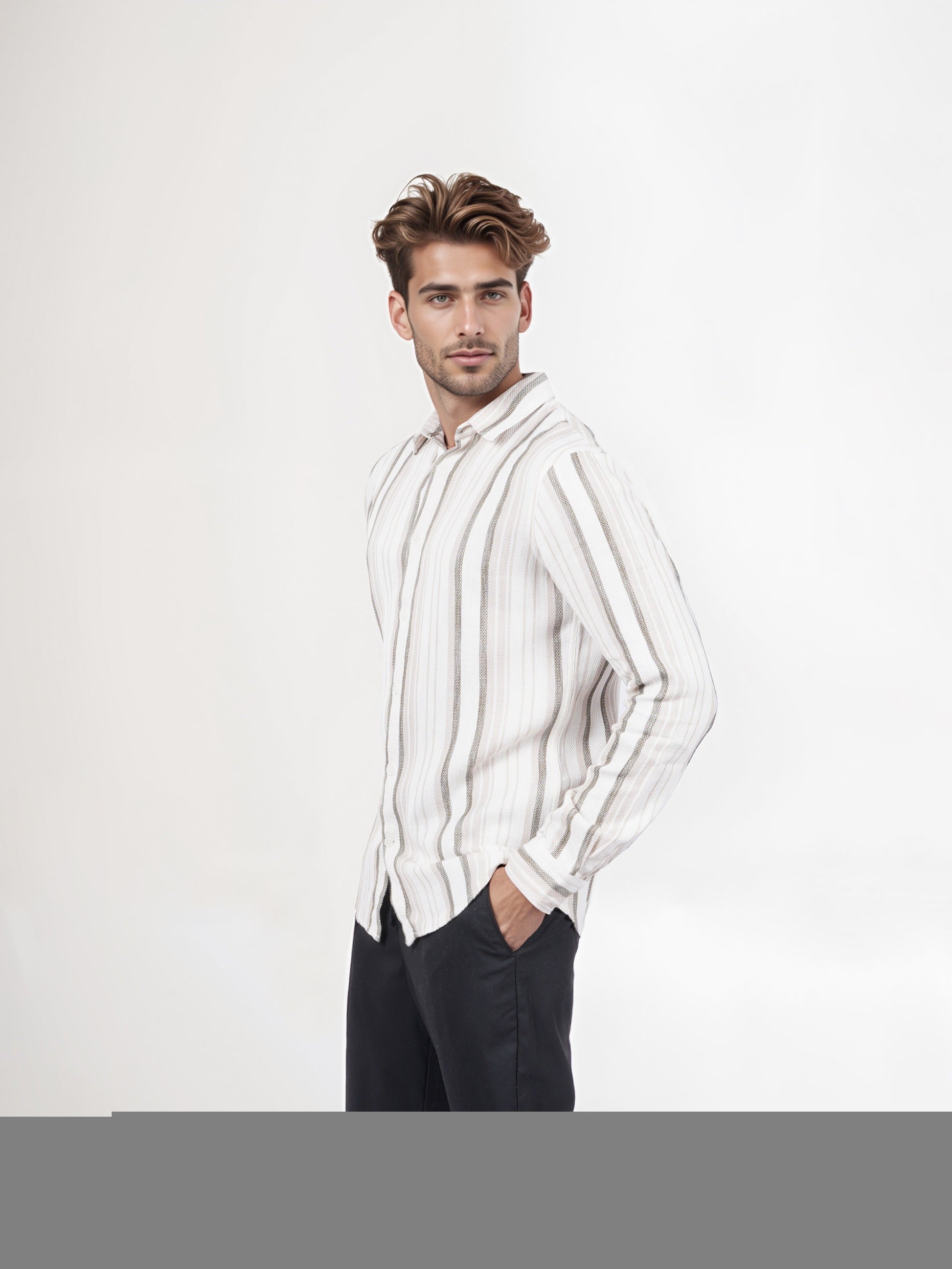 Stylish Celio men's shirt in beige with a striped pattern. Made from comfortable cotton, featuring long sleeves, perfect for casual occasions. Disclaimer: All other items in the image are only for display purposes and will not be a part of the delivery content. Product colour may slightly vary due to photographic lighting sources. Country of Origin - India.