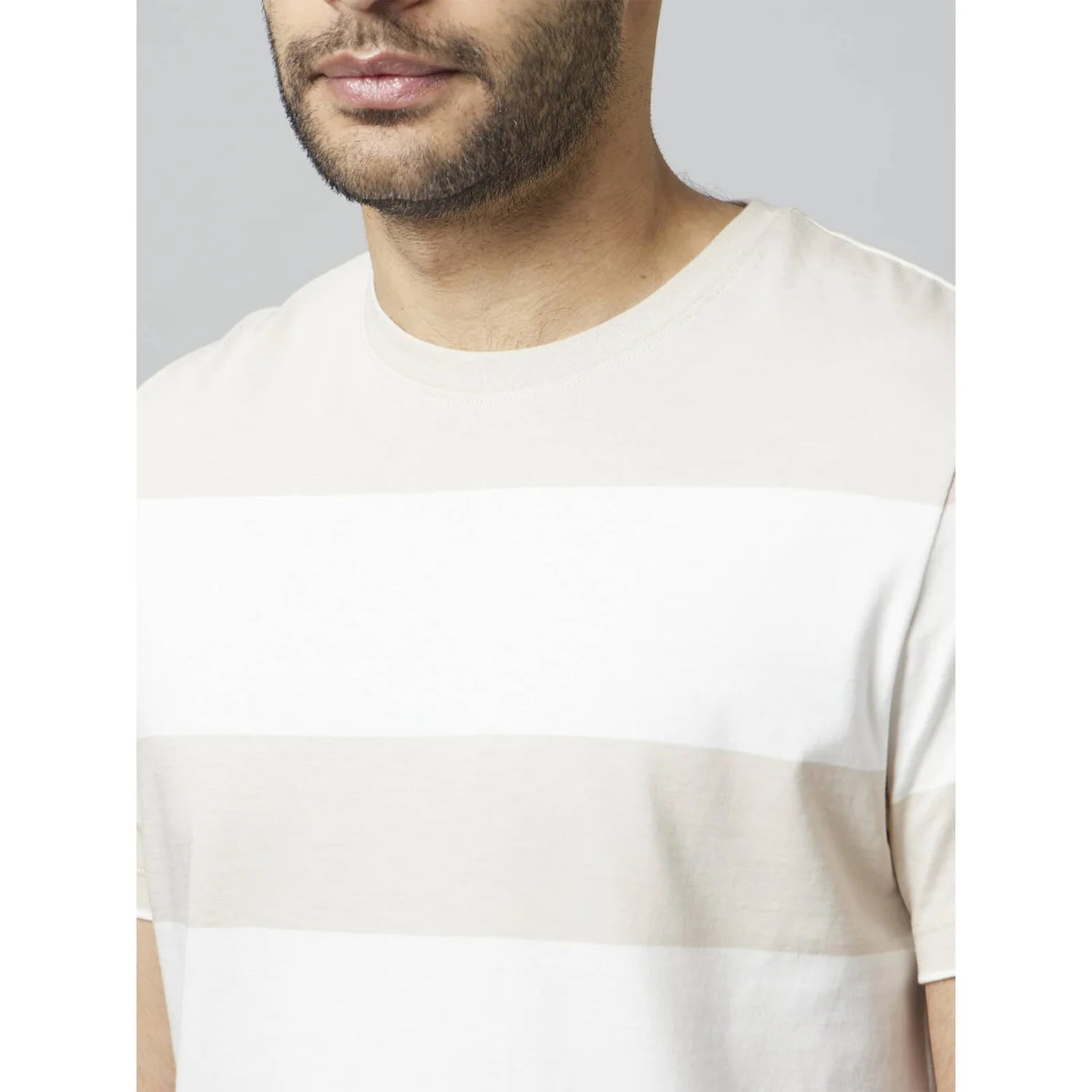 Shop the Celio Striped Beige Short Sleeves Round Neck T-shirt for men. Crafted from soft cotton, this casual tee features a stylish striped design, perfect for everyday wear. Disclaimer: All other items in the image are only for display purposes and will not be a part of the delivery content. Product colour may slightly vary due to photographic lighting sources. Country of Origin - India.