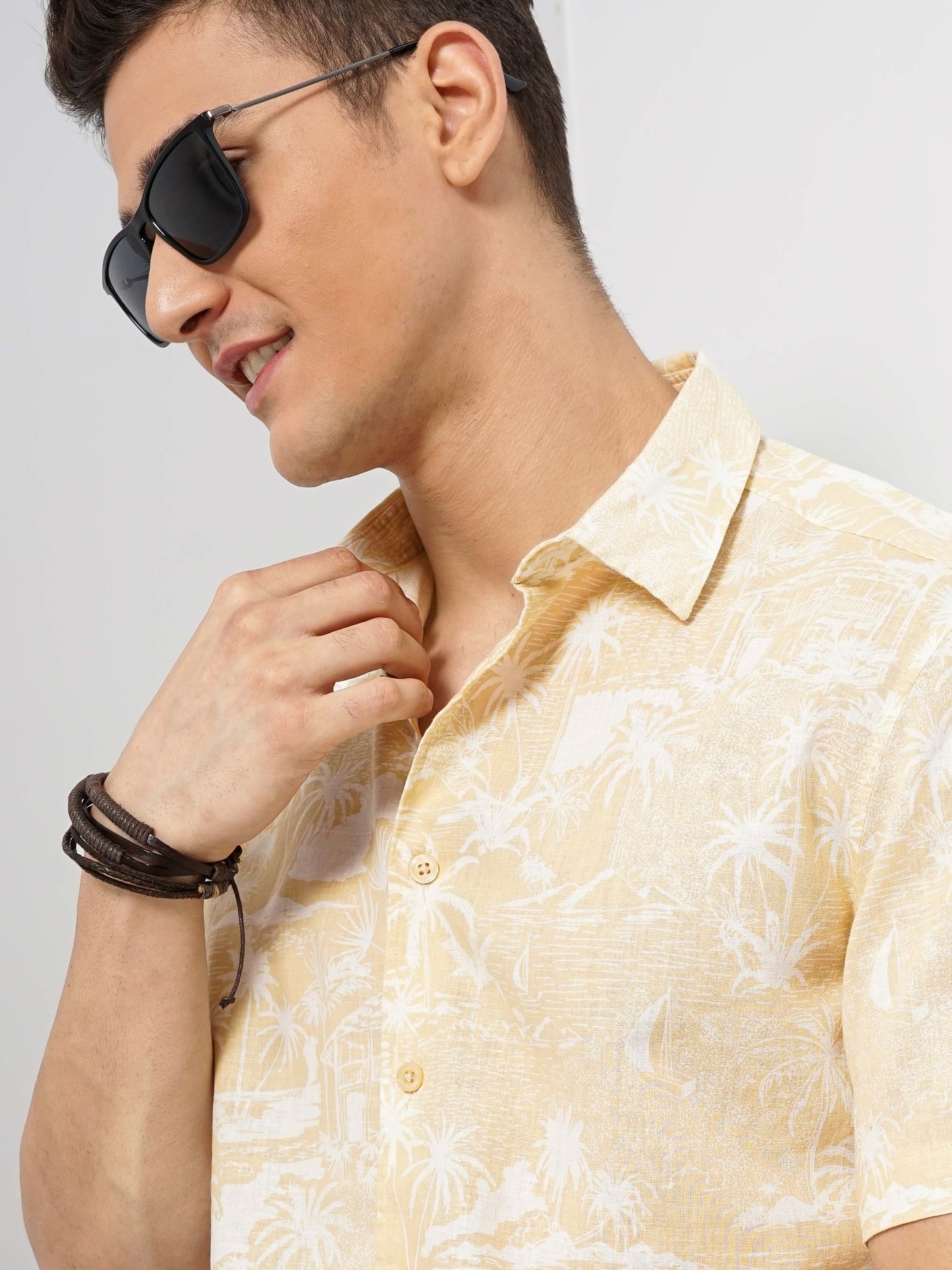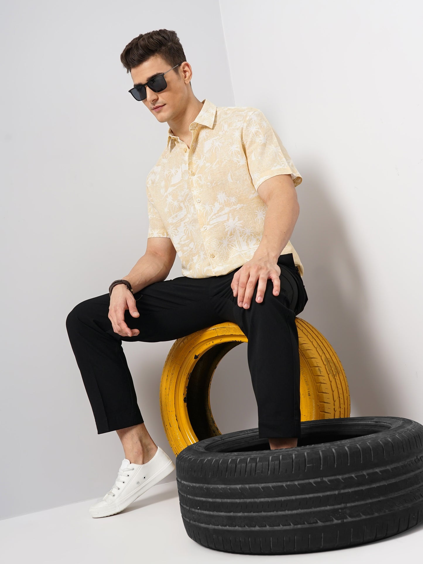 Elevate your casual look with the Celio Men Beige Linen Shirt. Featuring a spread collar and short sleeves, this printed regular fit shirt is perfect for warm days. Disclaimer: All other items in the image are only for display purposes and will not be a part of the delivery content. Product colour may slightly vary due to photographic lighting sources. Country of Origin - India.
