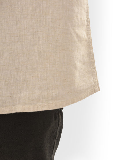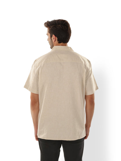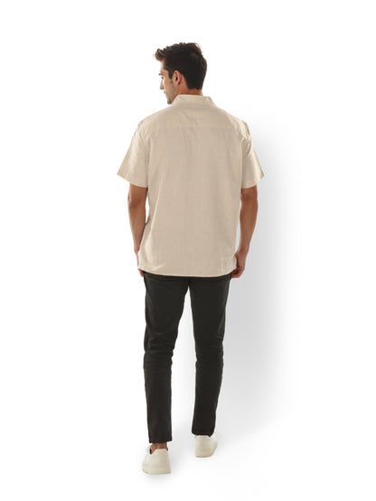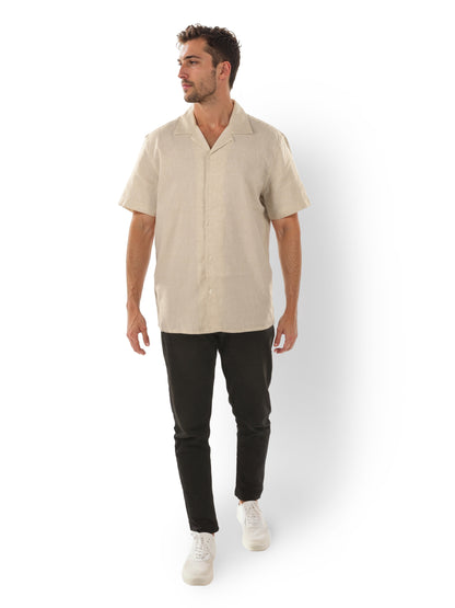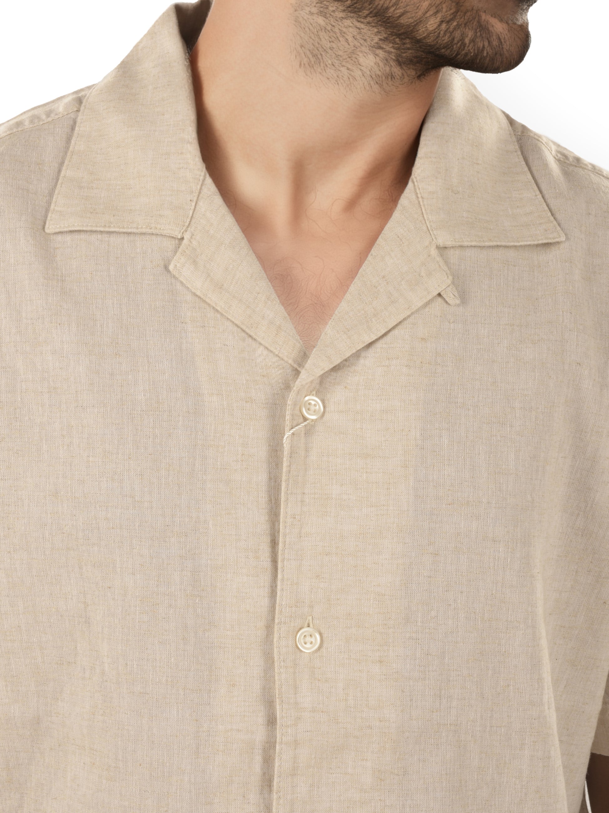 Elevate your casual wardrobe with the Celio Men's beige Cuban Collar Shirt. Crafted from breathable linen, it features short sleeves and a regular fit, perfect for relaxed outings. Disclaimer: All other items in the image are only for display purposes and will not be a part of the delivery content. Product colour may slightly vary due to photographic lighting sources. Country of Origin - India.