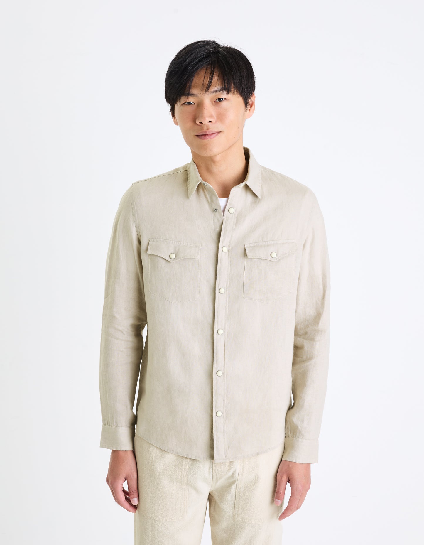 Elevate your casual wardrobe with the Celio Men Beige Spread Collar Linen Shirt. Made from soft linen, it features long sleeves, a regular fit, and a stylish beige color. Disclaimer: All other items in the image are only for display purposes and will not be a part of the delivery content. Product colour may slightly vary due to photographic lighting sources. Country of Origin - India.