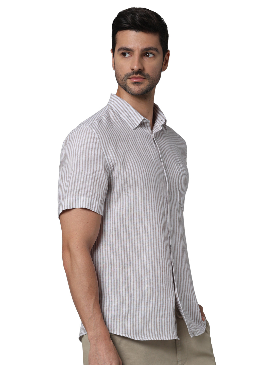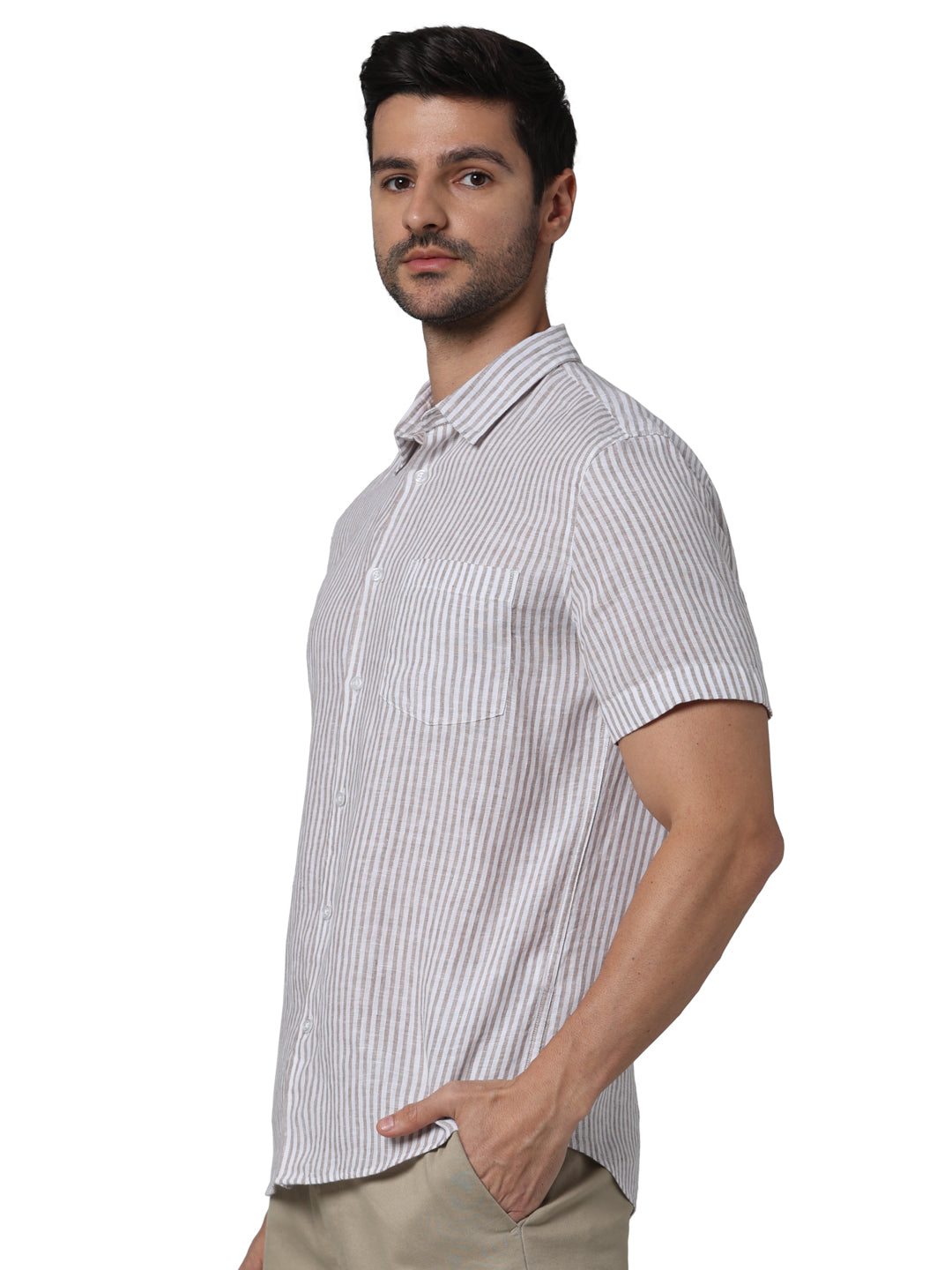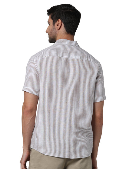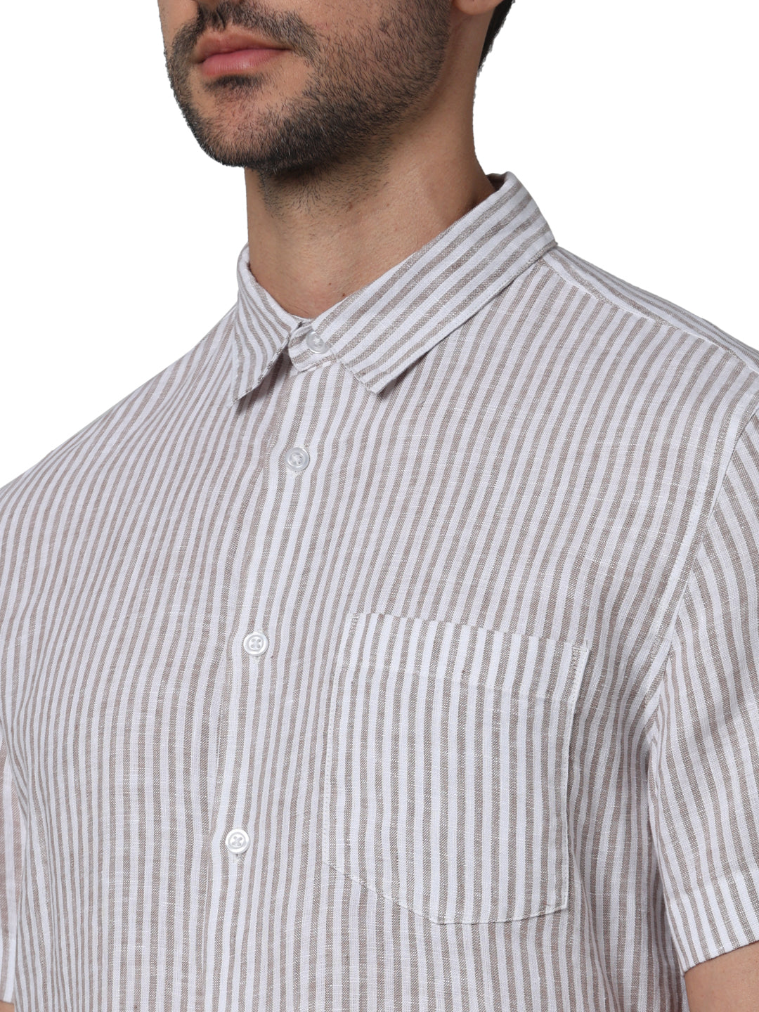 Elevate your casual wardrobe with the Celio Men Beige Spread Collar Striped Shirt. Crafted from lightweight linen, this regular fit shirt features short sleeves for a relaxed feel. Disclaimer: All other items in the image are only for display purposes and will not be a part of the delivery content. Product colour may slightly vary due to photographic lighting sources. Country of Origin - India.