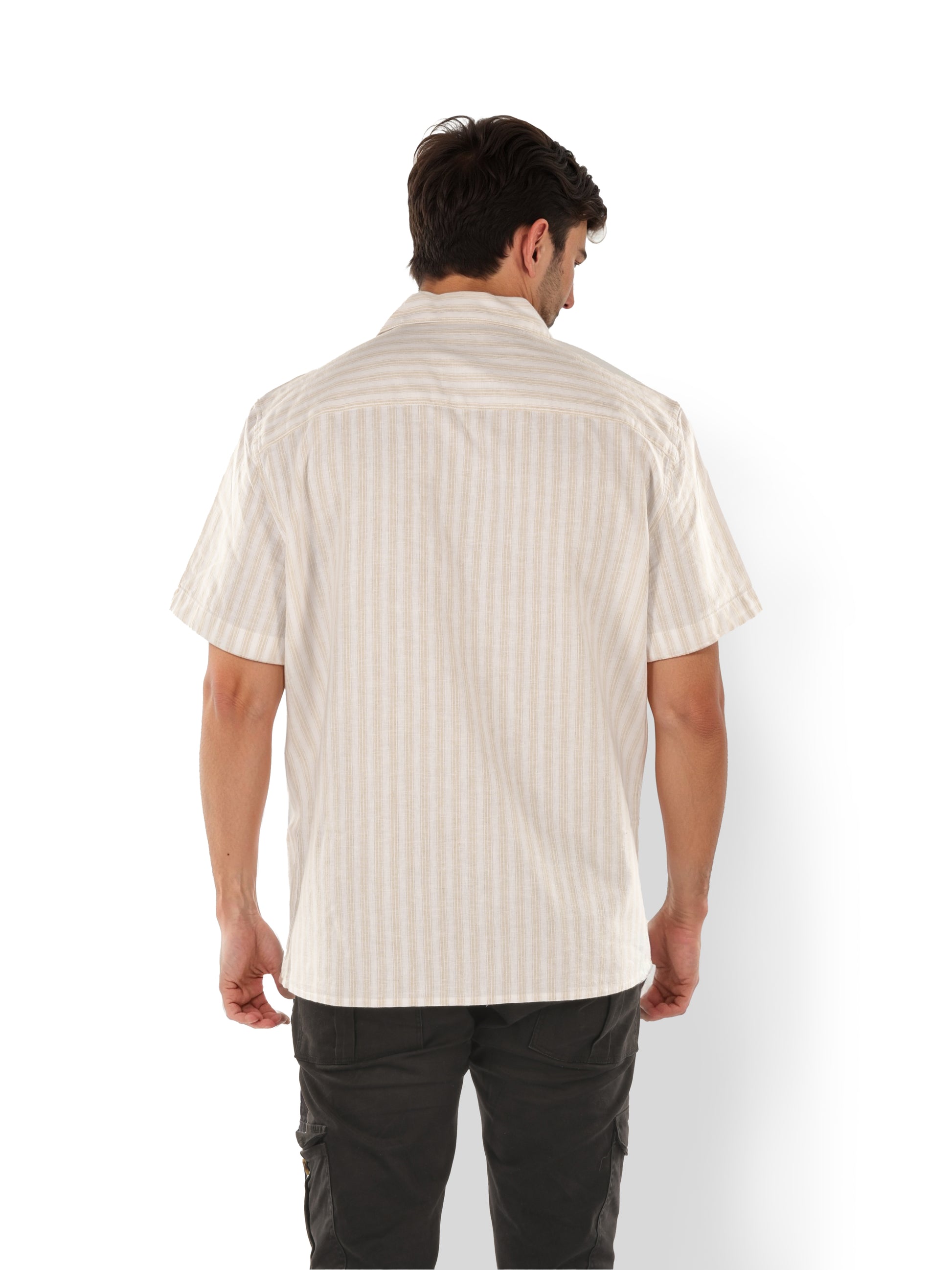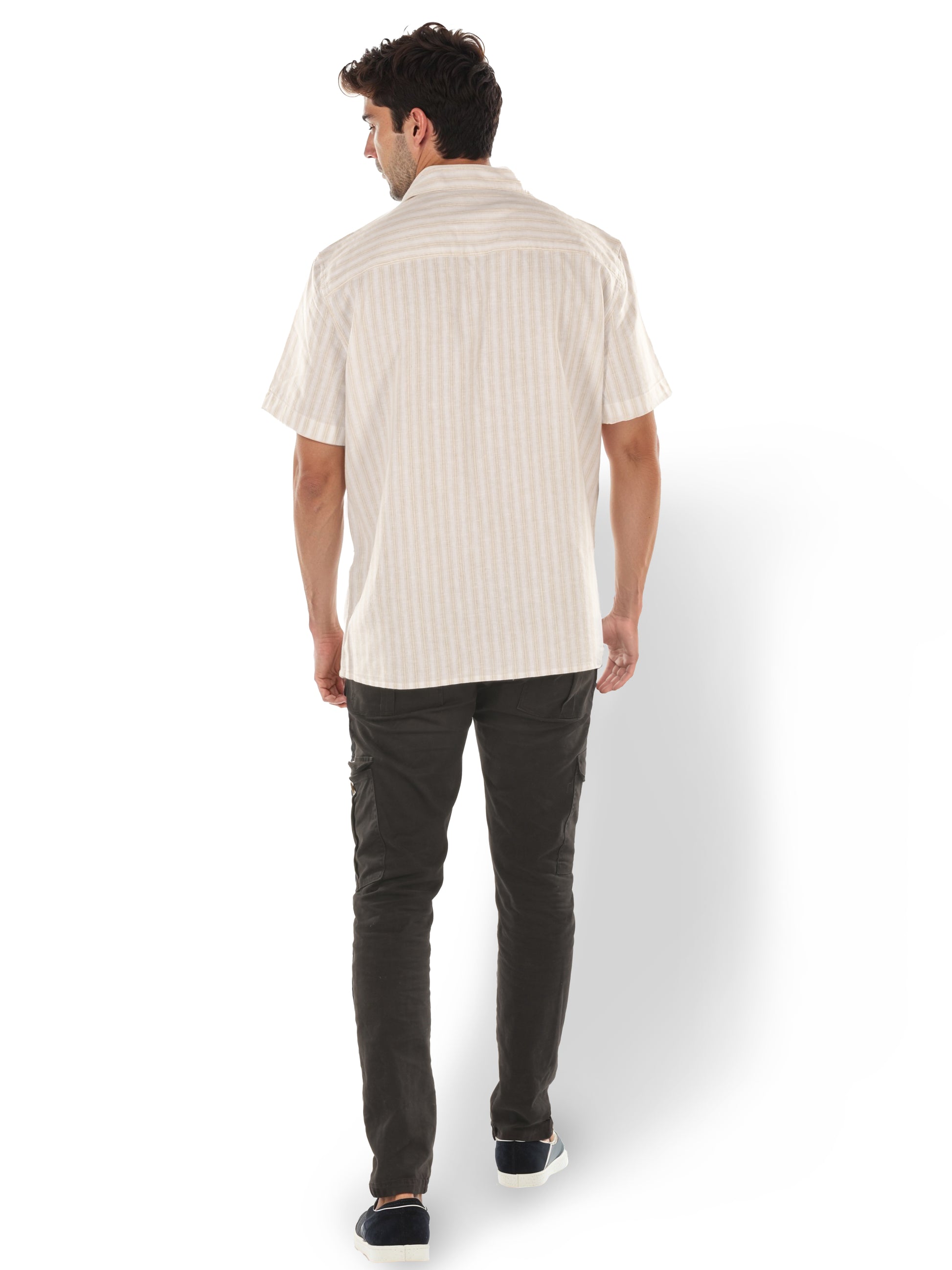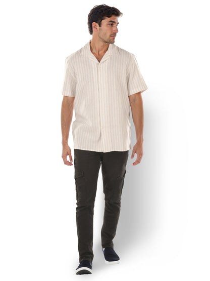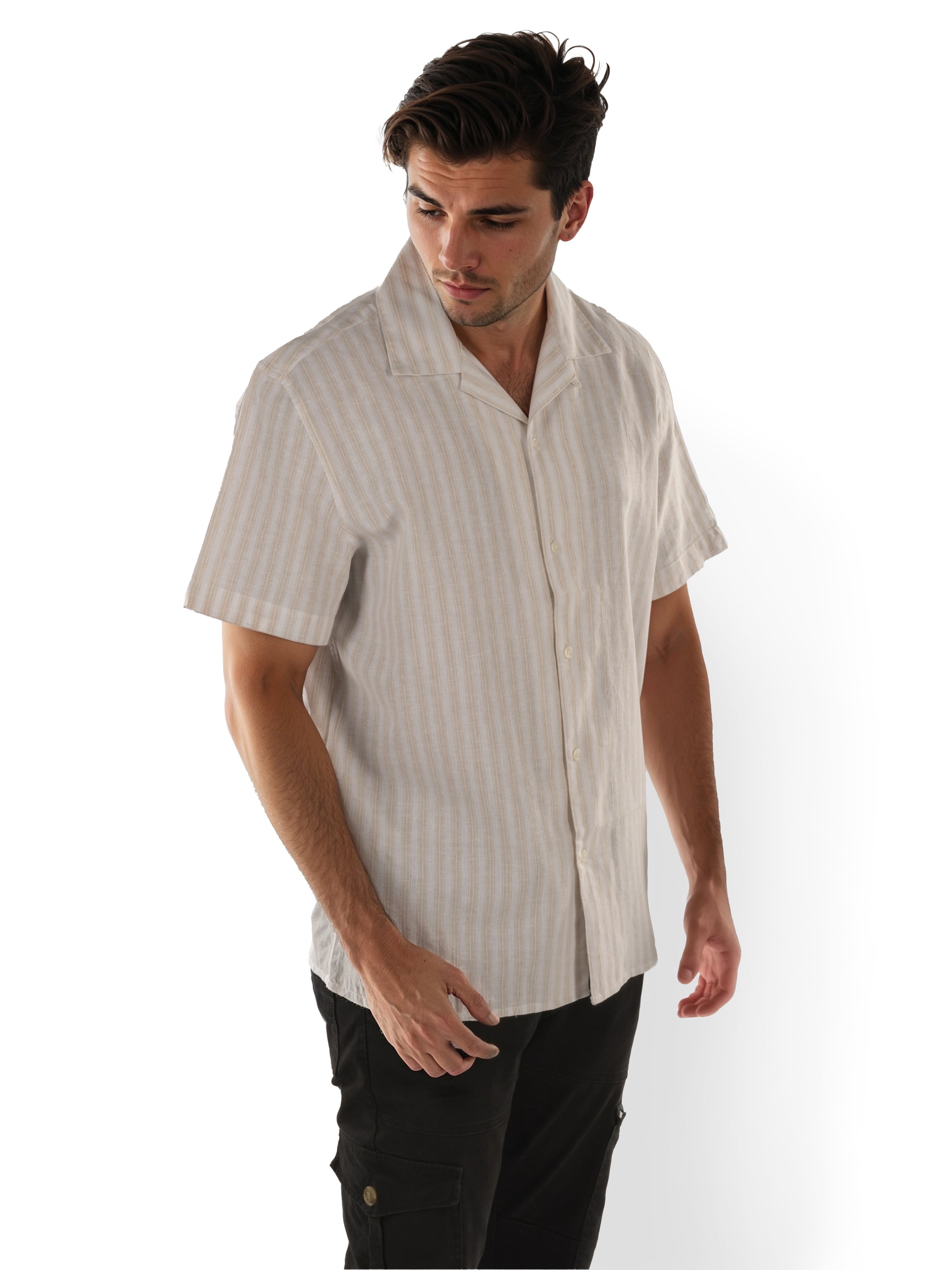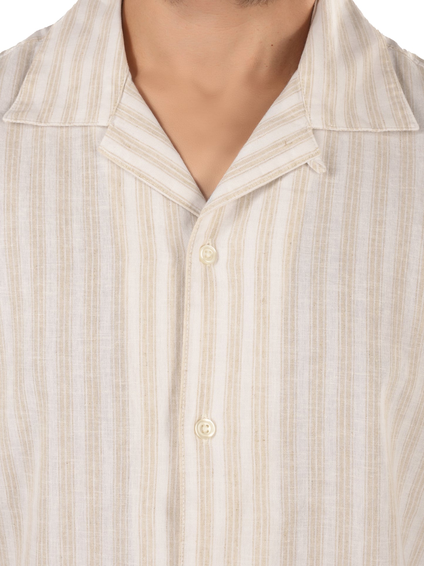 Elevate your casual wardrobe with the Celio Men's beige Cuban Collar Striped Shirt. Crafted from breathable linen, this regular fit shirt features short sleeves, perfect for warm days. Disclaimer: All other items in the image are only for display purposes and will not be a part of the delivery content. Product colour may slightly vary due to photographic lighting sources. Country of Origin - India.