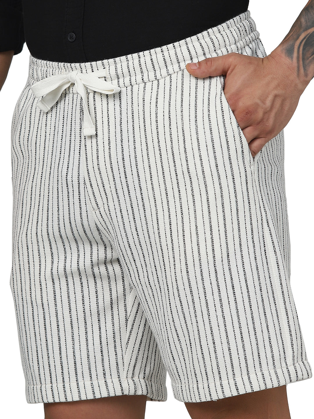Elevate your casual look with Celio Men Off White Striped Shorts. Made from comfortable polyester, these regular fit shorts are perfect for a stylish day out. Disclaimer: All other items in the image are only for display purposes and will not be a part of the delivery content. Product colour may slightly vary due to photographic lighting sources. Country of Origin - India.