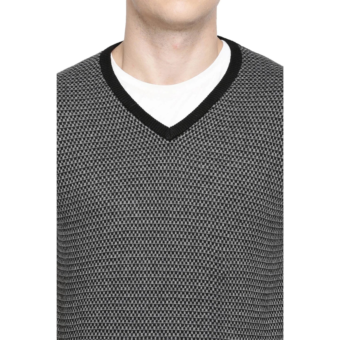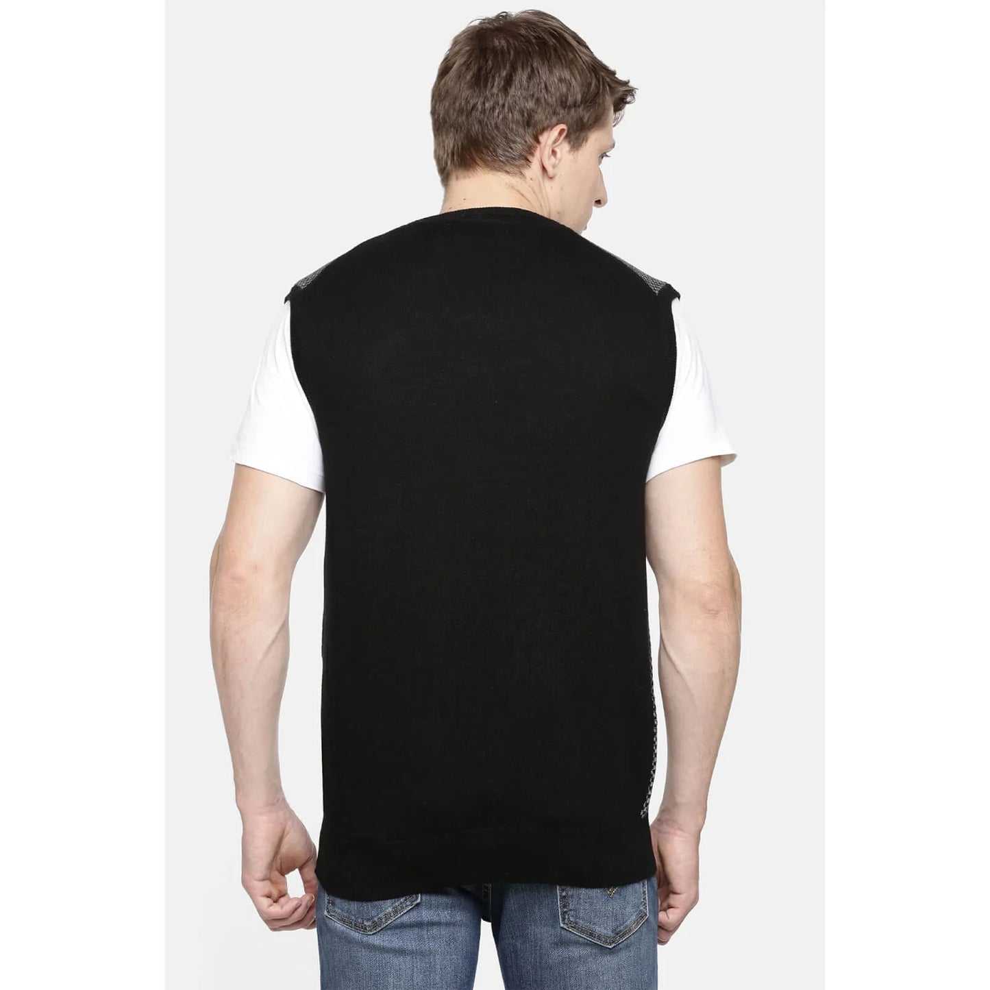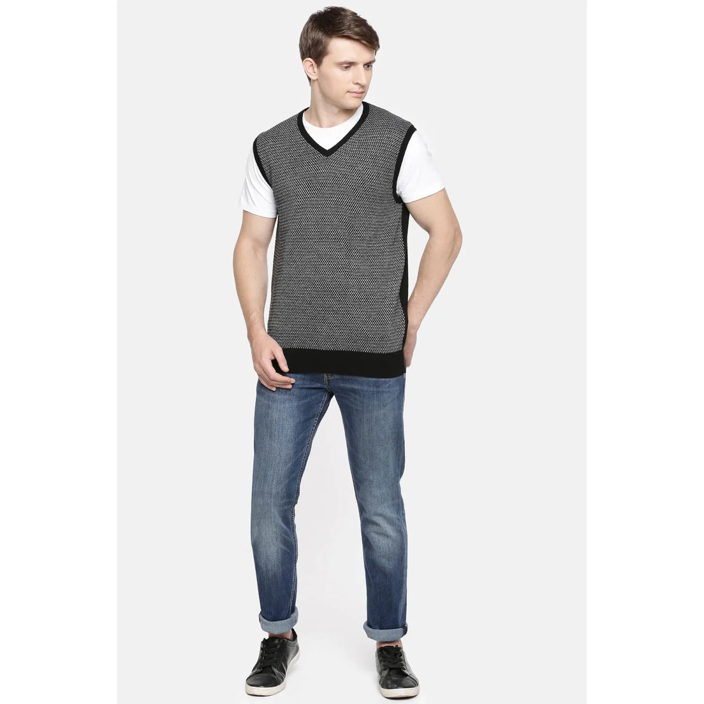 Elevate your casual wardrobe with the Celio Men's Black Melange Sweater. Crafted from a comfortable cotton blend, this sleeveless piece is perfect for any casual occasion. Disclaimer: All other items in the image are only for display purposes and will not be a part of the delivery content. Product colour may slightly vary due to photographic lighting sources. Country of Origin - India.