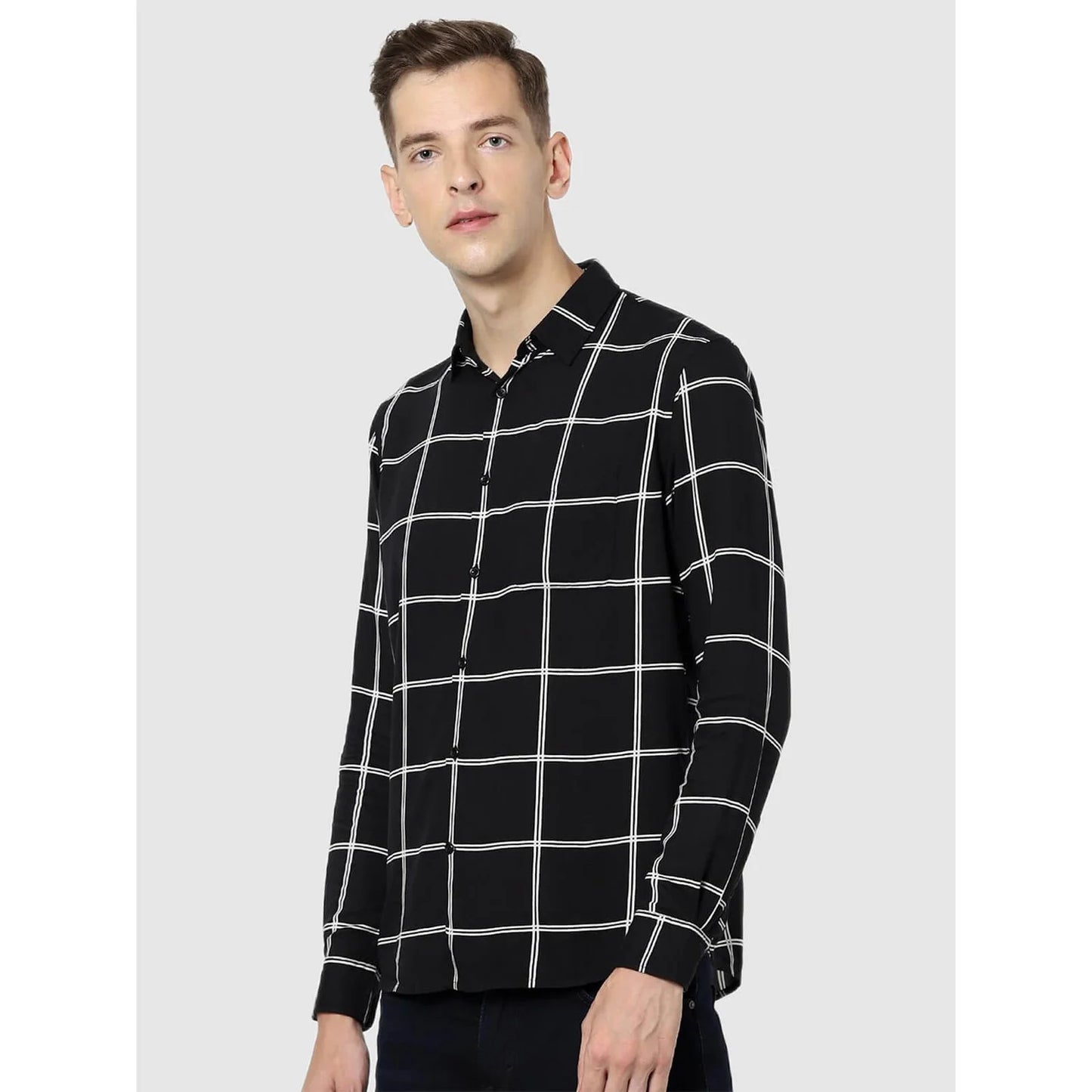 Elevate your casual style with the Celio Black Checks Regular Fit Shirt. Made from comfortable cotton, it features long sleeves and a classic check pattern, perfect for men. Disclaimer: All other items in the image are only for display purposes and will not be a part of the delivery content. Product colour may slightly vary due to photographic lighting sources. Country of Origin - India.