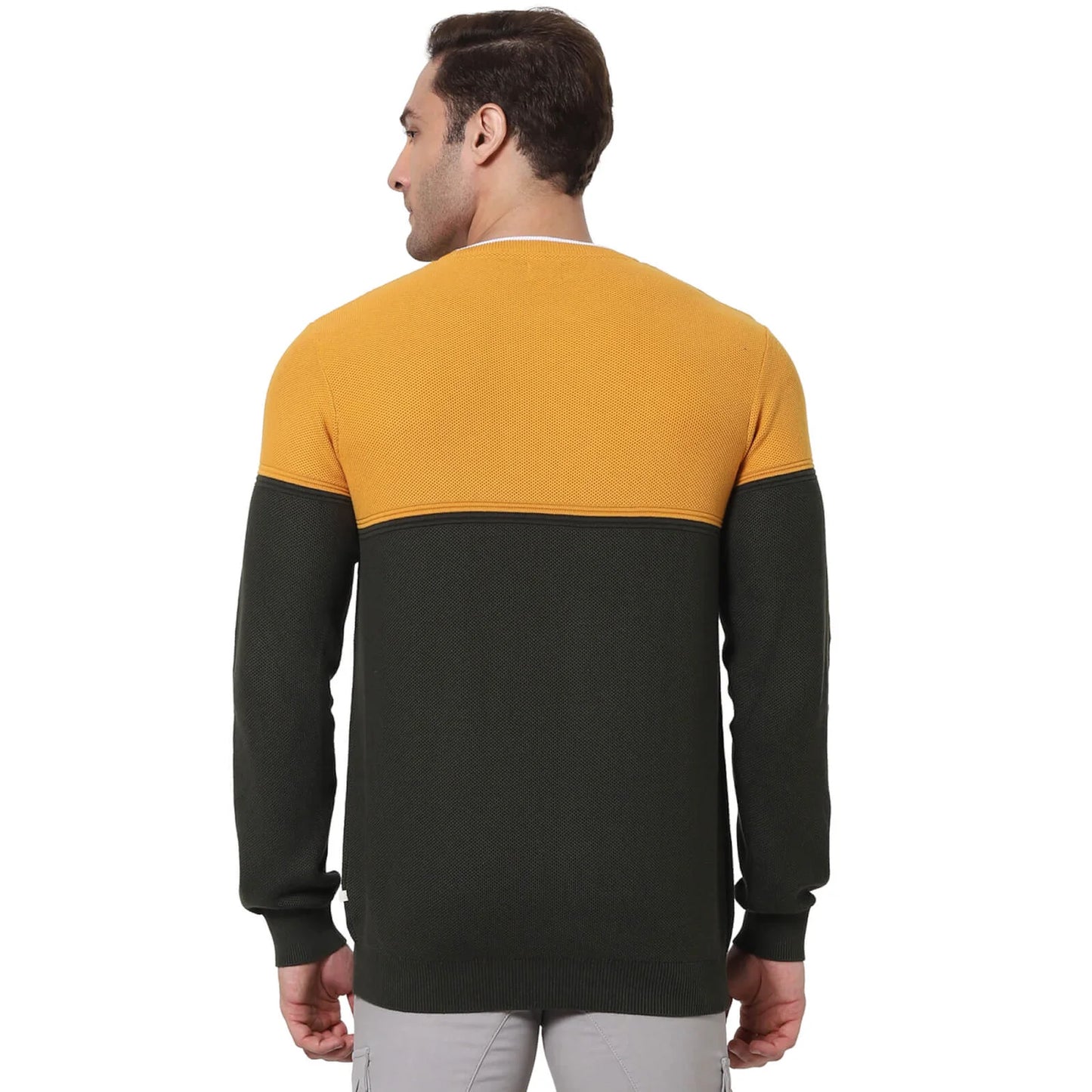 Elevate your casual style with the Celio Men's Black Colourblock Sweater. Crafted from soft cotton, this mustard sweater features long sleeves and a trendy veblock design perfect for any occasion. Disclaimer: All other items in the image are only for display purposes and will not be a part of the delivery content. Product colour may slightly vary due to photographic lighting sources. Country of Origin - India.