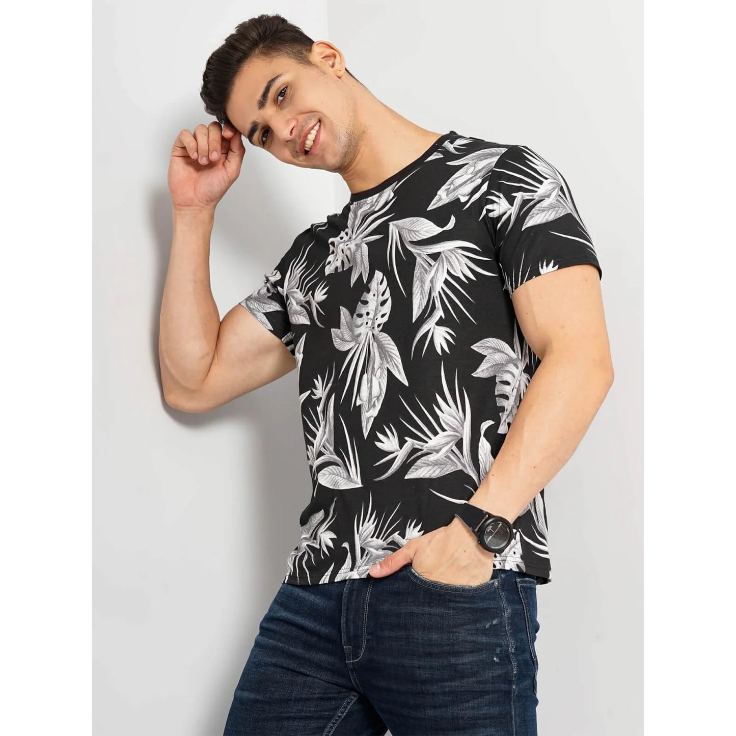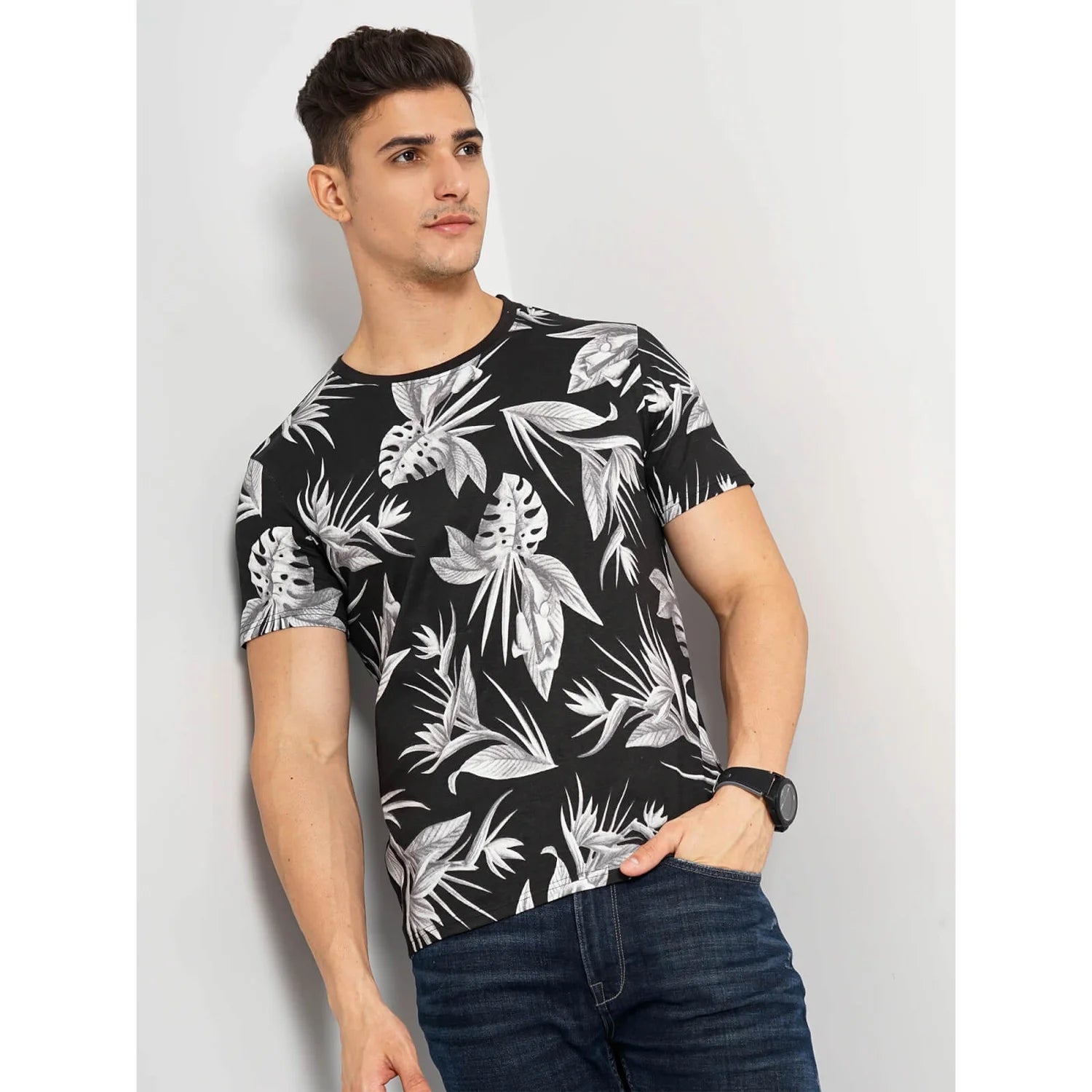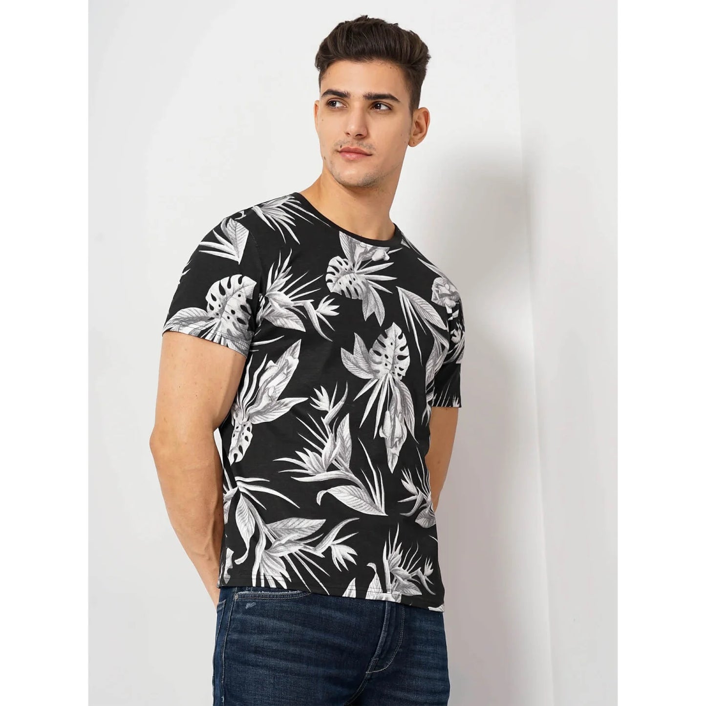 Celio* Floral Regular Fit Cotton Black T-Shirt