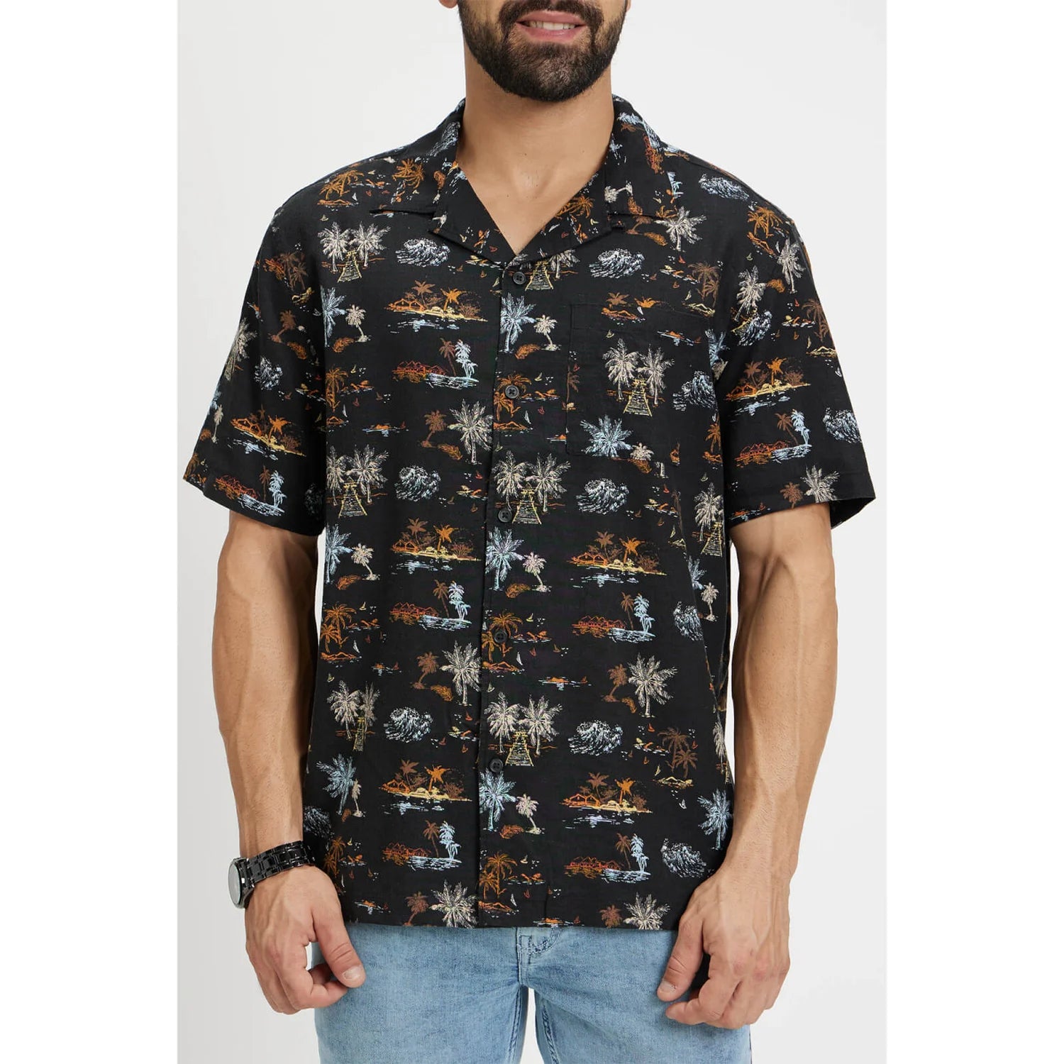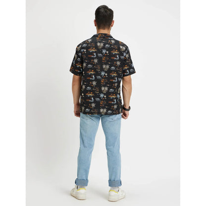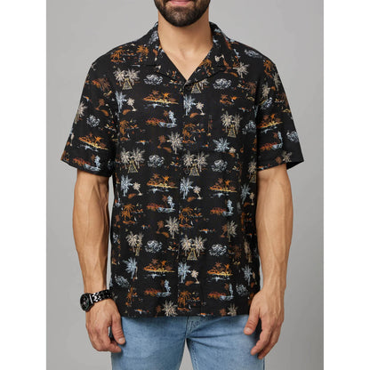 Celio* Conversational Regular Fit Cotton-Linen-Blend Black Shirt