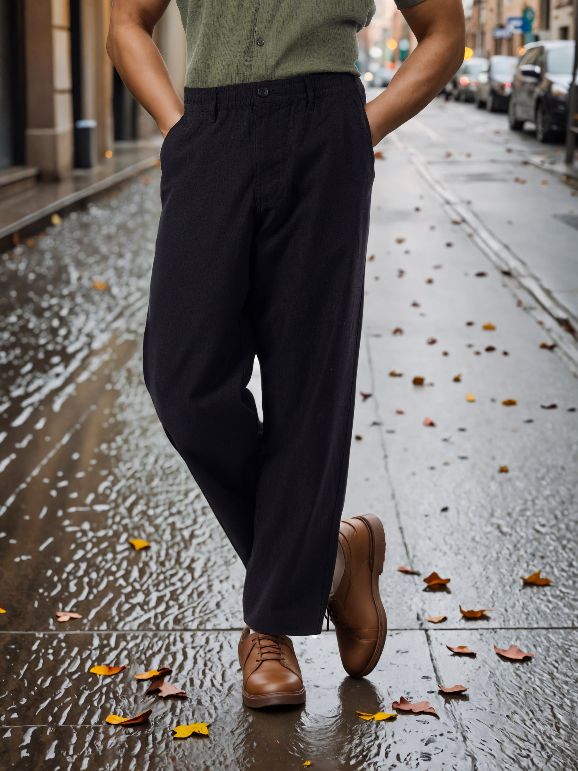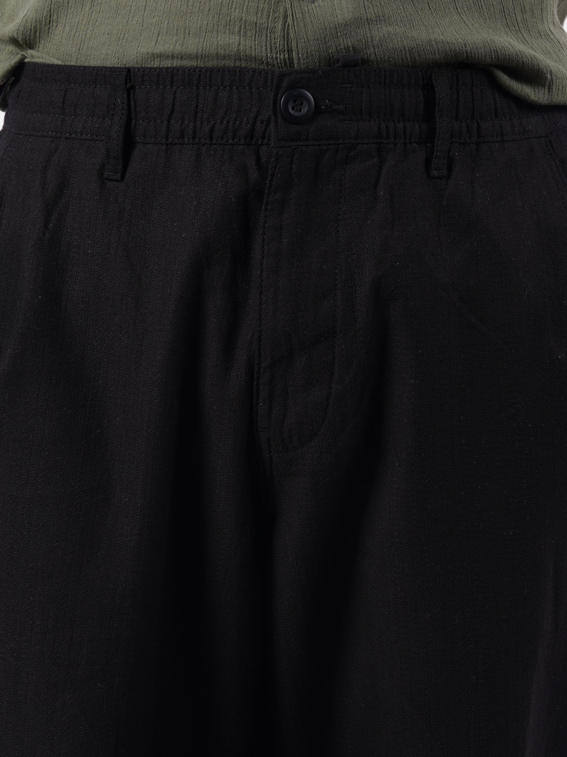 Stylish Celio men's trousers in black, crafted from a comfortable cotton-linen blend. Perfect for casual outings, these straight fit trousers add a sleek touch to your wardrobe. Disclaimer: All other items in the image are only for display purposes and will not be a part of the delivery content. Product colour may slightly vary due to photographic lighting sources. Country of Origin - India.
