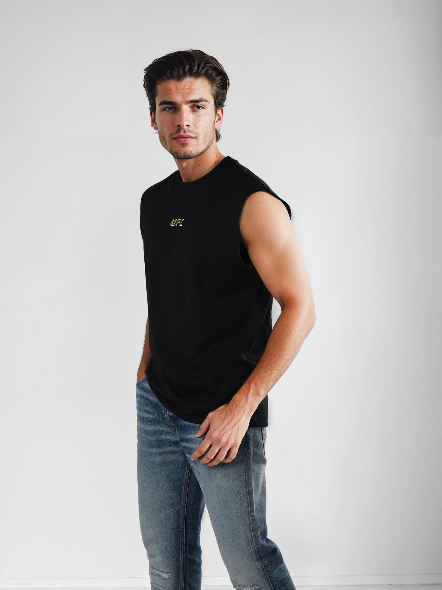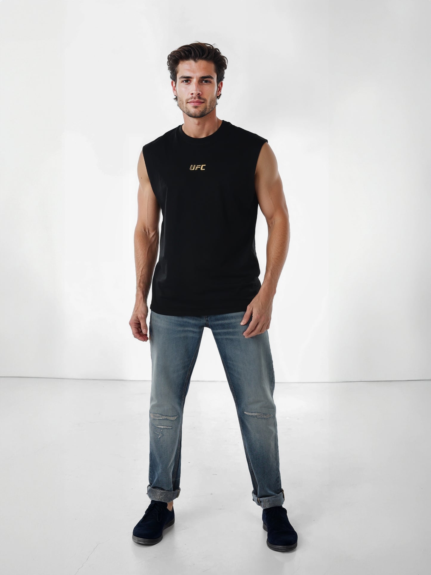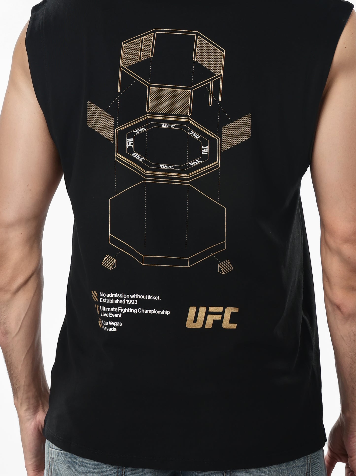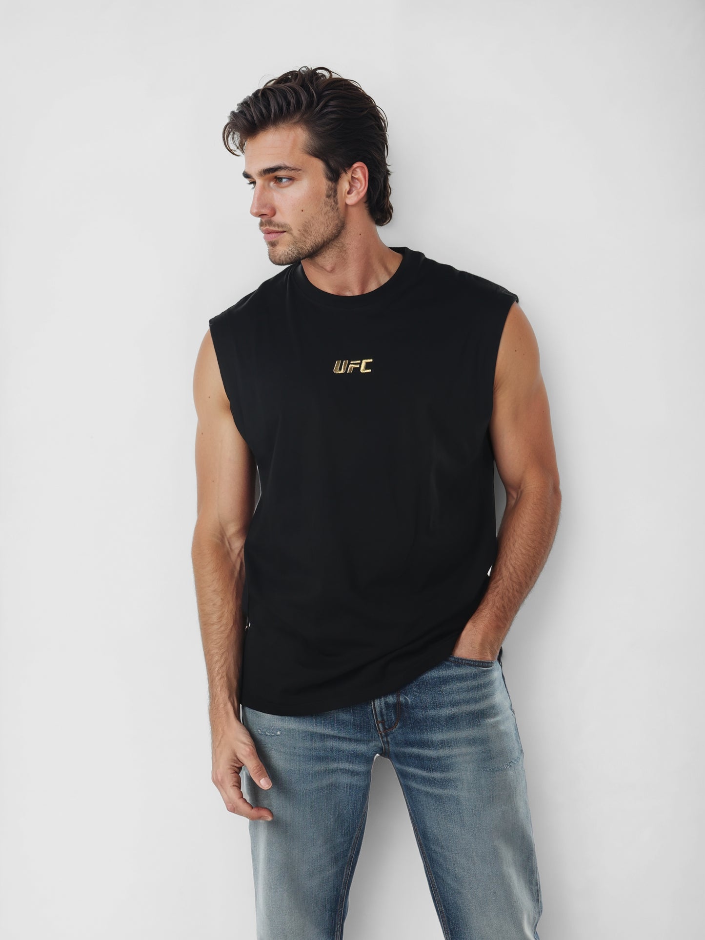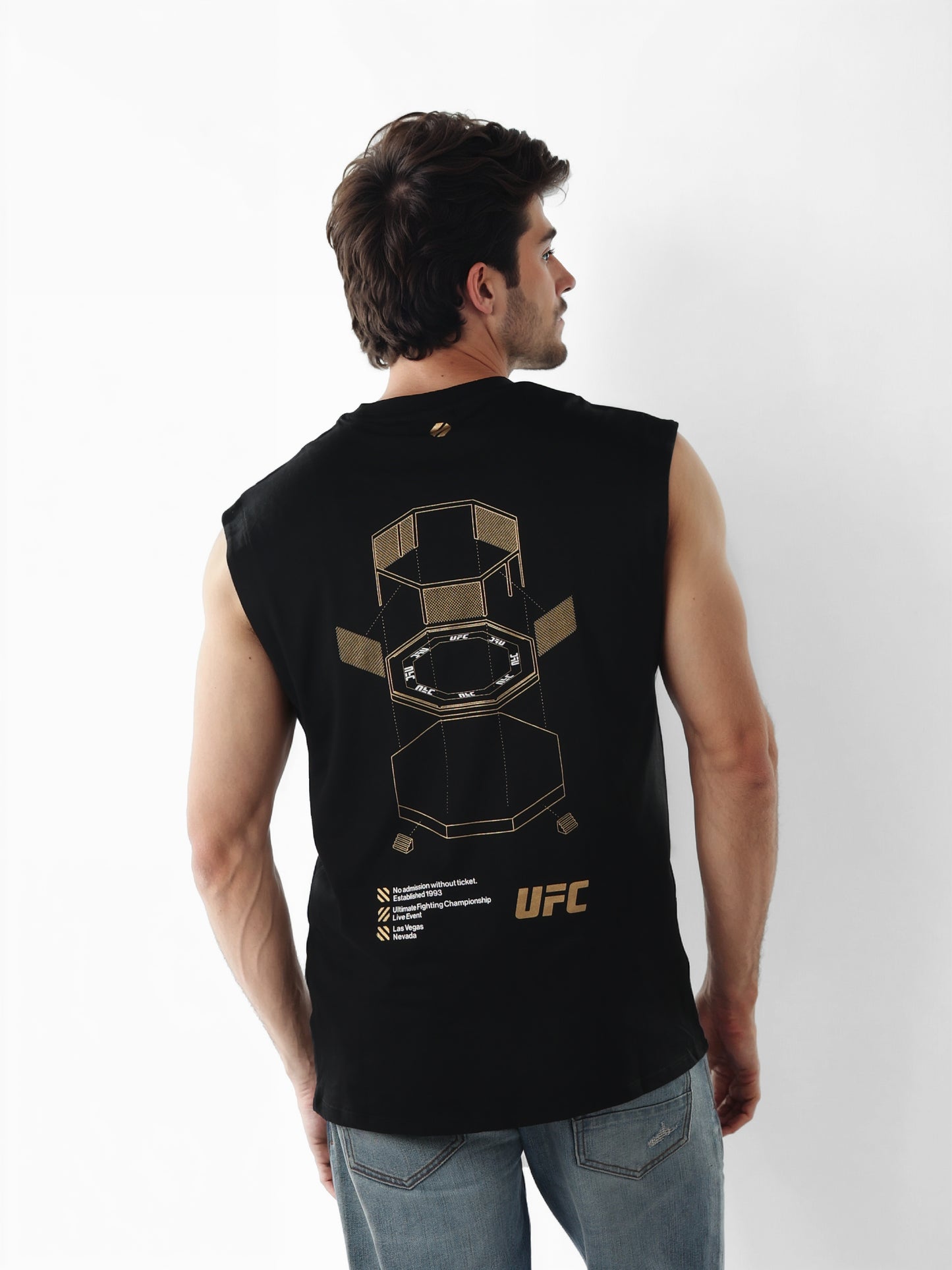 Elevate your casual style with the Celio Men Black Printed Oversized Cotton UFC T-shirt. This sleeveless tee offers comfort and a bold look, perfect for any laid-back occasion. Disclaimer: All other items in the image are only for display purposes and will not be a part of the delivery content. Product colour may slightly vary due to photographic lighting sources. Country of Origin - India. LJEUFCDEB2