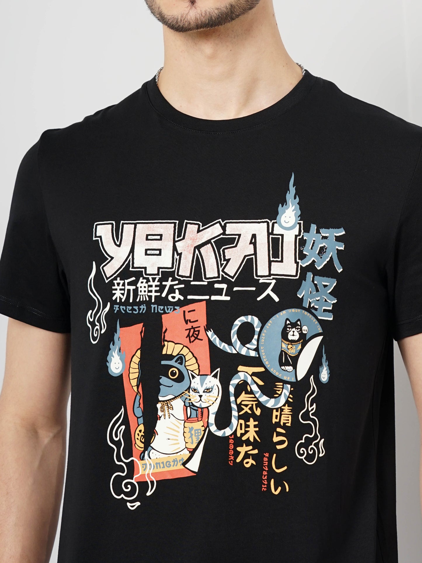 Shop the Celio Men's Black Cotton T-Shirt with a trendy chest print. Perfect for casual outings, this regular fit tee features short sleeves and a comfortable fabric. Disclaimer: All other items in the image are only for display purposes and will not be a part of the delivery content. Product colour may slightly vary due to photographic lighting sources. Country of Origin - India.