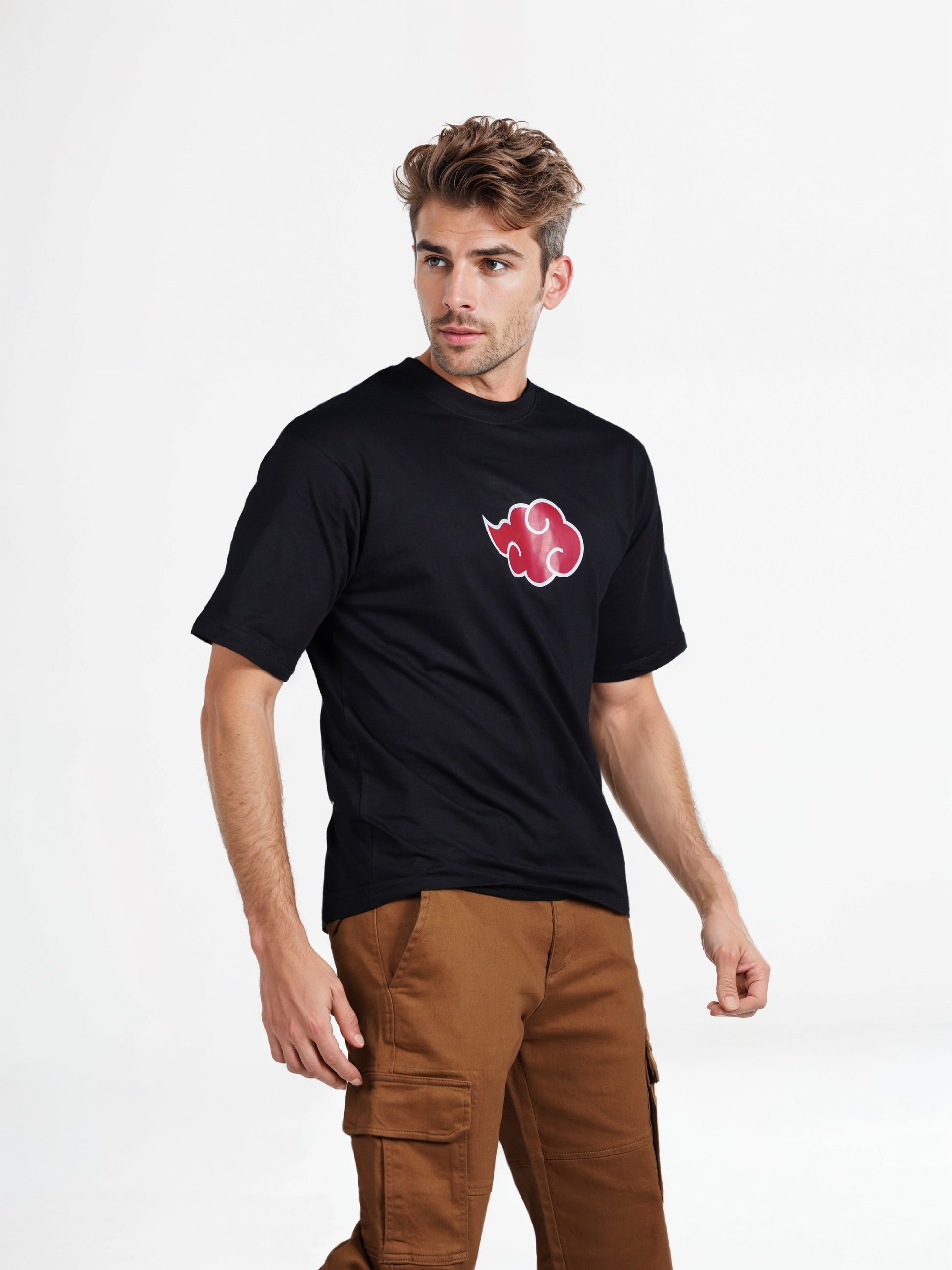 Experience casual comfort with the Celio Men Black Printed T-shirt featuring a Naruto design. This regular fit cotton tee is perfect for everyday wear with short sleeves. Disclaimer: All other items in the image are only for display purposes and will not be a part of the delivery content. Product colour may slightly vary due to photographic lighting sources. Country of Origin - India.