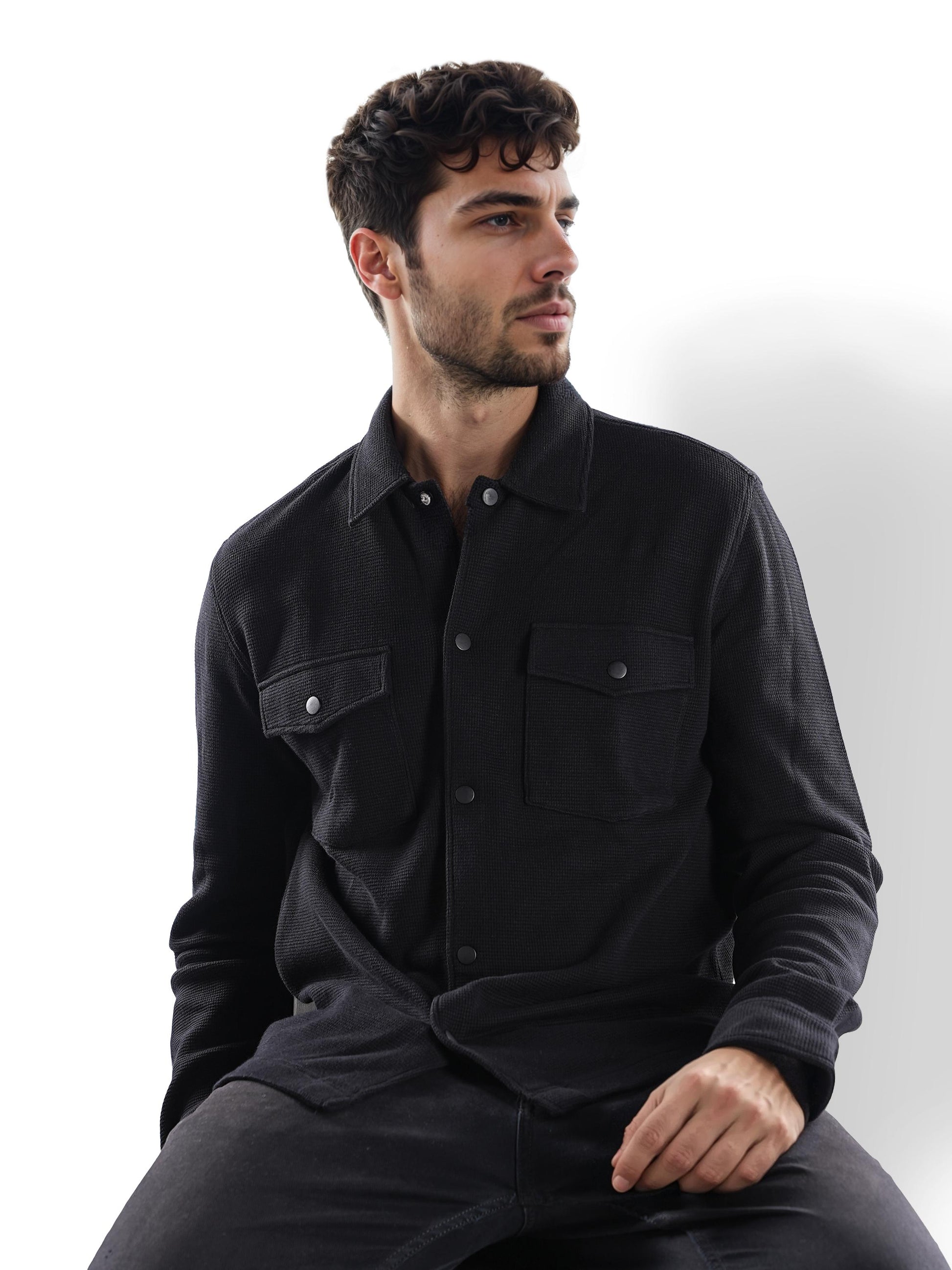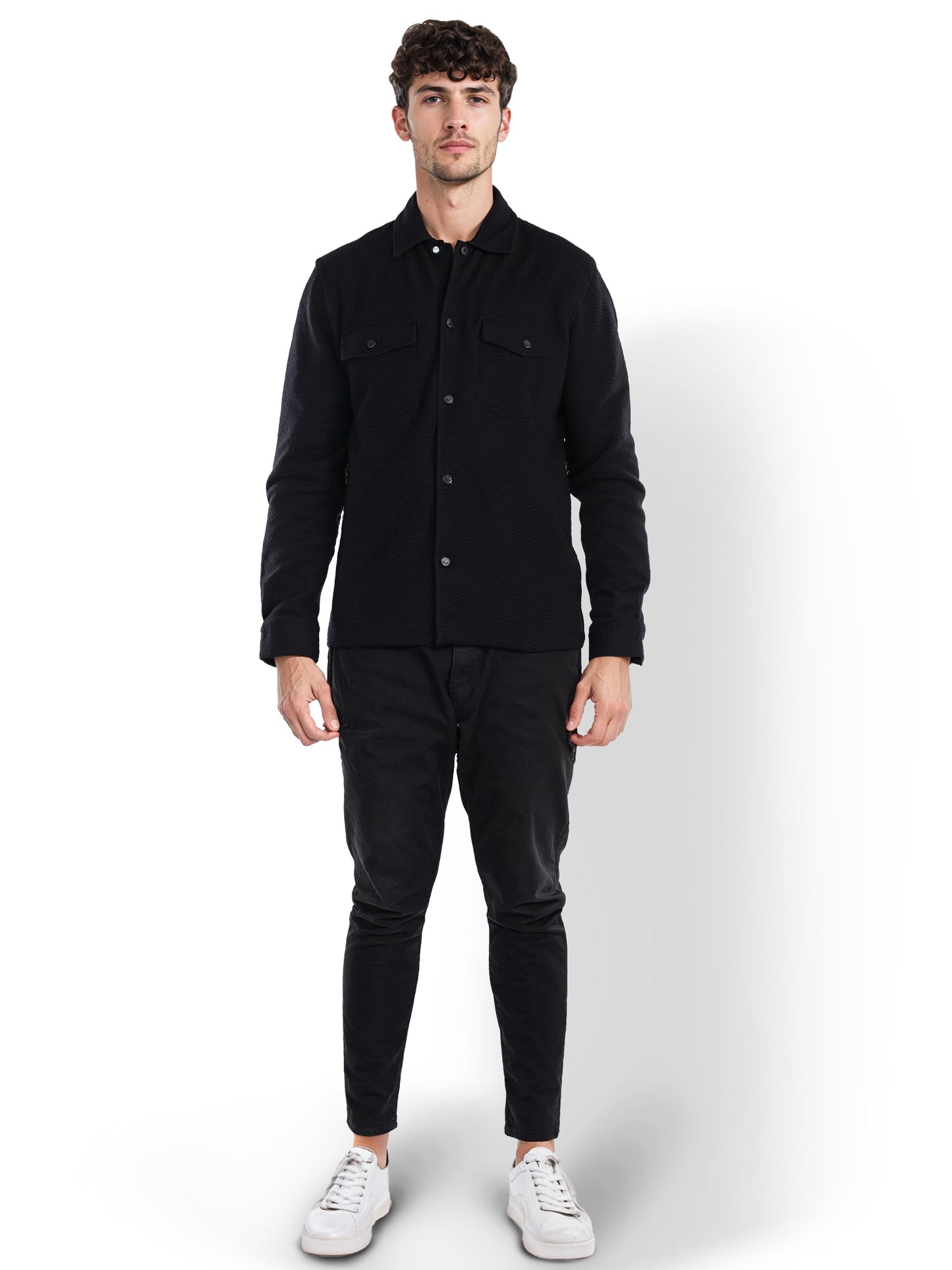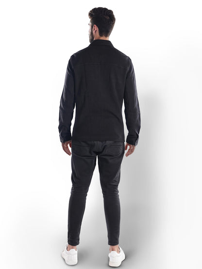 Men's oversized black cotton shirt by Celio featuring a spread collar, long sleeves, and designed for casual occasions. Disclaimer: All other items in the image are only for display purposes and will not be a part of the delivery content. Product colour may slightly vary due to photographic lighting sources. Country of Origin - India.