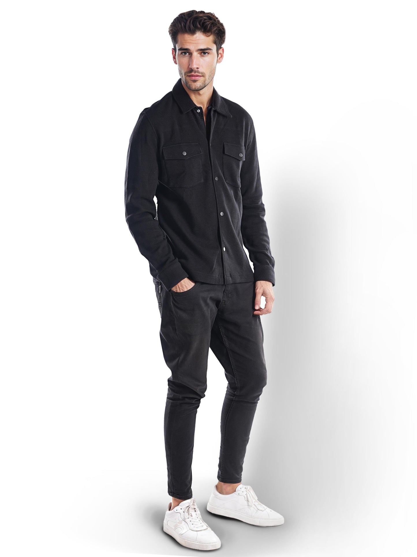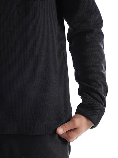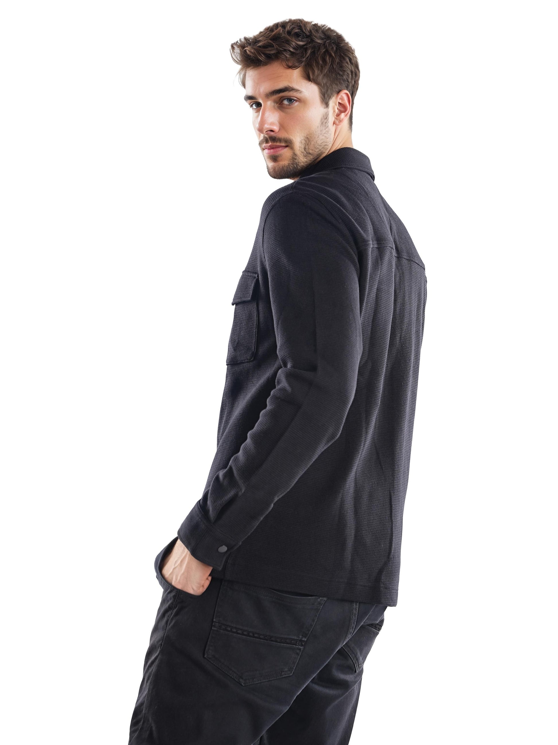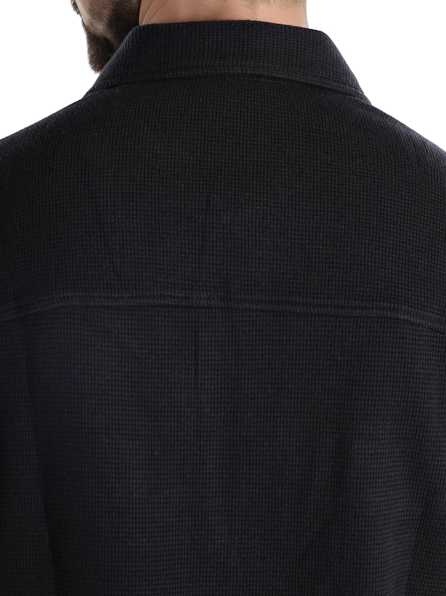 Men's oversized black cotton shirt by Celio featuring a spread collar, long sleeves, and designed for casual occasions. Disclaimer: All other items in the image are only for display purposes and will not be a part of the delivery content. Product colour may slightly vary due to photographic lighting sources. Country of Origin - India.