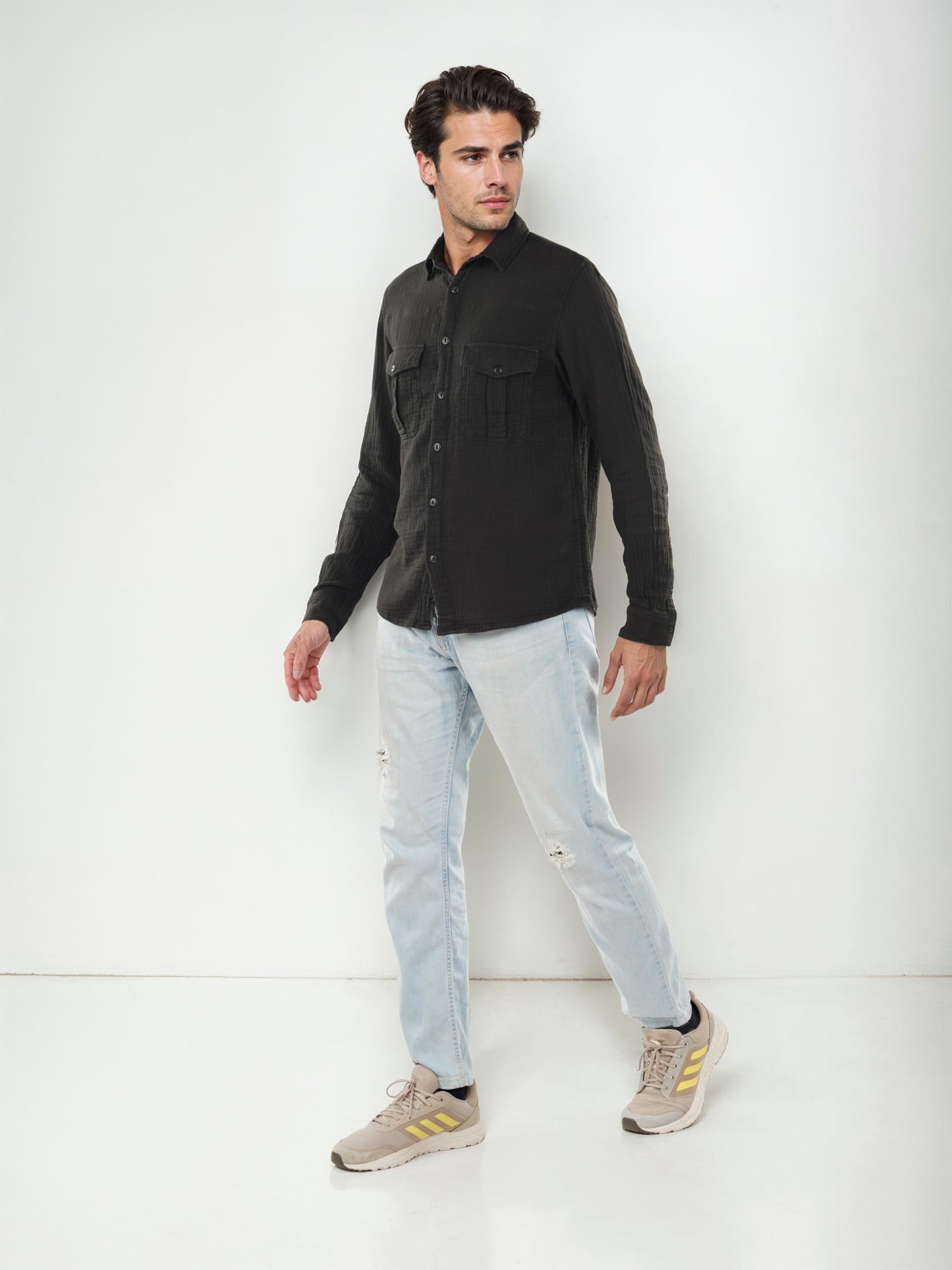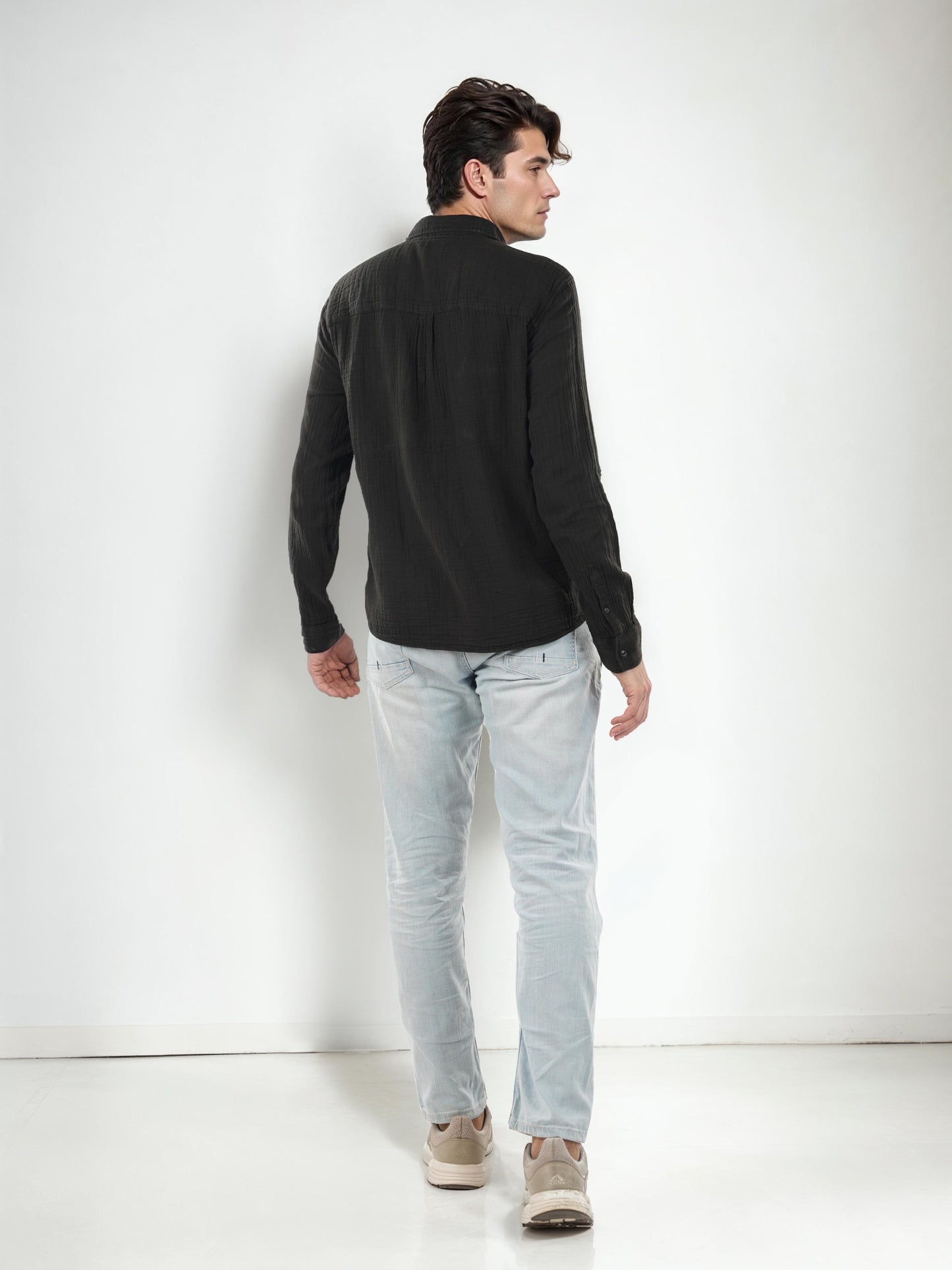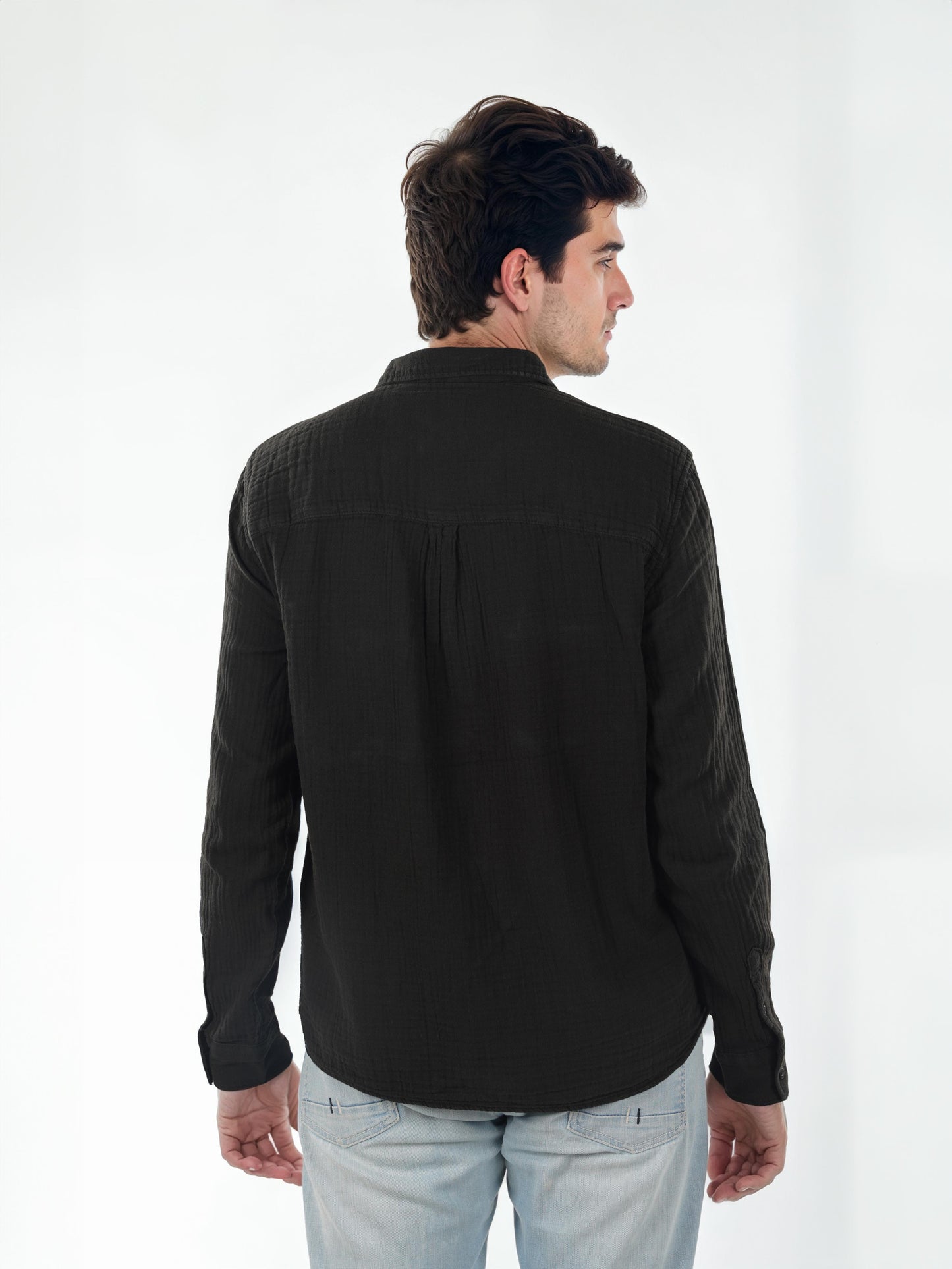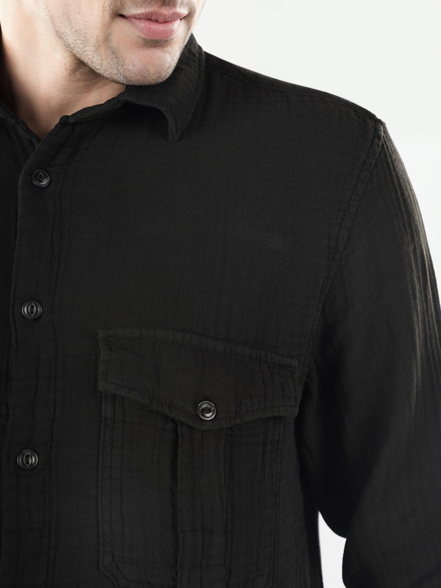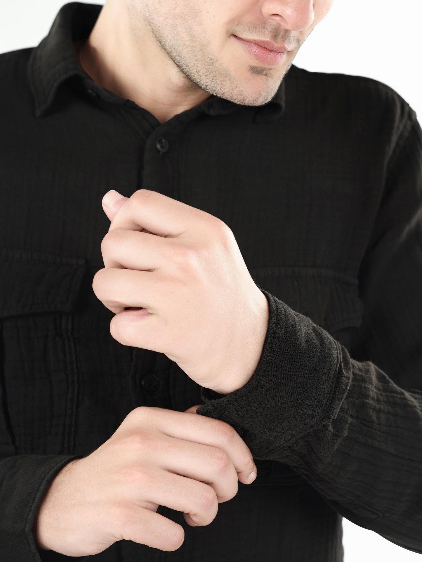 Stylish Men’s Black Spread Collar Shirt by Celio. Crafted from comfortable cotton, this regular fit shirt features long sleeves, making it perfect for casual occasions. Disclaimer: All other items in the image are only for display purposes and will not be a part of the delivery content. Product colour may slightly vary due to photographic lighting sources. Country of Origin - India.