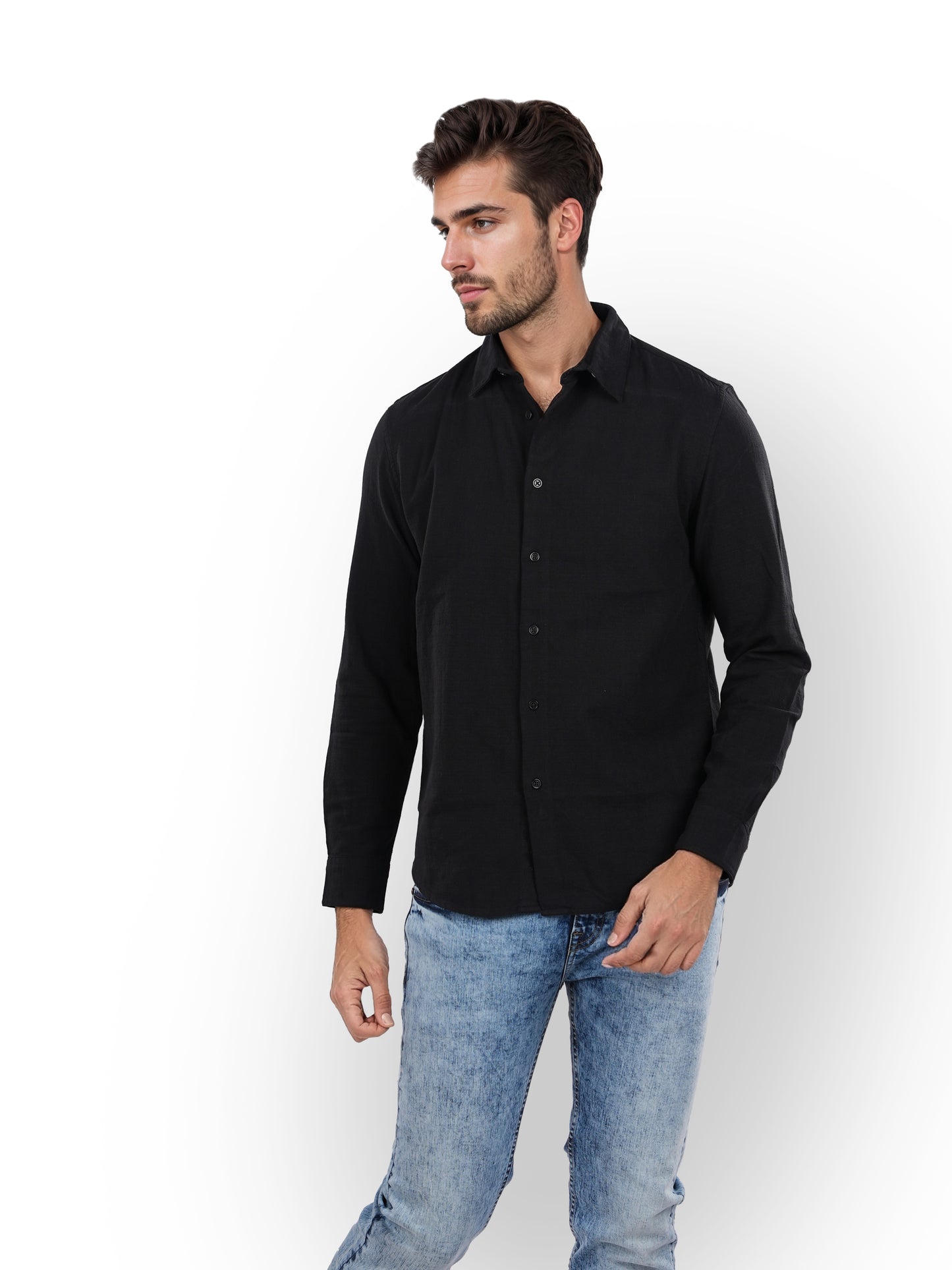 Elevate your casual wardrobe with Celio's black spread collar shirt. Crafted from soft cotton, it features long sleeves and a regular fit for comfort and style. Disclaimer: All other items in the image are only for display purposes and will not be a part of the delivery content. Product colour may slightly vary due to photographic lighting sources. Country of Origin - India.