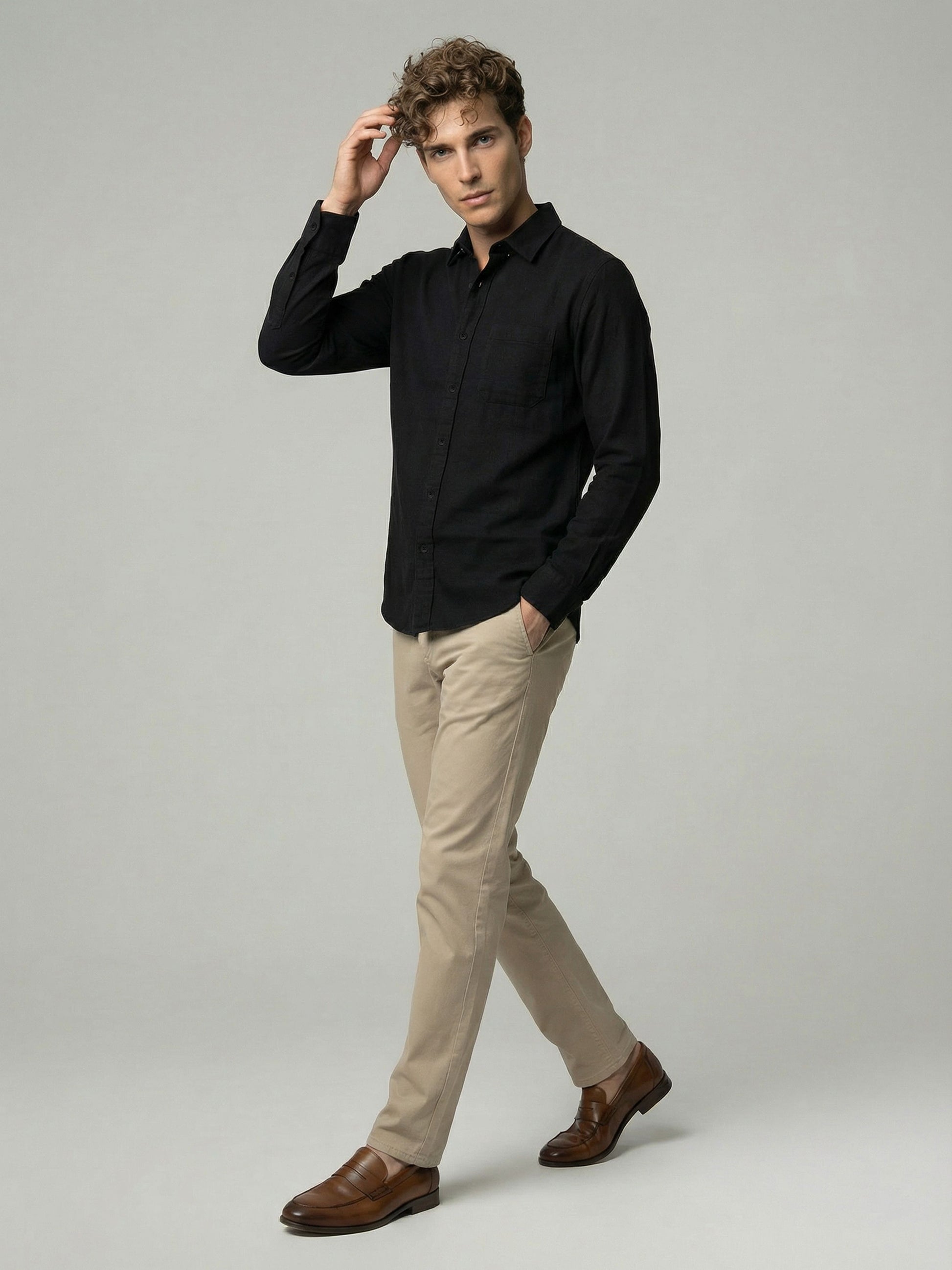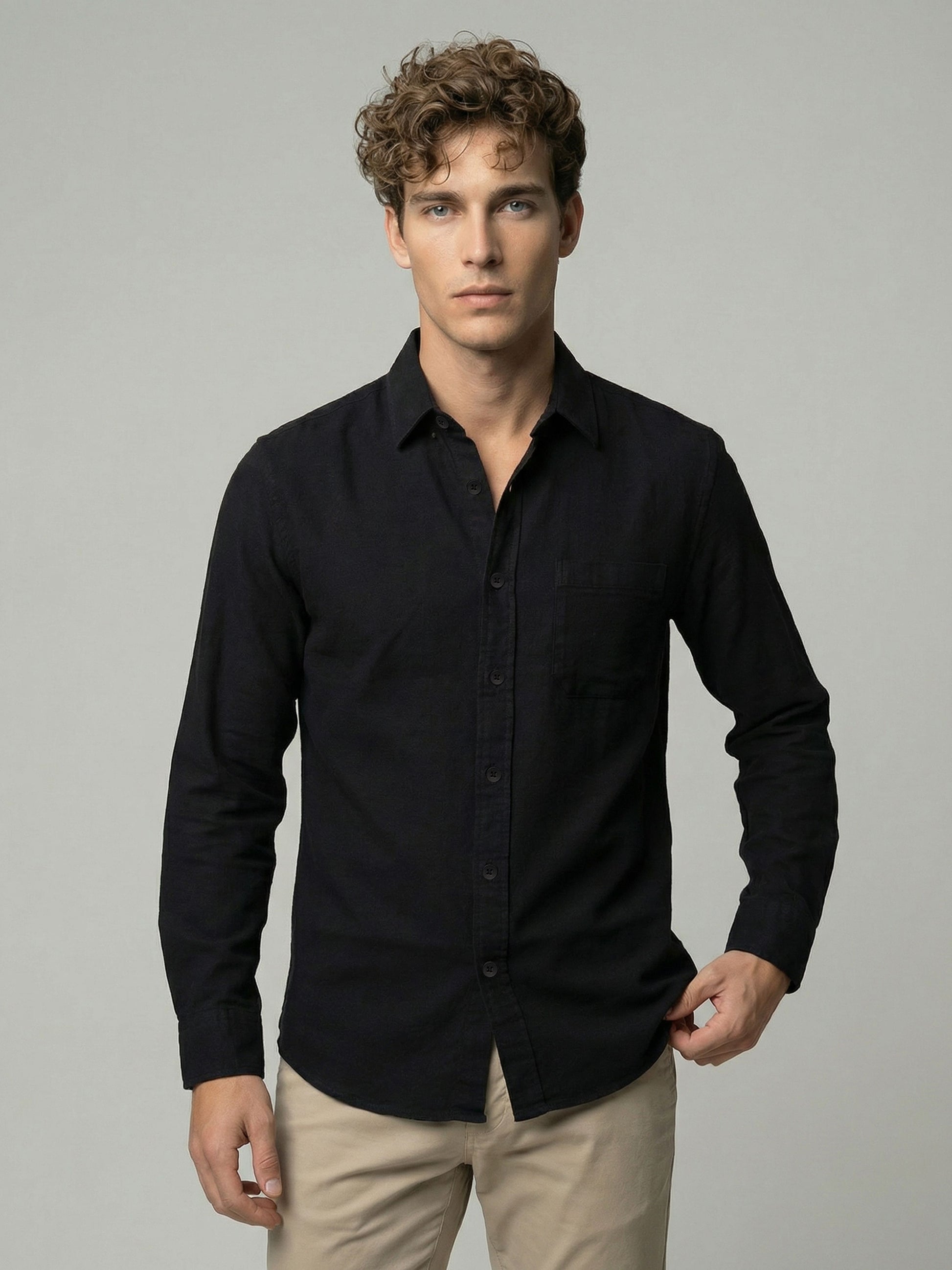 Elevate your casual wardrobe with this Celio men's black cotton shirt. Featuring long sleeves, it's perfect for relaxed outings and offers a solid, sophisticated look. Disclaimer: All other items in the image are only for display purposes and will not be a part of the delivery content. Product colour may slightly vary due to photographic lighting sources. Country of Origin - India.