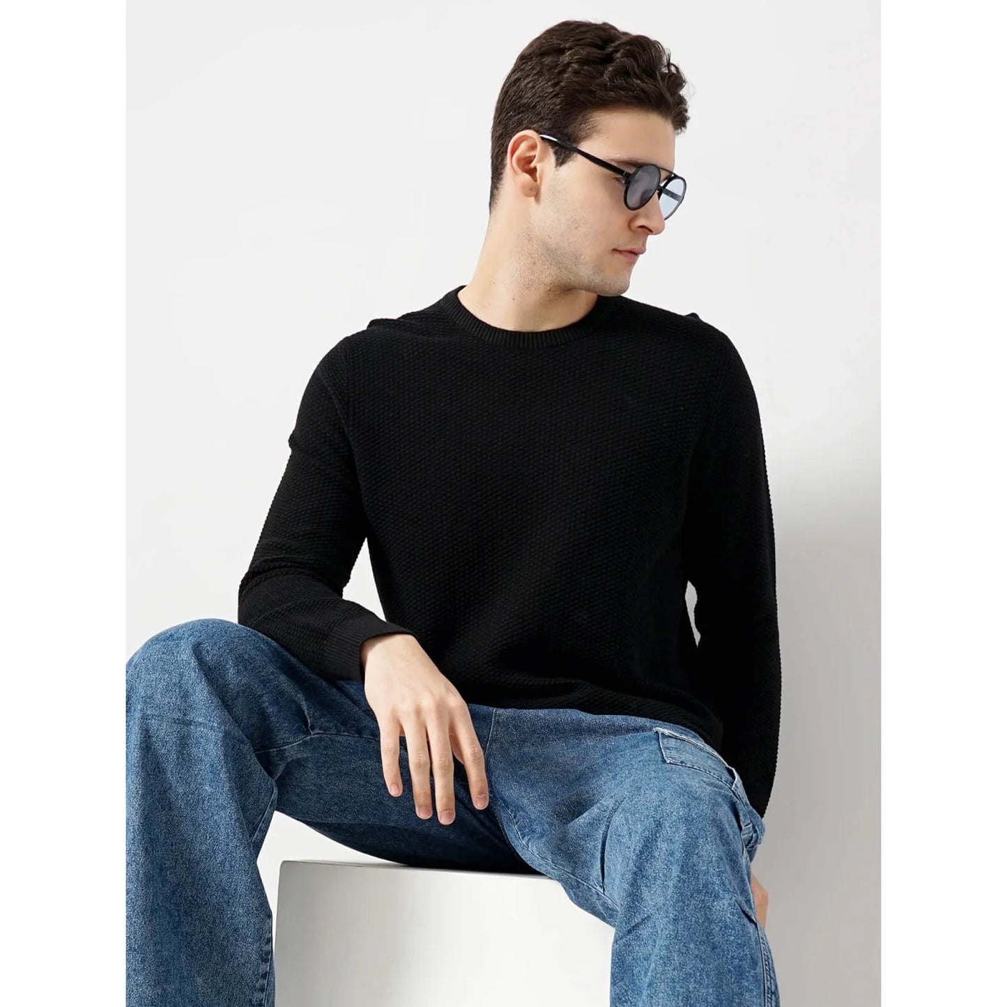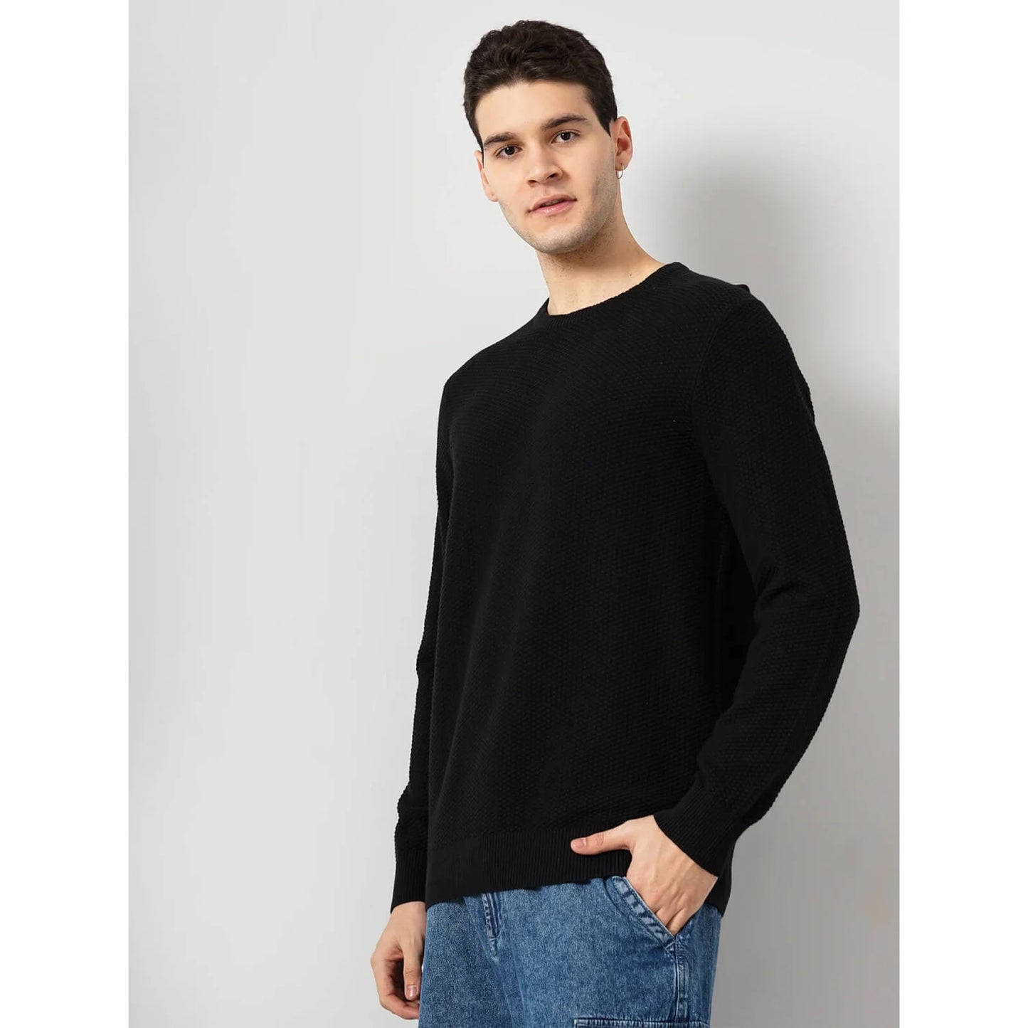 Elevate your casual wardrobe with the Celio Cotton Black Solid Sweater in Fenode Black. Made from soft cotton, this long-sleeved sweater is perfect for men seeking comfort and style. Disclaimer: All other items in the image are only for display purposes and will not be a part of the delivery content. Product colour may slightly vary due to photographic lighting sources. Country of Origin - India.