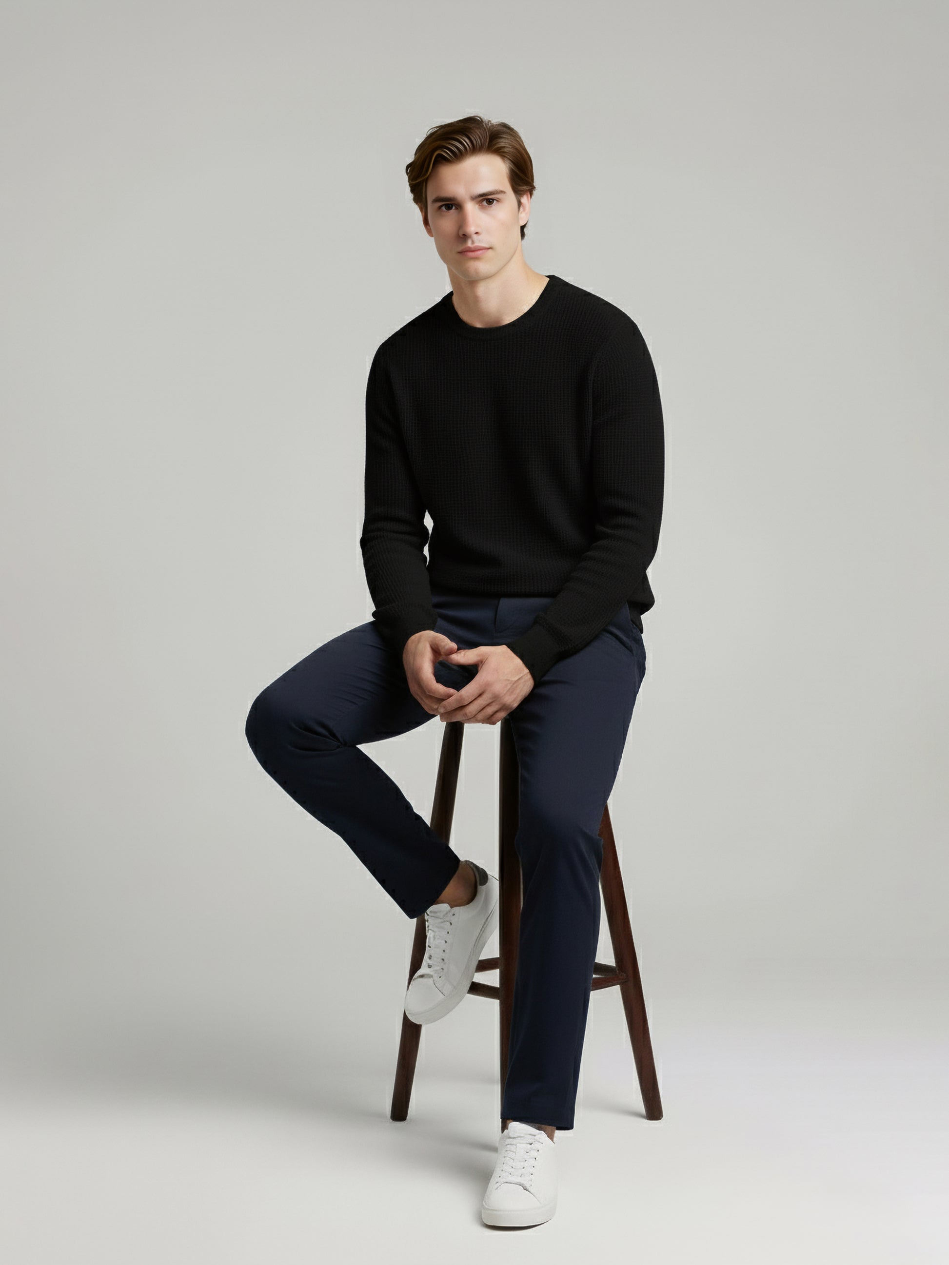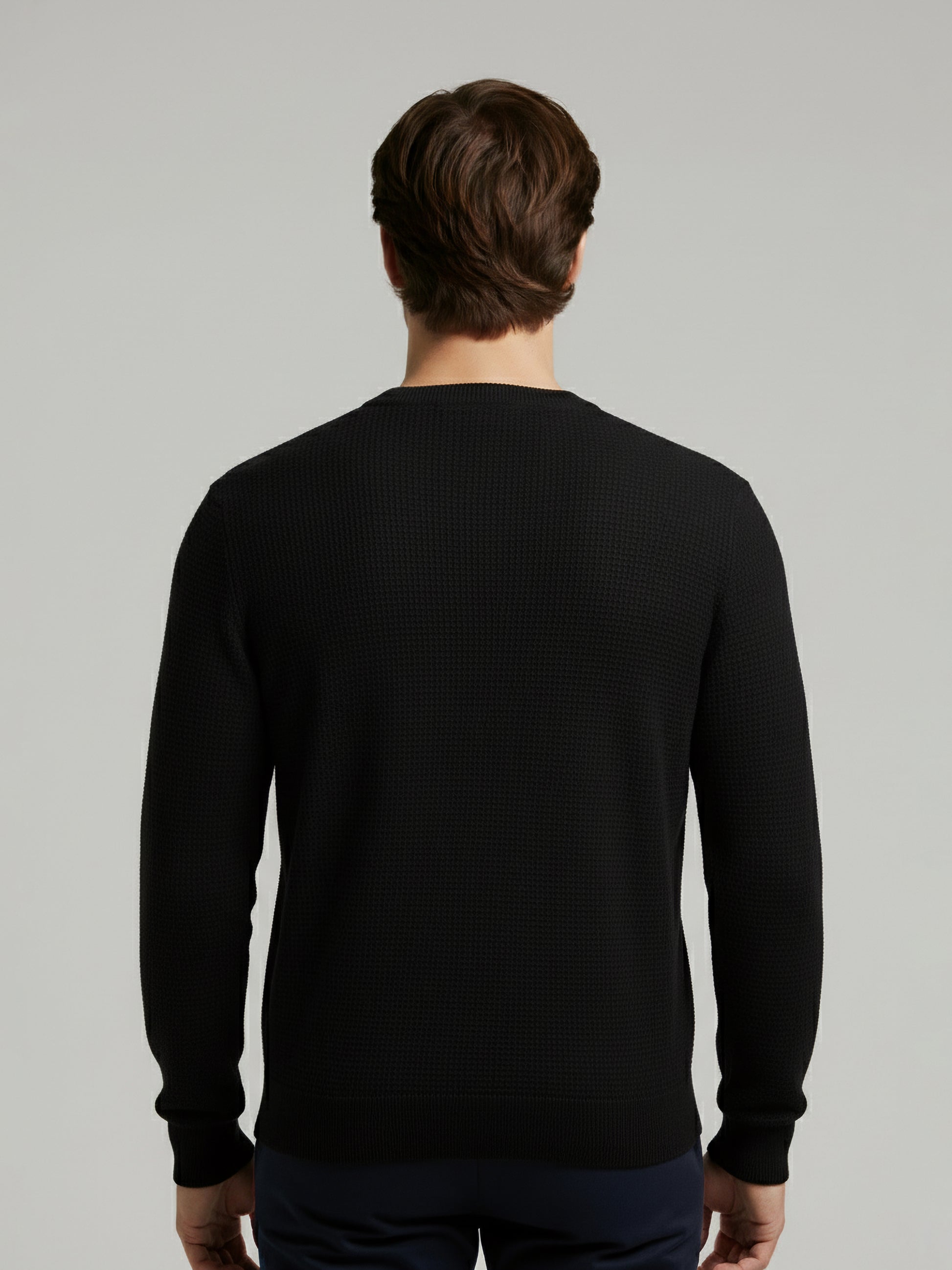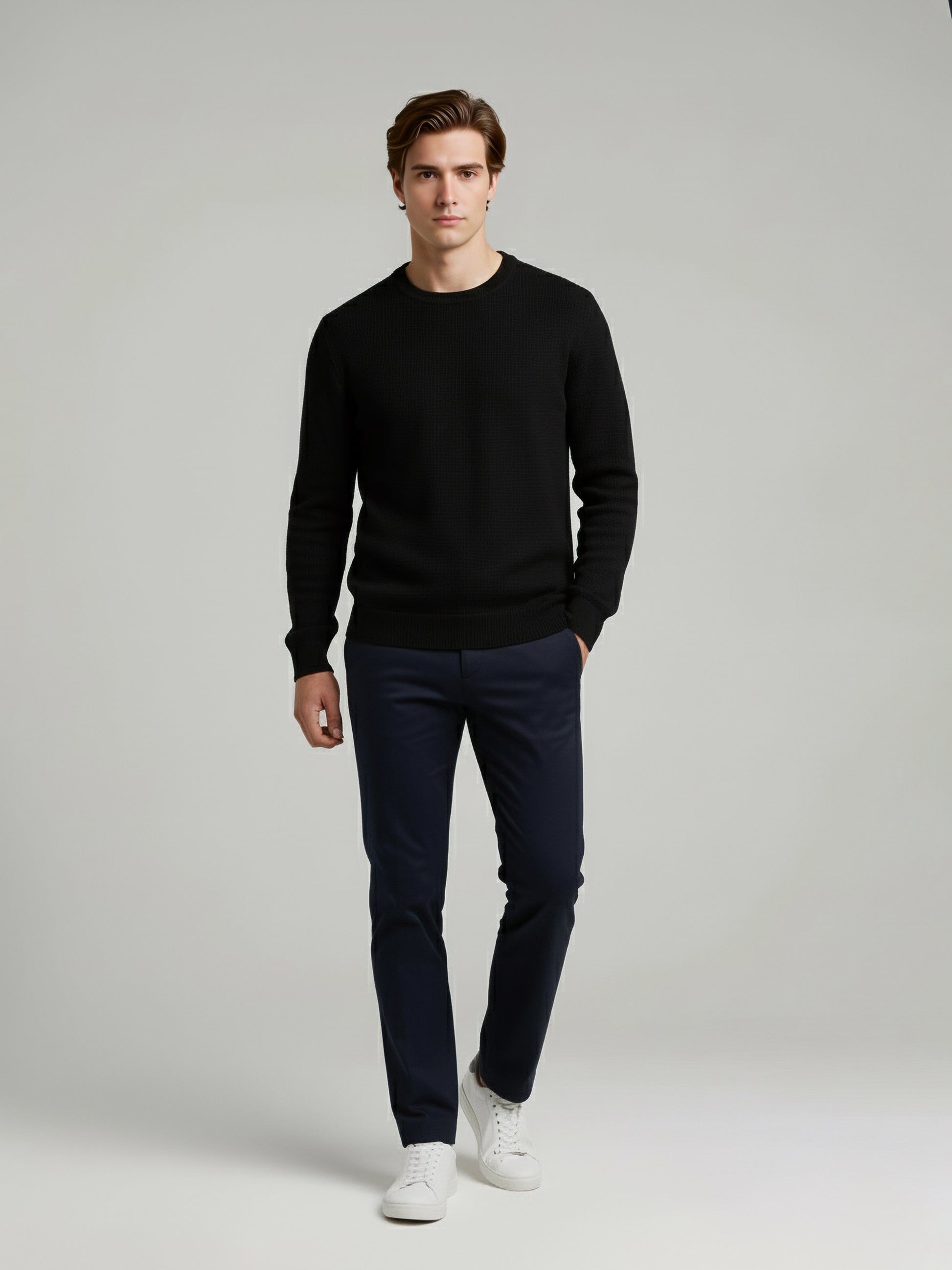 Discover the Celio Men Black Solid Sweater, crafted from soft cotton. This casual piece features long sleeves and a regular fit, perfect for everyday wear. Disclaimer: All other items in the image are only for display purposes and will not be a part of the delivery content. Product colour may slightly vary due to photographic lighting sources. Country of Origin - India.