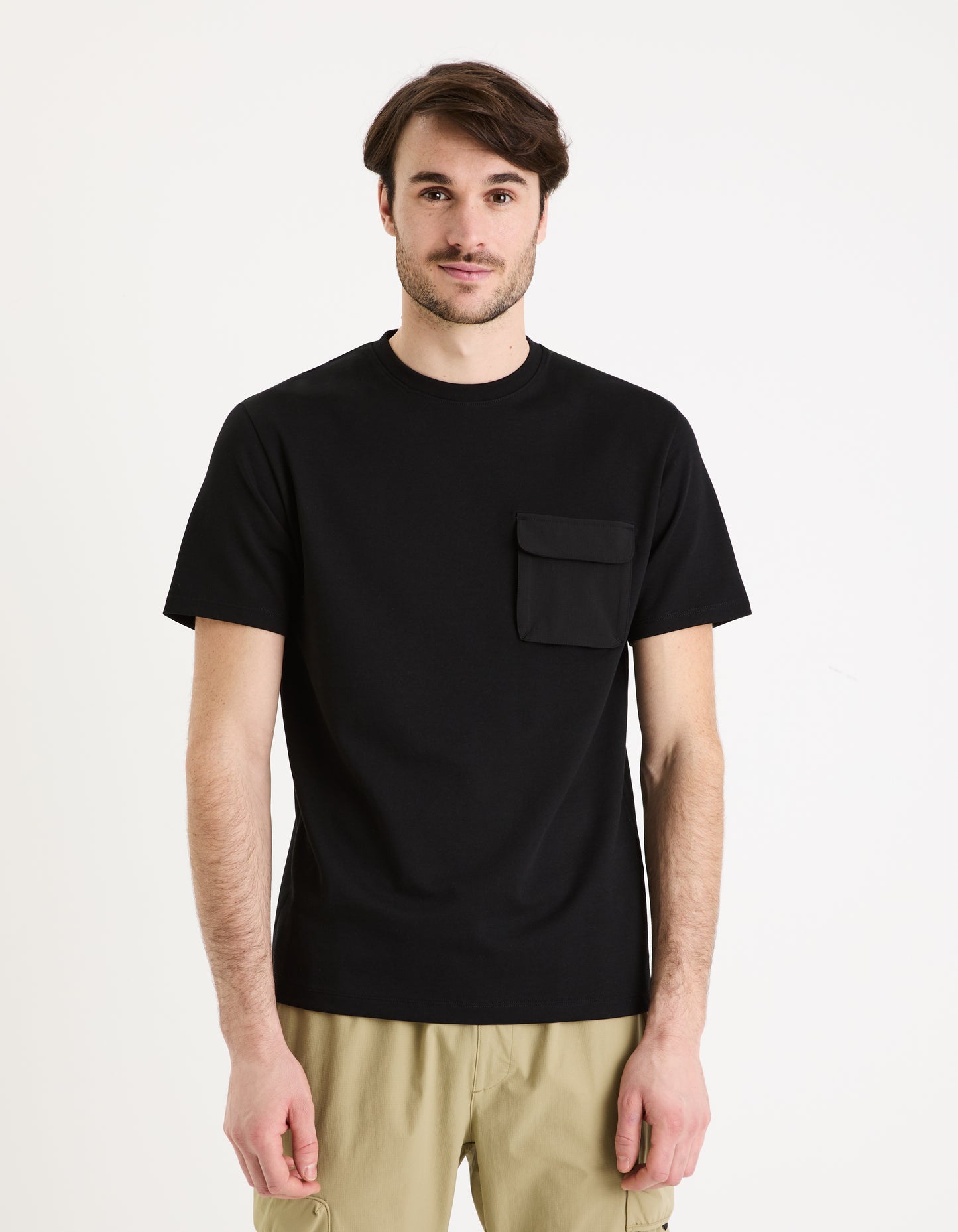 Discover comfort in this Celio Men's Black Round Neck T-shirt. Crafted from soft cotton, it features short sleeves and a regular fit, perfect for casual occasions. Disclaimer: All other items in the image are only for display purposes and will not be a part of the delivery content. Product colour may slightly vary due to photographic lighting sources. Country of Origin - India.
