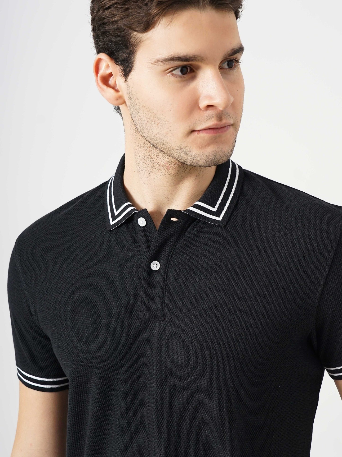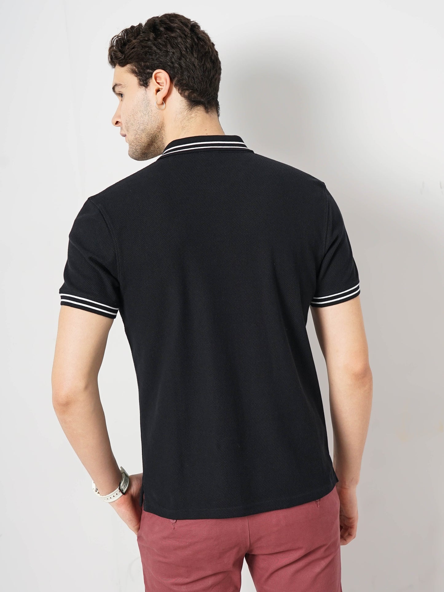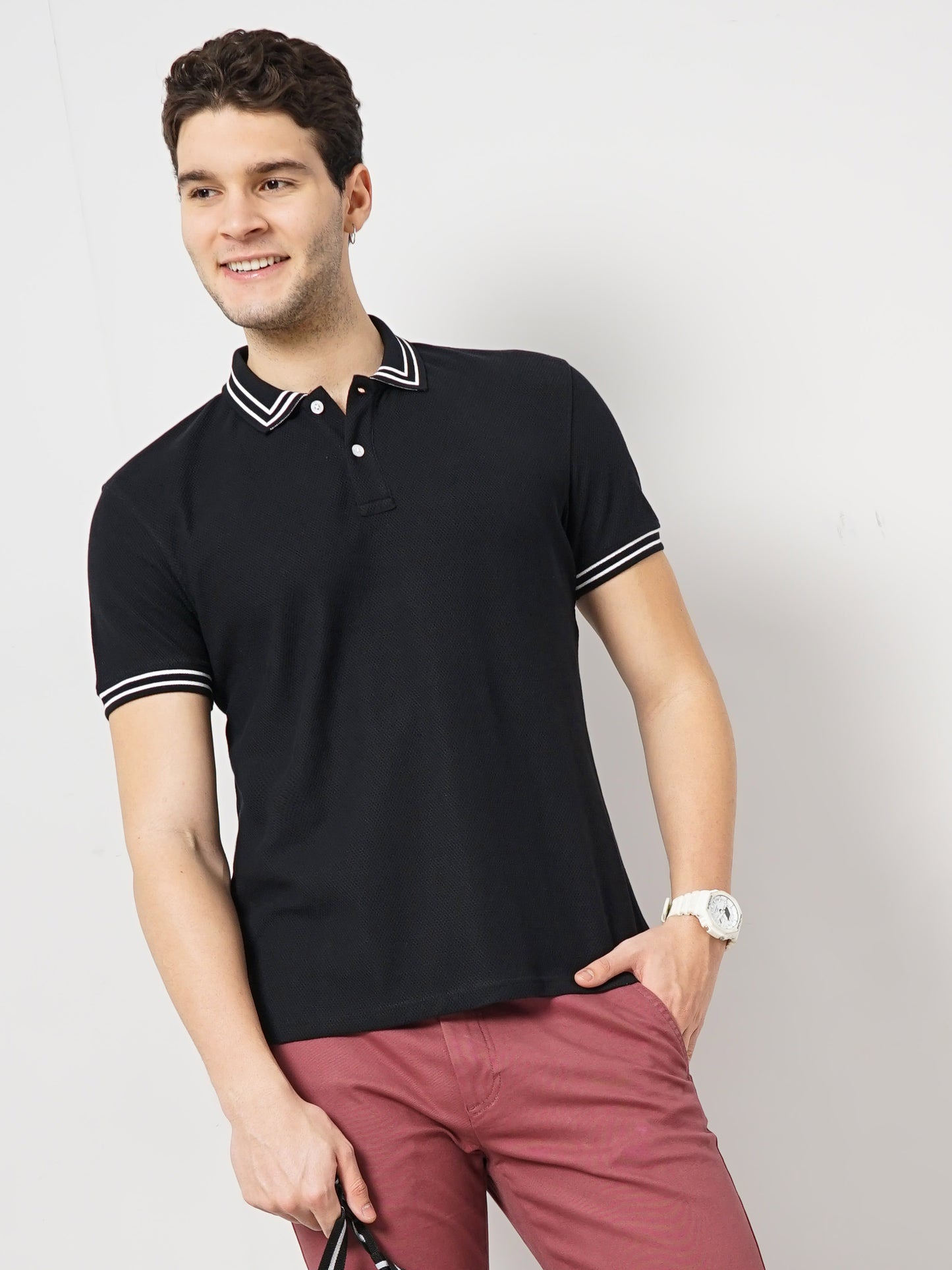 Men's solid black polo t-shirt by Celio, crafted from soft cotton. Perfect for casual occasions with a regular fit and short sleeves for a trendy look. Disclaimer: All other items in the image are only for display purposes and will not be a part of the delivery content. Product colour may slightly vary due to photographic lighting sources. Country of Origin - India.