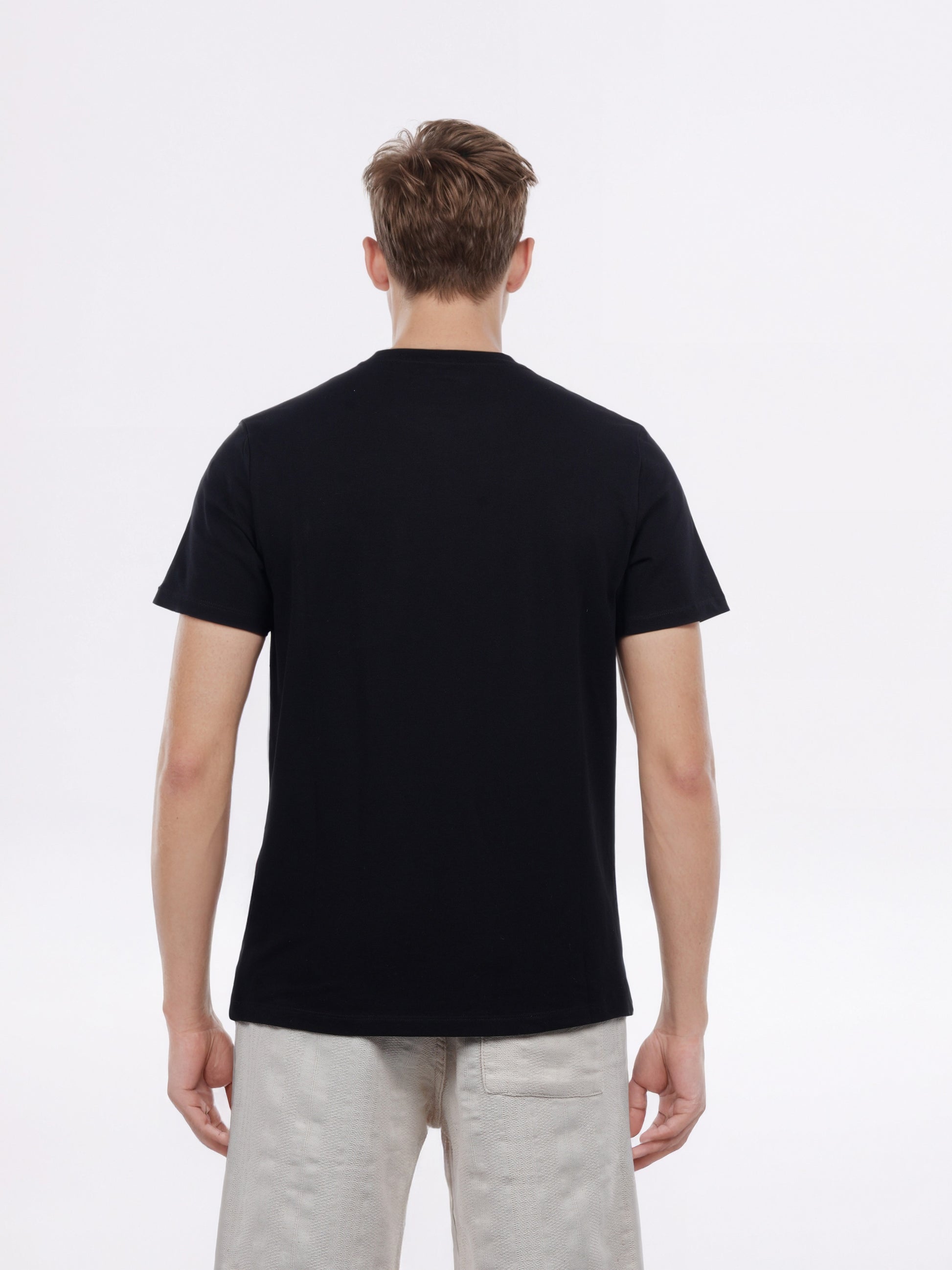 Explore comfort with the Celio Men Black Solid Regular Fit T-shirt. Crafted from soft cotton, this casual tee features short sleeves and a versatile design, perfect for everyday wear. Disclaimer: All other items in the image are only for display purposes and will not be a part of the delivery content. Product colour may slightly vary due to photographic lighting sources. Country of Origin - India.